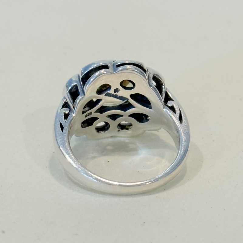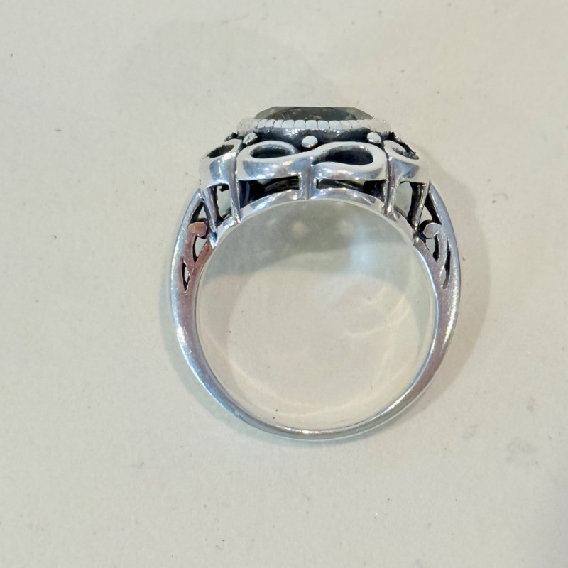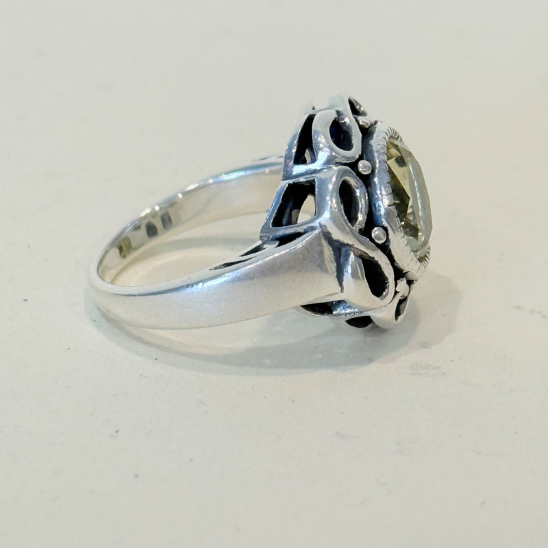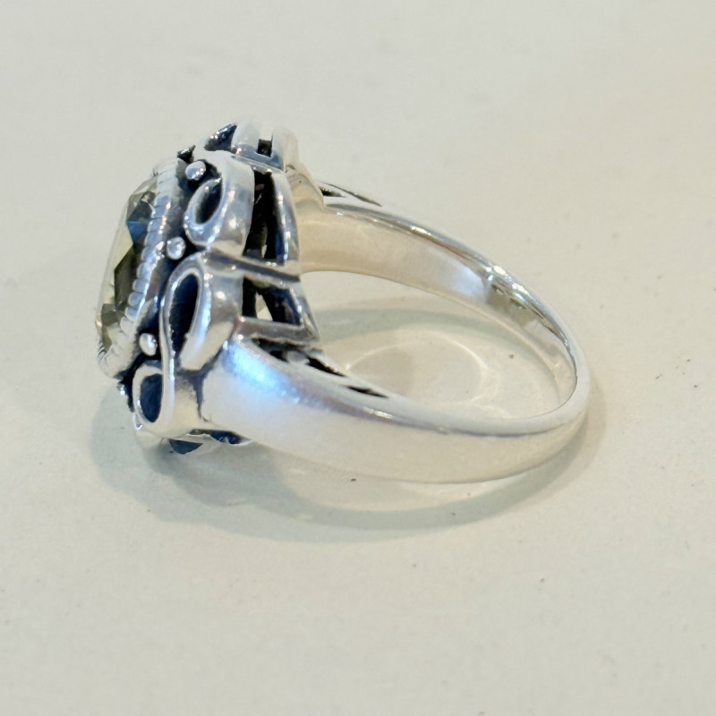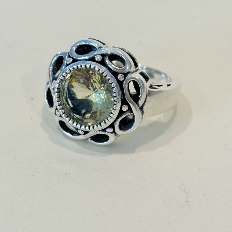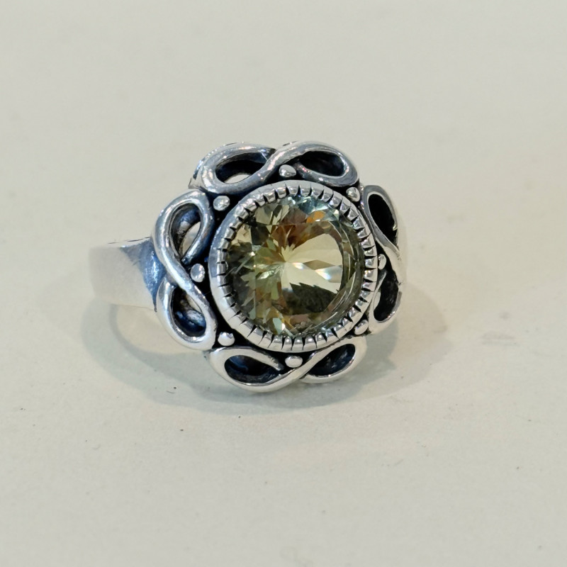 Verdant Whirl: Thai Sterling Ring with Faceted Green Amethyst and Scrollwork Bezel Artisan-crafted sterling silver ring featuring a faceted round green amethyst (also known as prasiolite), bezel-set in an ornate frame of oxidized scrollwork and teardrop cutouts. The decorative gallery is accented with beaded detailing and blackened silver for dramatic contrast. The polished band tapers gently at the shoulders. Stamped 925 Thailand. Size 7. Total weight: 9.7 grams. Material: Sterling silver (.925), green amethyst (prasiolite) Size: 7 Weight: 9.7 grams Design: Round faceted prasiolite in oxidized scroll bezel with teardrop accents Markings: Stamped 925 Thailand