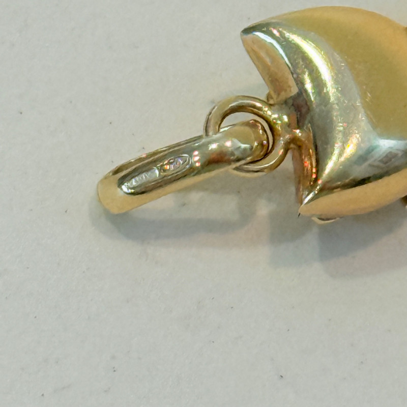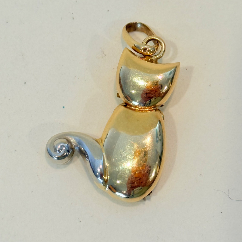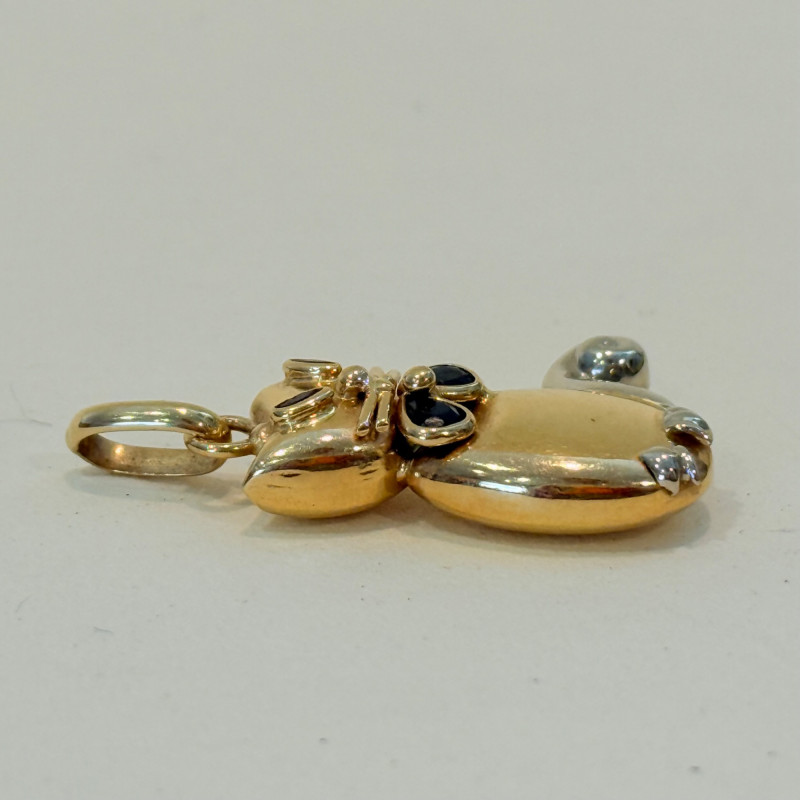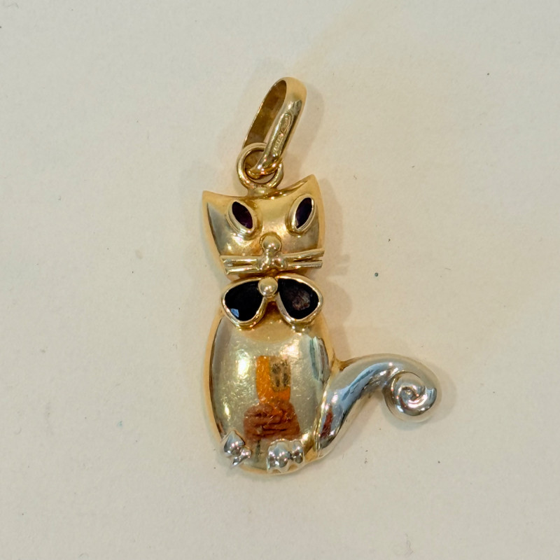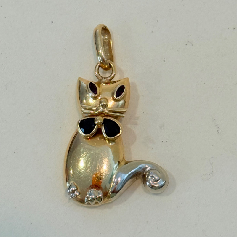 Gilded Gaze: Italian Figural Cat Pendant with Gemstone Accents Whimsical vintage cat pendant crafted in 18K yellow gold, featuring a stylized feline with ruby eyes, a sapphire bow, and a curled silver-colored tail. The body is smooth and reflective, with playful proportions and polished charm. Measures approx. 1 inch tall, weighs 4.7 grams. Stamped 750 with an additional maker’s mark. Material: 18K yellow gold (stamped 750), ruby, sapphire, silver-tone accent Dimensions: 1" tall Weight: 4.7 grams Design: Stylized cat with gemstone eyes and bow, curled tail Markings: Stamped 750 and partial maker’s mark