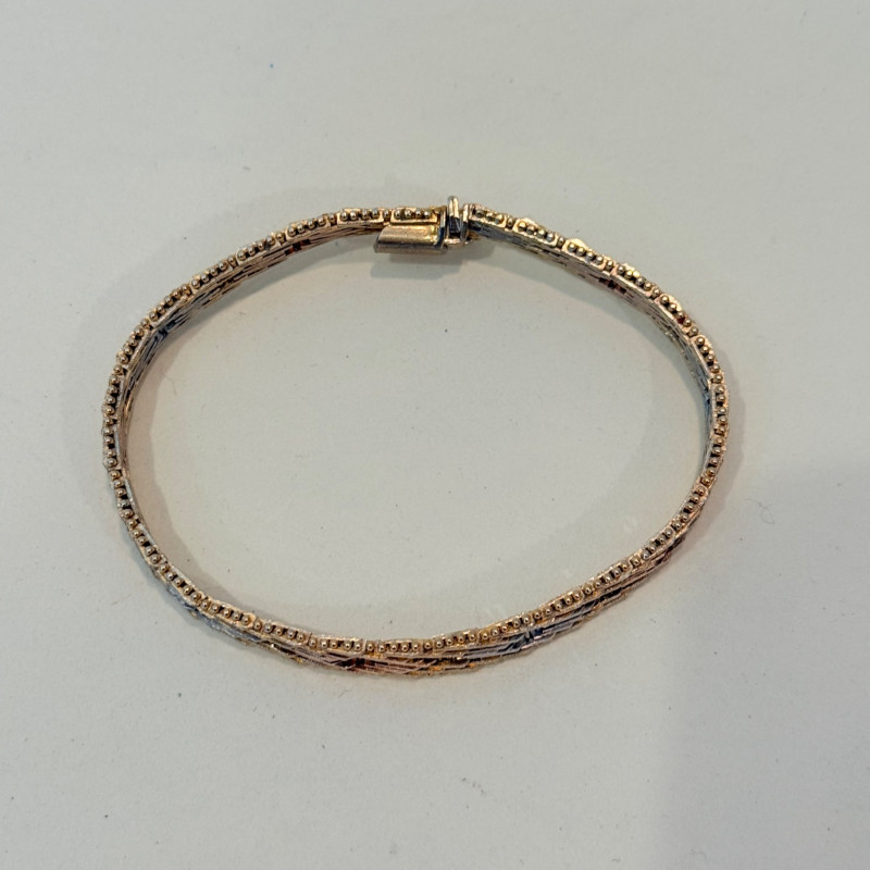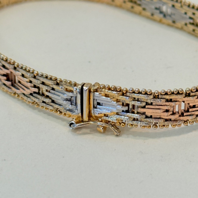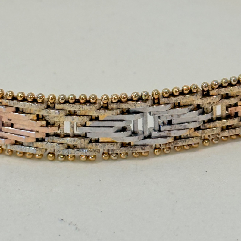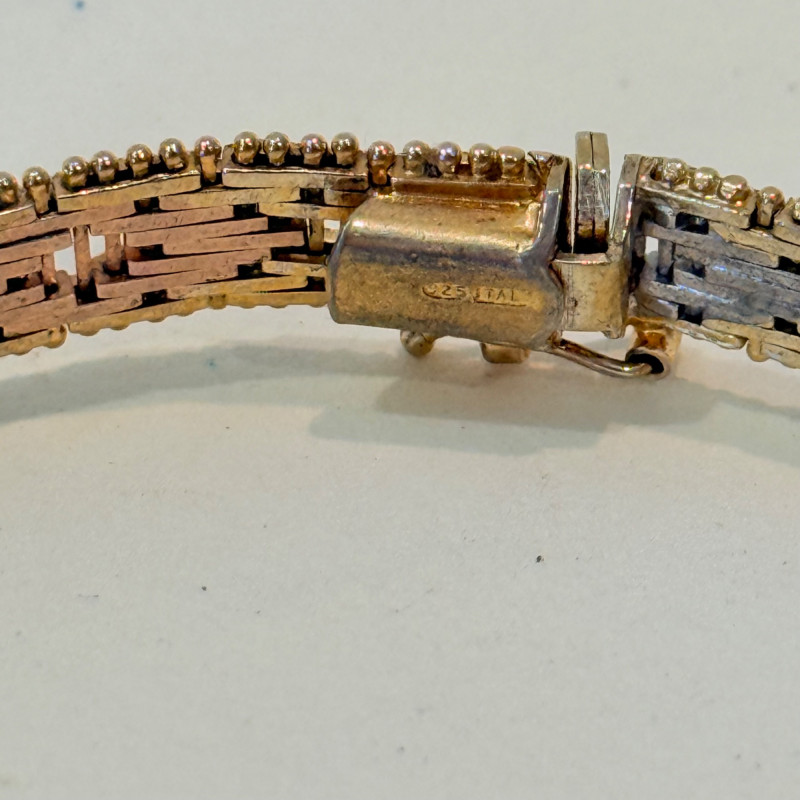 Striking Italian-made bracelet crafted in sterling silver (.925) with a tri-color finish—rose, yellow, and white tones woven into a repeating chevron and bar pattern. The design is framed by beaded borders and finished with a secure box clasp. Measures approx. 7.5 inches long × 8mm wide. Marked .925 Italy. Material: Sterling silver (.925), tri-color finish Length: 7.5 inches Width: 8mm Weight: 17.9 grams Design: Chevron and bar motif with beaded edge in rose, yellow, and white tones Markings: Stamped .925 Italy