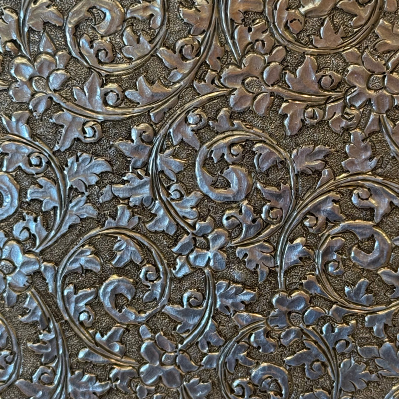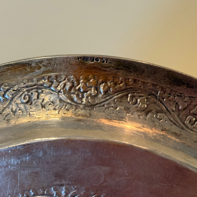 Striking decorative plate crafted in Pakistani silver, featuring intricate hand-engraved floral and vine motifs across the center and rim. Measures 8.25 inches in diameter and weighs 9.8 ounces (approx. 278 grams). The design showcases traditional South Asian scrollwork, with a repeating border and dense arabesque patterning. Unmarked, but consistent with mid-20th century artisan silverwork from Lahore or Karachi. Material: Likely high-grade silver alloy (unmarked) Diameter: 8.25 inches Weight: 9.8 oz / approx. 278 grams Design: Hand-engraved floral scrolls with ornate border Origin: Pakistan (likely Lahore or Karachi artisan work) Style Note: A richly detailed piece—ideal for display, gifting, or collectors of South Asian decorative arts