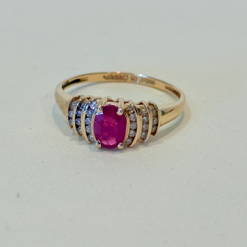 Crimson Crown: 14K Gold Ruby Ring with Diamond-Set Shoulders Elegant 14K yellow gold ring featuring a vibrant oval-cut ruby flanked by ten round brilliant-cut diamonds set in graduated channels along the shoulders. The ruby is prong-set and richly saturated, offering bold contrast against the sparkle of the diamonds and warm gold band. Ring size: 9. Total weight: 2.9 grams. Stamped 14K inside band. Material: 14K yellow gold, stamped Gemstones: Oval ruby (approx. 0.75 ct), 10 round diamonds (approx. 0.10 ct total) Size: 9 Weight: 2.9 grams Design: Prong-set ruby with channel-set diamond shoulders Markings: Stamped 14K