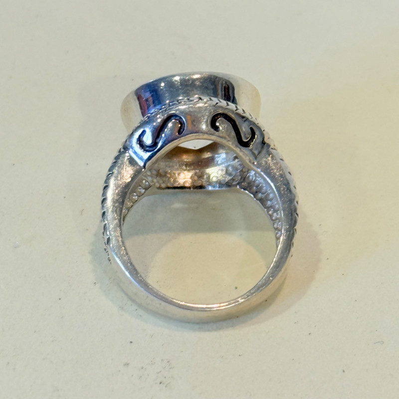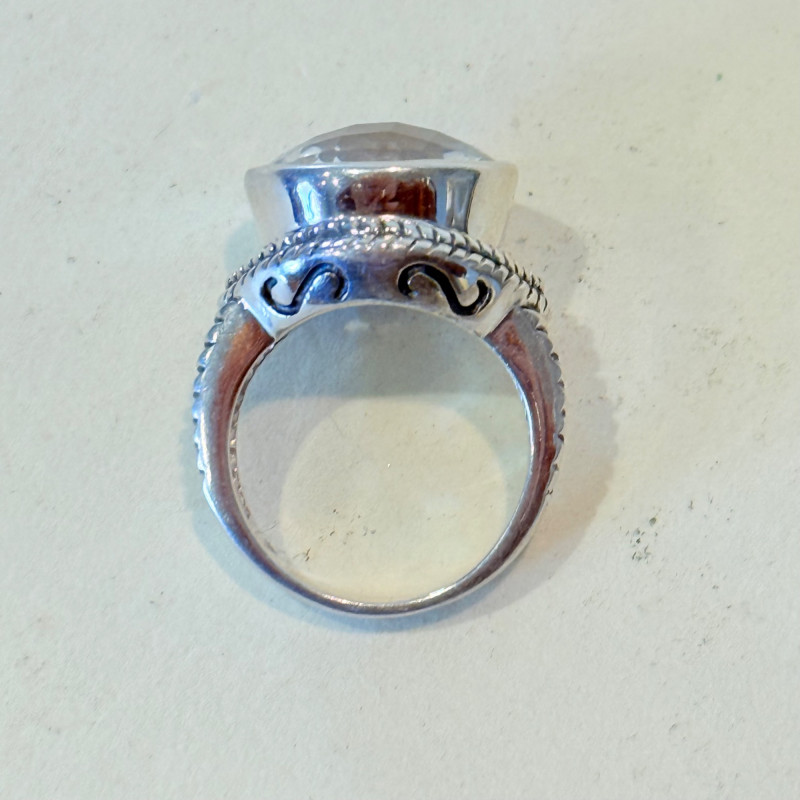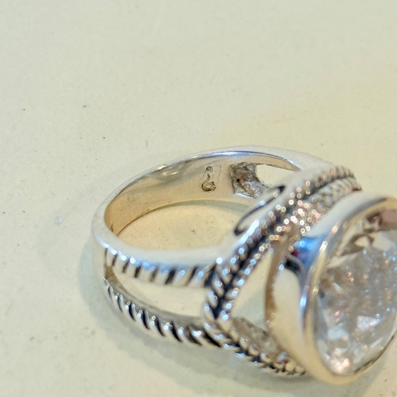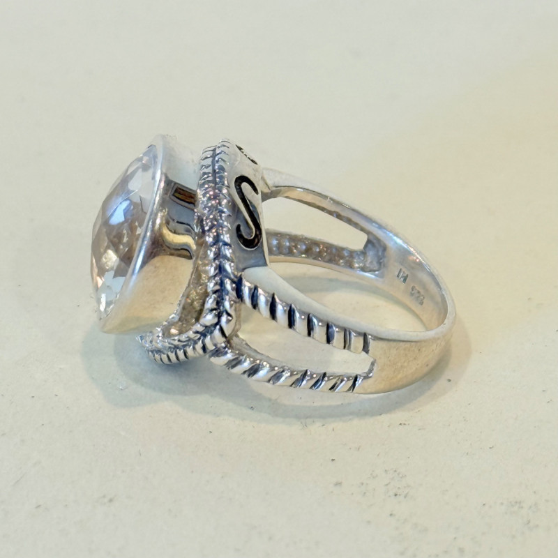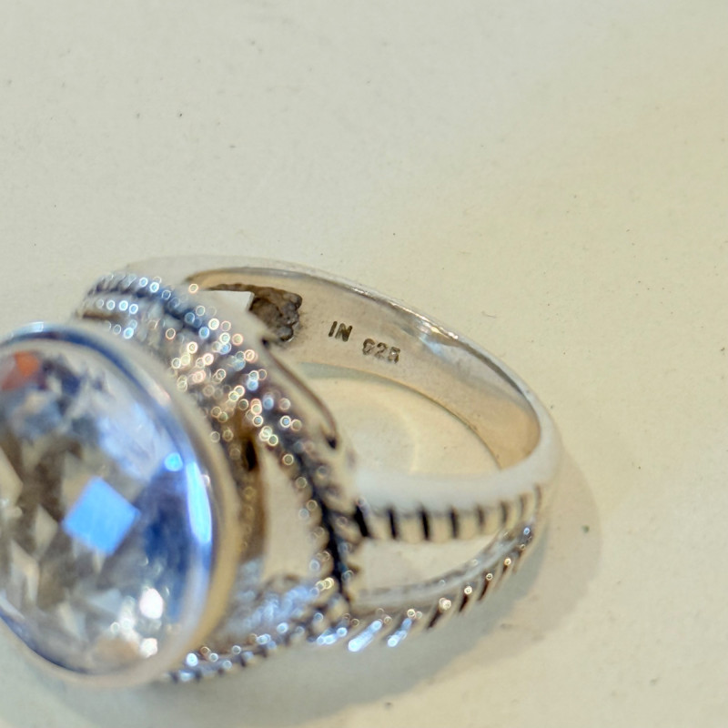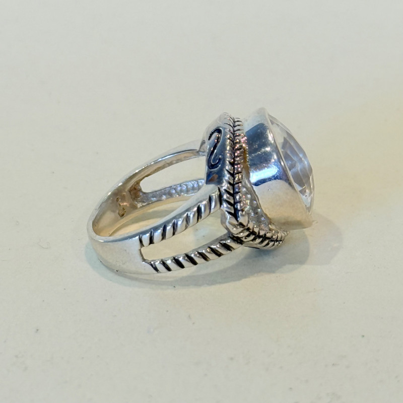 Crystal Crown: Sterling Silver Statement Ring with Brilliant-Cut White Topaz Bold sterling silver ring featuring a large, round faceted white topaz set in a raised bezel framed by twisted rope detailing. The stone is exceptionally clear and reflective, offering diamond-like brilliance with a softer glow. The band is sculptural and substantial, with rope accents continuing along the shank. Ring size: 8. Total weight: 12.2 grams. Stamped 925. Material: Sterling silver, stamped 925 Gemstone: White topaz, round brilliant cut (approx. 10–12 mm diameter) Size: 8 Weight: 12.2 grams Design: Raised bezel with twisted rope border and sculptural shank Markings: Stamped 925