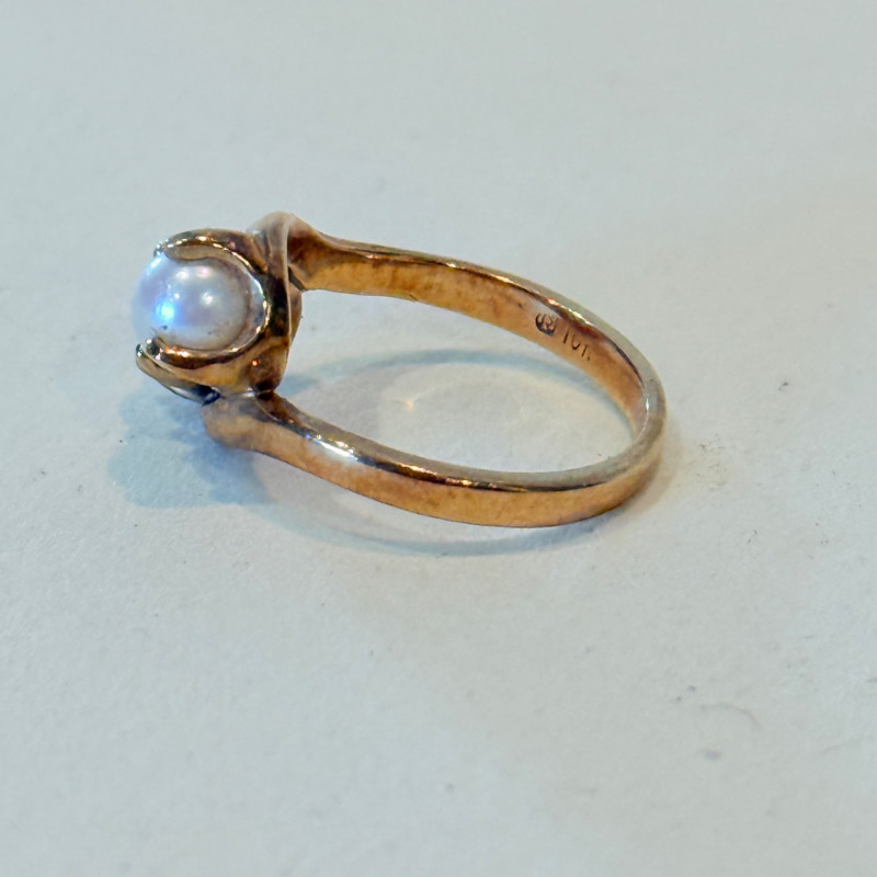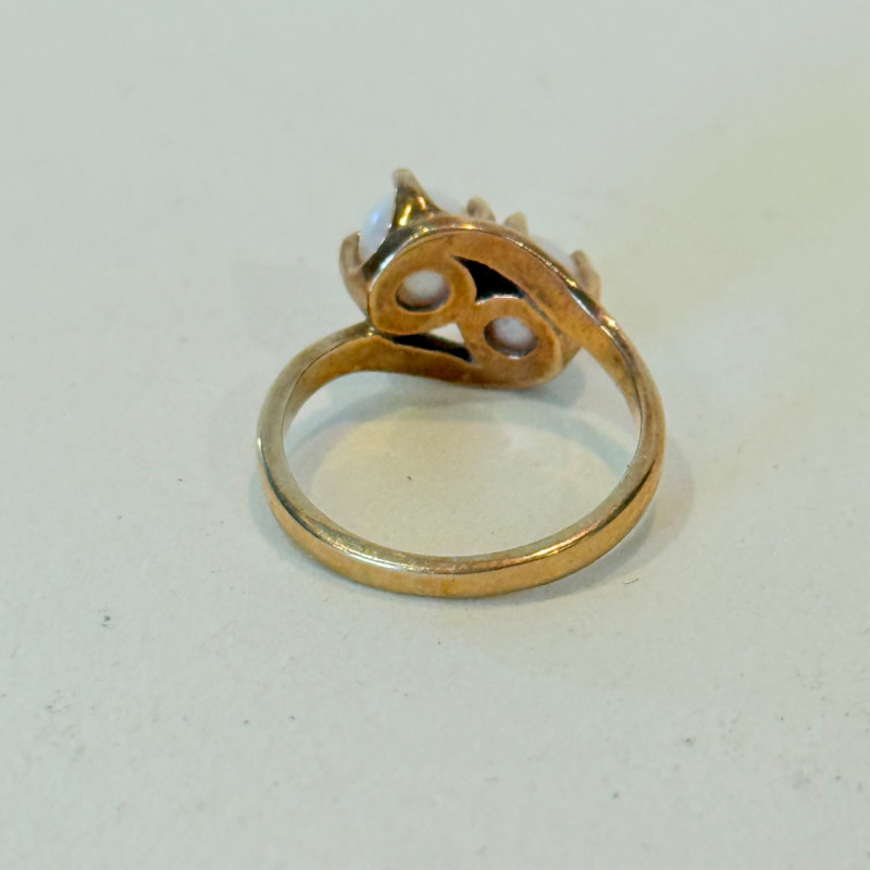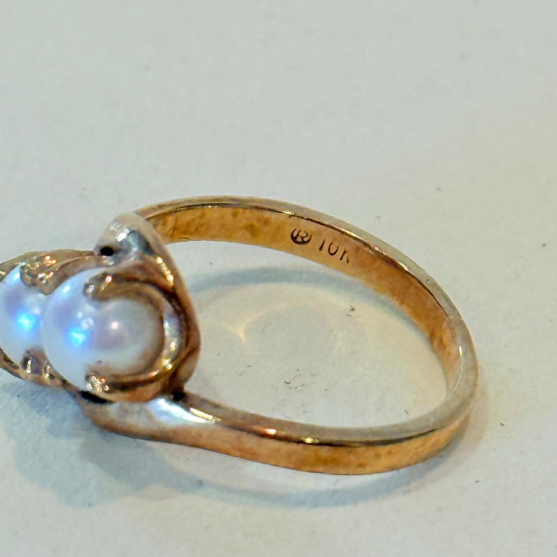 Duet in Luster: Vintage 10K Gold Ring with Twin Cultured Pearls Graceful 10K yellow gold ring featuring two white cultured pearls set side by side in a classic bypass design. The pearls are prong-set and exhibit soft luster with subtle iridescence. The gold band curves elegantly around the pearls, creating a balanced and romantic silhouette. Ring size: 4. Total weight: 2.9 grams. Stamped 10K inside band. Material: 10K yellow gold, stamped Gemstones: Two white cultured pearls, approx. 6 mm each Size: 4 Weight: 2.9 grams Design: Bypass-style twin pearl setting with prong mounts Markings: Stamped 10K