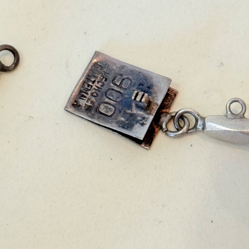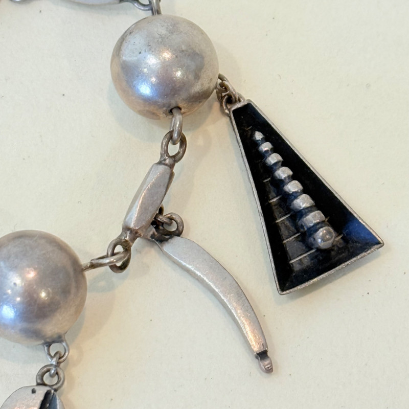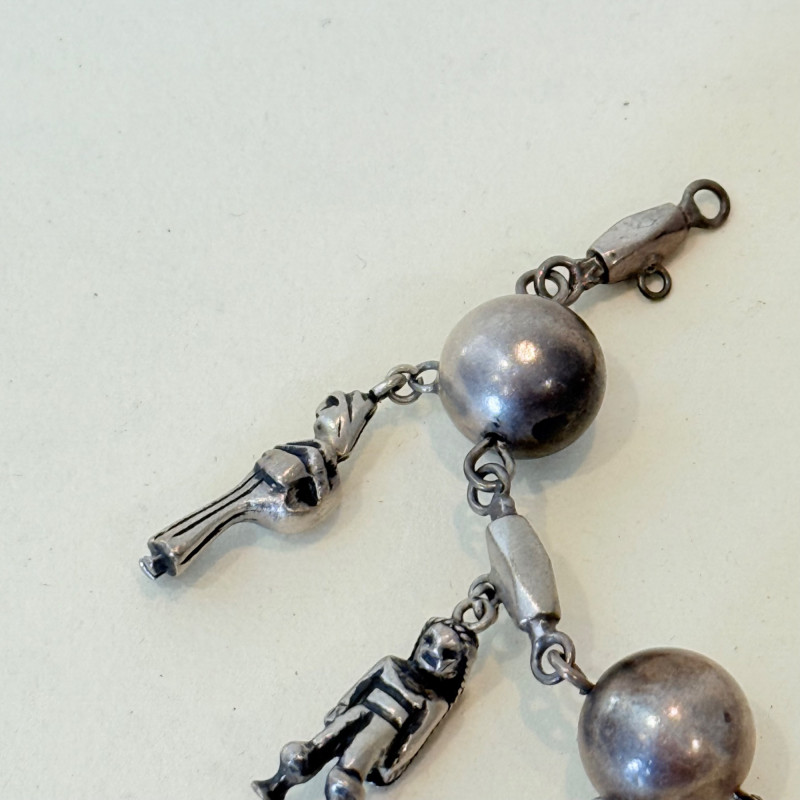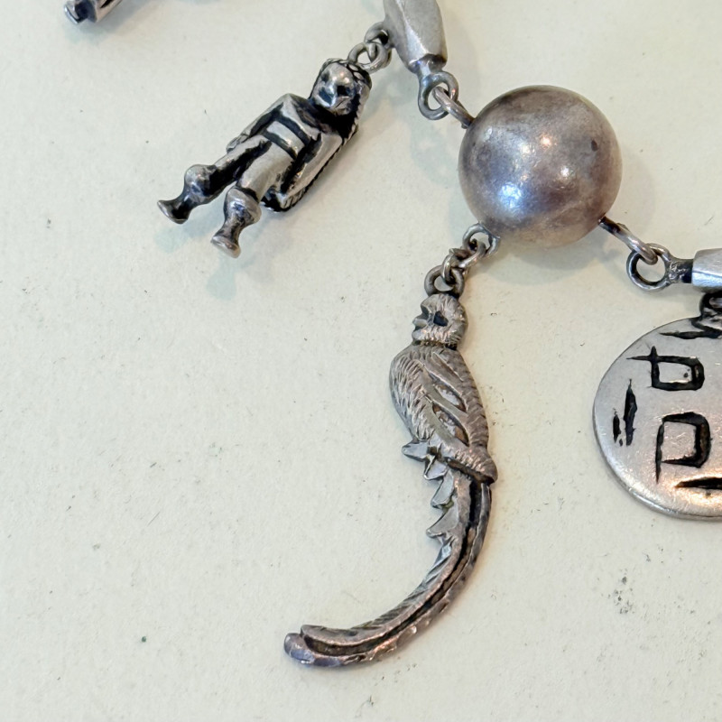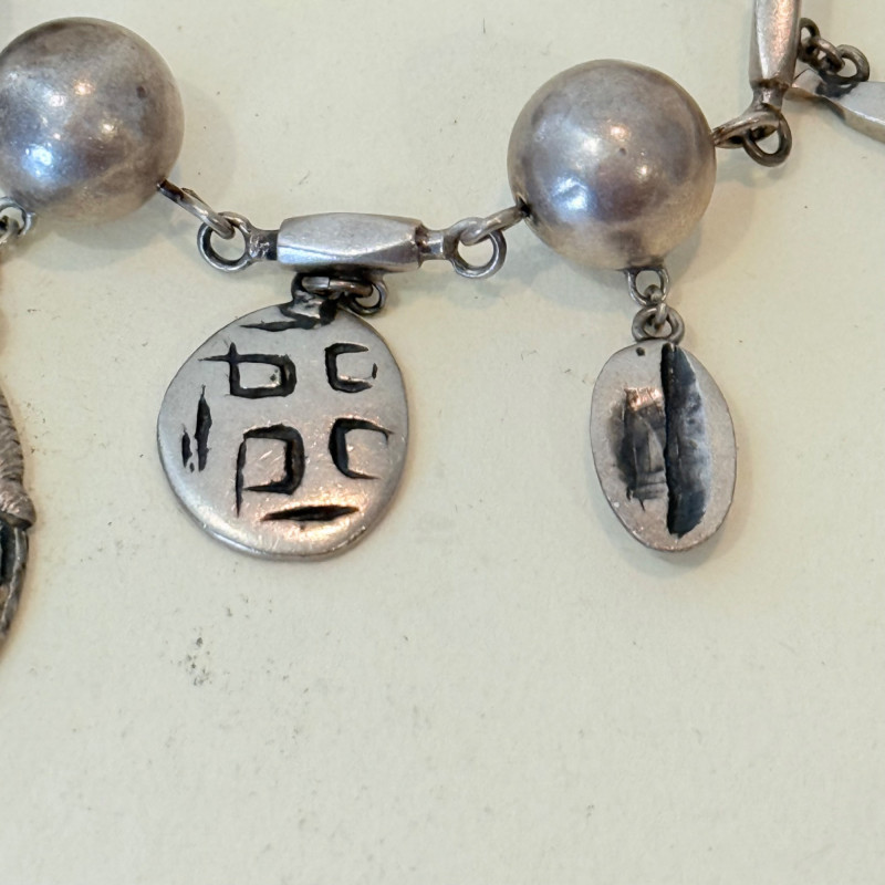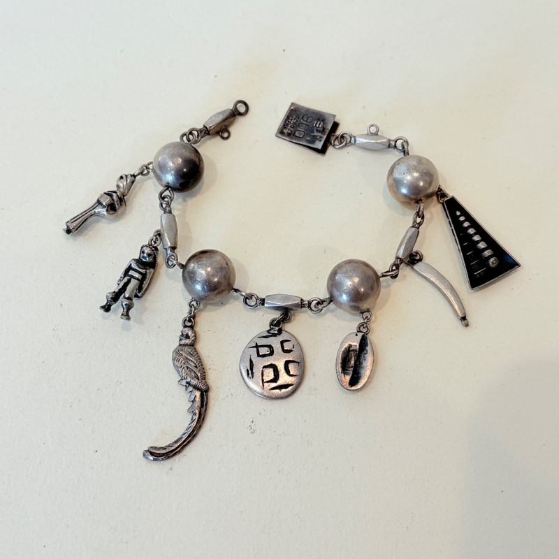 Vintage sterling silver charm bracelet featuring eight sculptural charms and three polished silver beads, each representing a unique motif. Measures 7 inches long and weighs 32.6 grams. Stamped 925 Guatemala. Clasp is broken. Material: Sterling silver, stamped 925 Guatemala Length: 7 inches Weight: 32.6 grams Charms: Includes a parrot, figurals, tusk, stepped pyramid, and two engraved medallions Design: Alternating charms and silver beads on a sturdy link chain