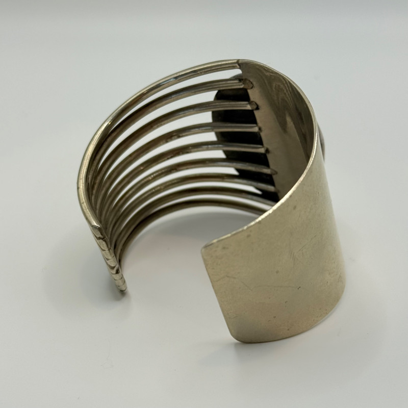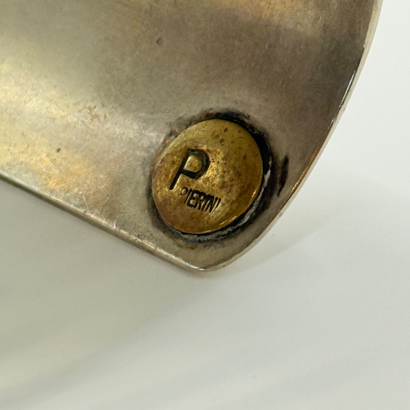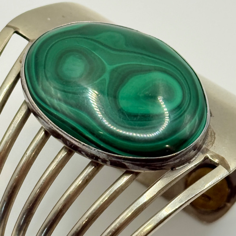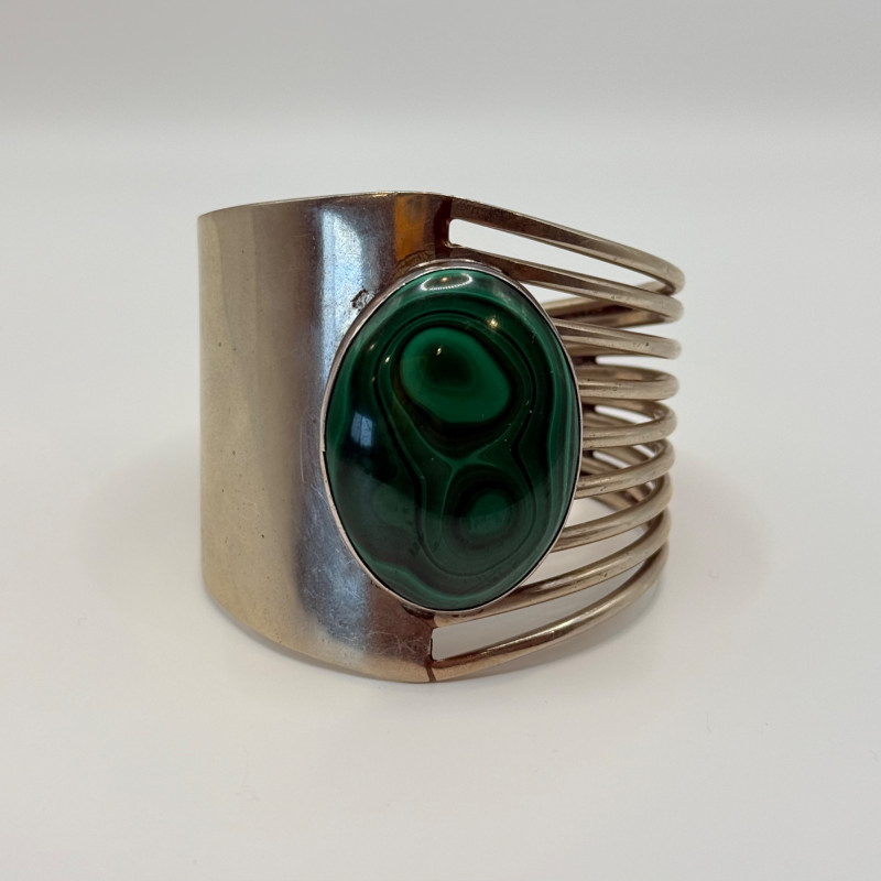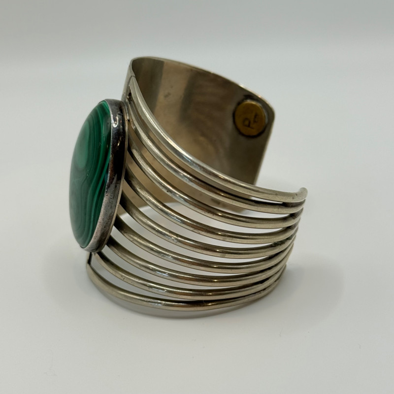 Verdant Current: Pierini Sterling Cuff with Malachite Flow Striking modernist cuff bracelet by Pierini, crafted in sterling silver and set with a large oval malachite cabochon. The asymmetrical design features a solid silver panel opposite a series of parallel open bands, creating a dynamic tension between structure and air. The malachite displays rich concentric banding in deep green tones, emblematic of the stone’s natural beauty and symbolic resonance. Measures 2.25" wide and 2.25" in diameter. Stamped Sterling. Maker: Pierini Material: Sterling silver, malachite Dimensions: 2.25" wide × 2.25" diameter Design: Asymmetrical cuff with open band structure and bezel-set malachite Markings: Stamped Sterling Style Note: Exemplifies Pierini’s sculptural approach to silverwork, blending organic stone with architectural form