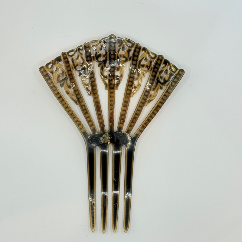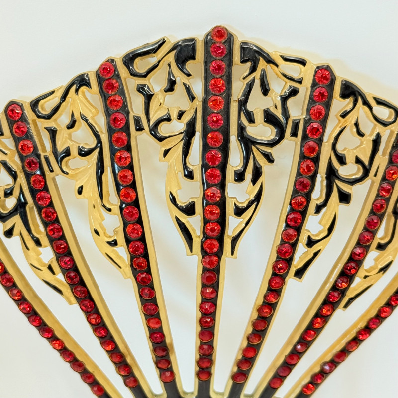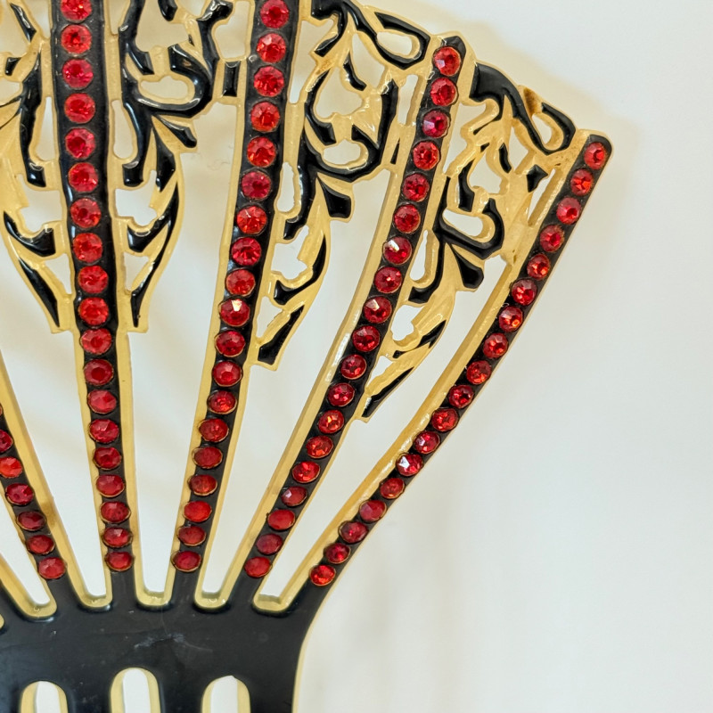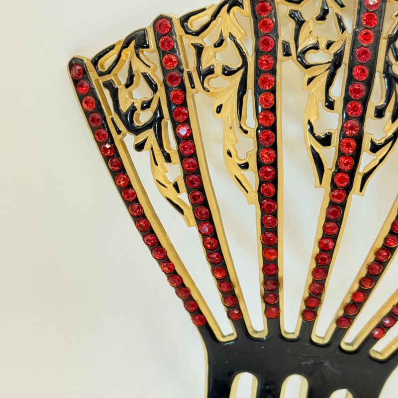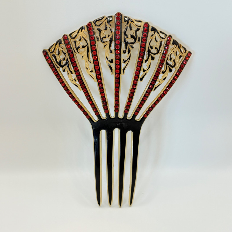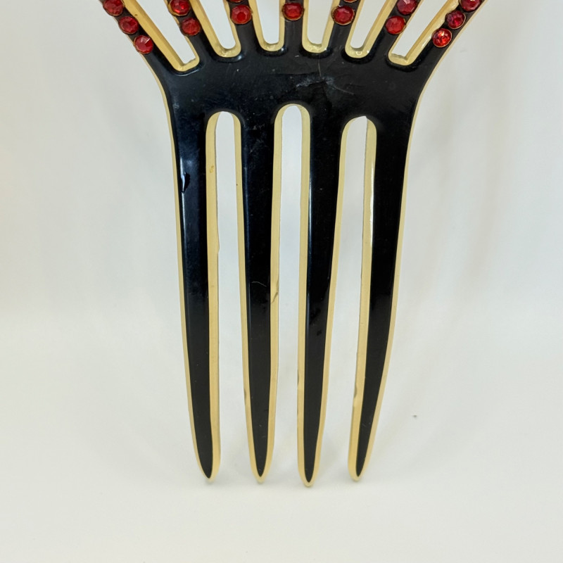 Antique celluloid hair comb in a dramatic fan-shaped design, featuring pierced cream panels with black scrollwork and vertical rows of red rhinestones. Five black prongs anchor the ornate crest, evoking the elegance of 1920s–30s Spanish-inspired formalwear. Measures 7" × 5". Unmarked. Material: Celluloid, rhinestone Dimensions: 7" length × 5" width Design: Fan-shaped pierced top with scrollwork and red rhinestone accents Finish: Cream, black, and red Markings: Unmarked Style Note: Typical of Art Deco and mantilla-style accessories popular in early 20th-century Europe and America