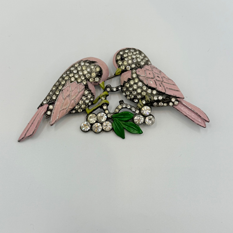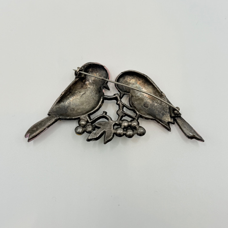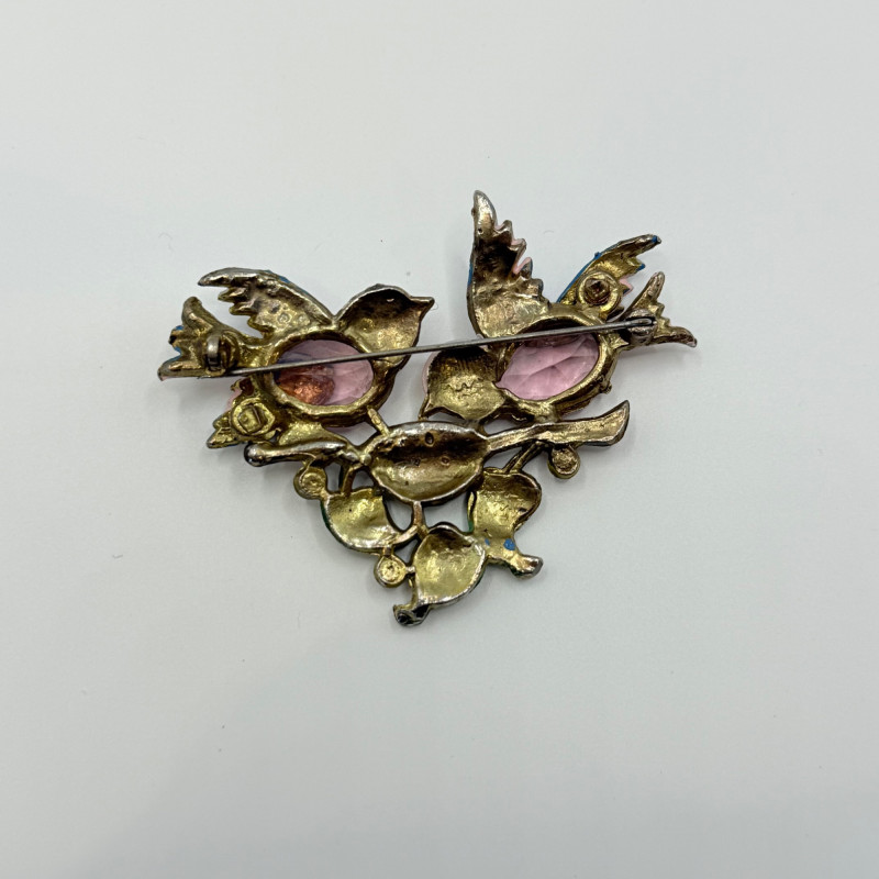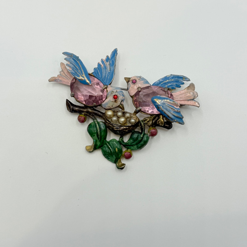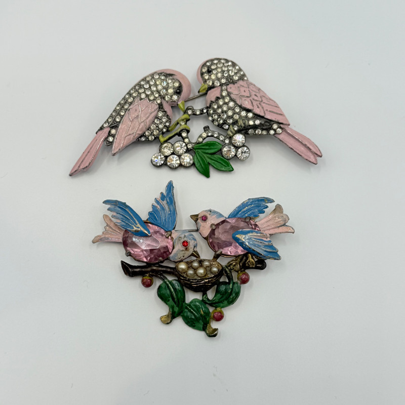 Pair of vintage figural bird brooches in enamel and rhinestone. One features two pink birds perched on a rhinestone branch with white blossoms; the other shows three birds in pink and blue gathered around a pearl-accented nest with green leaves and red berries. Unsigned. Measures 2.5" to 3.5" wide. Quantity: 2