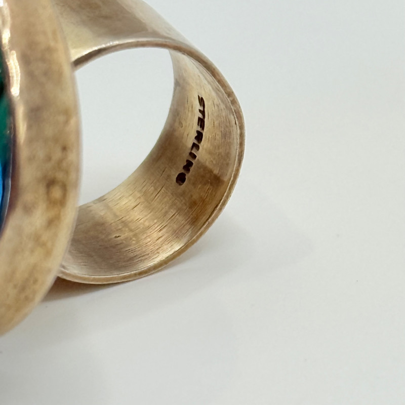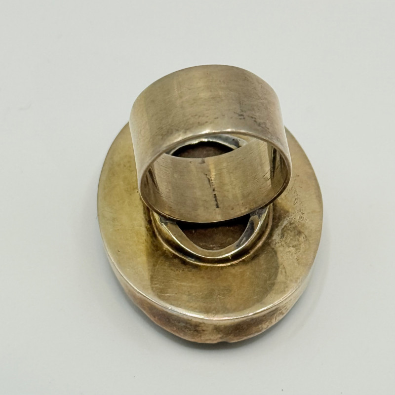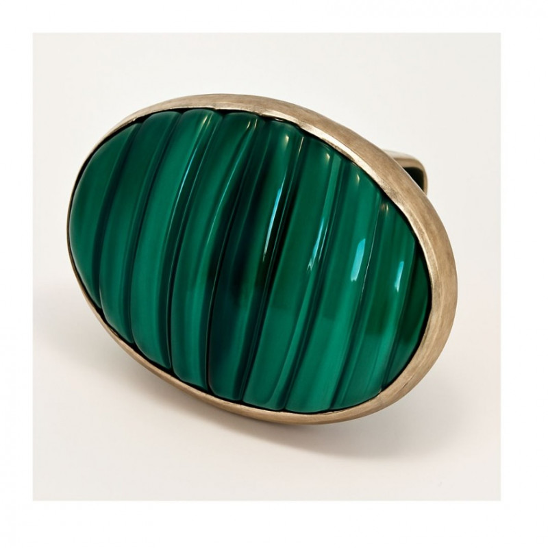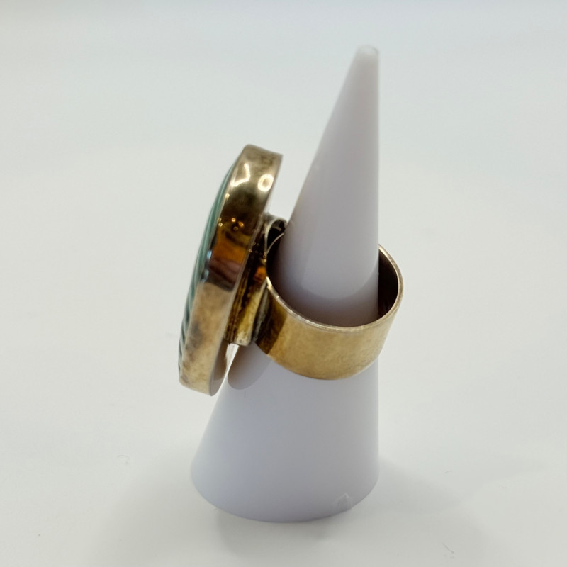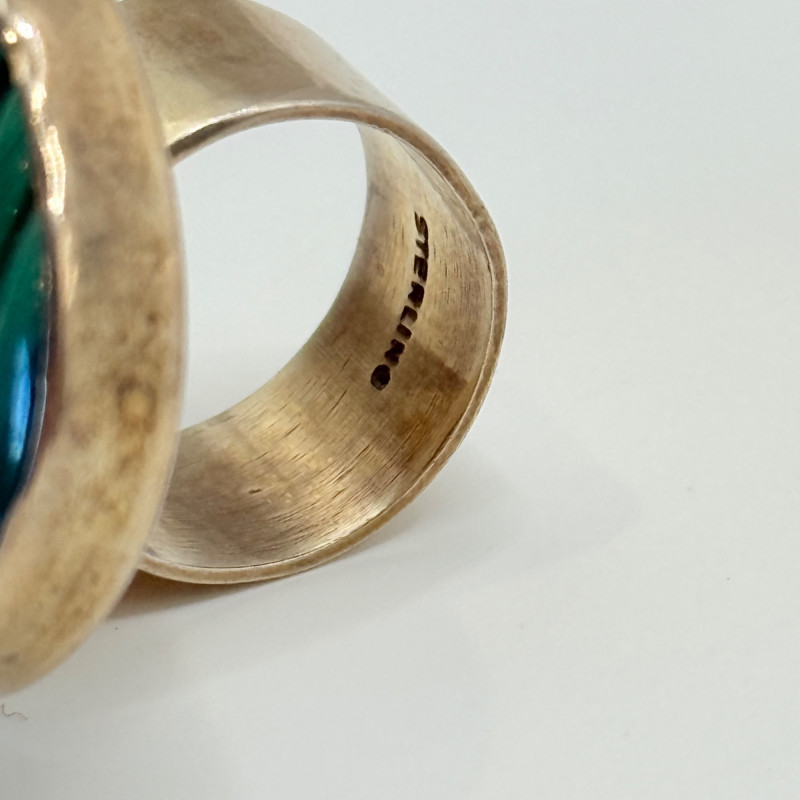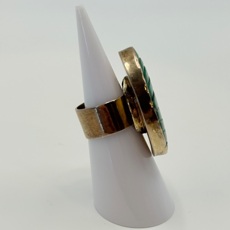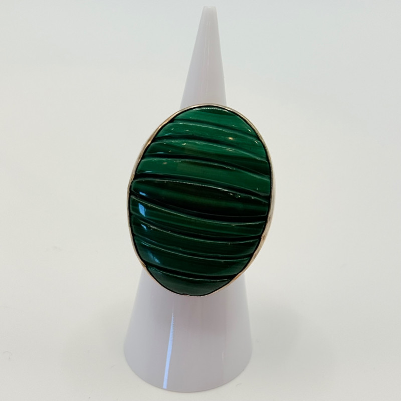 Malachite and sterling ring featuring a large carved oval stone in a ridged cabochon form. Stamped Sterling. Measures 1.5" × 1" and fits a size 5. Size: 5