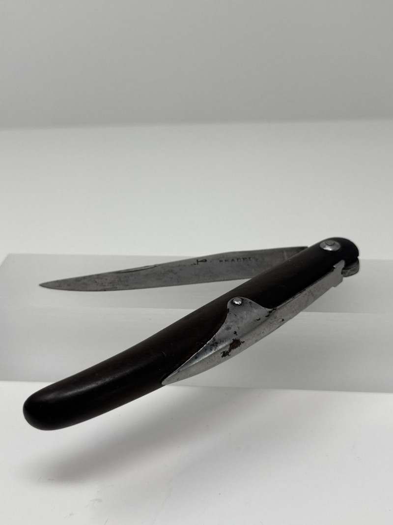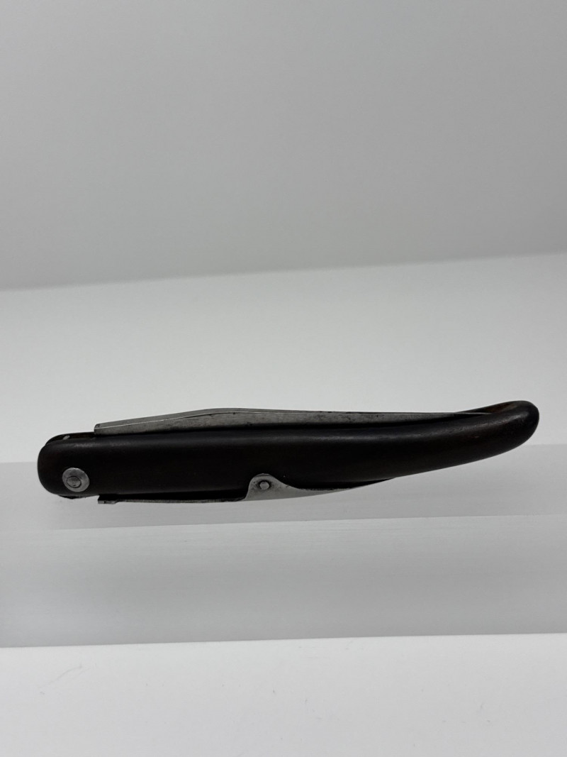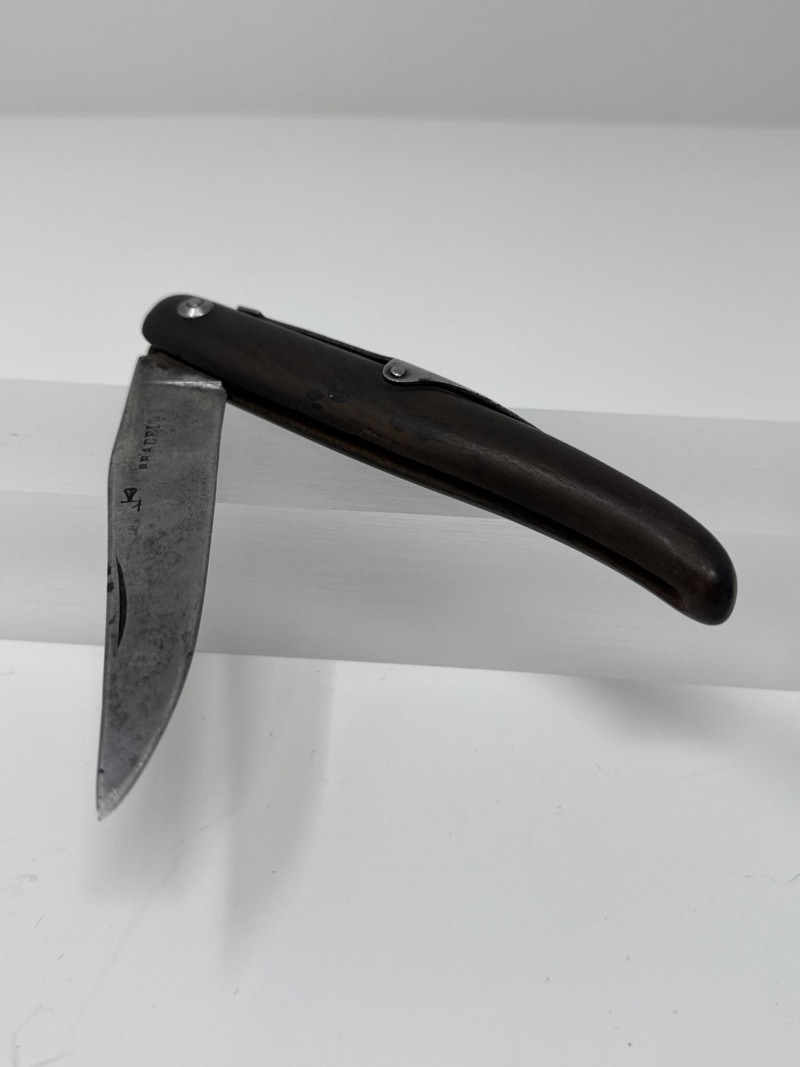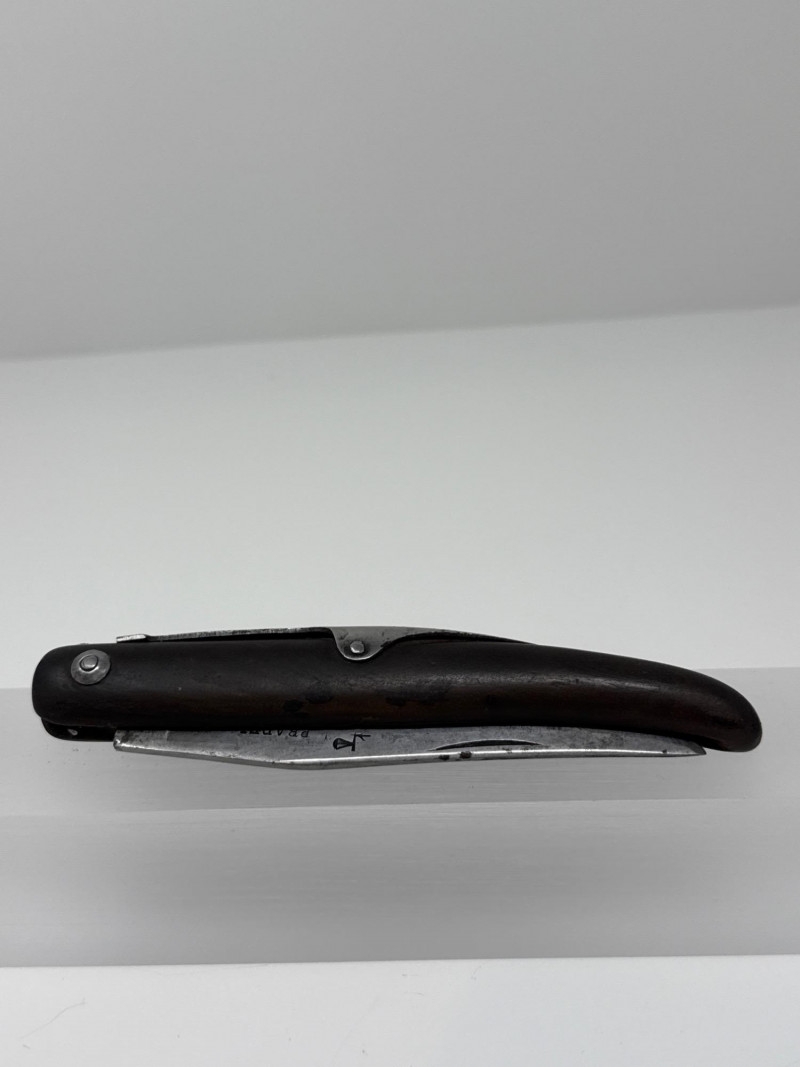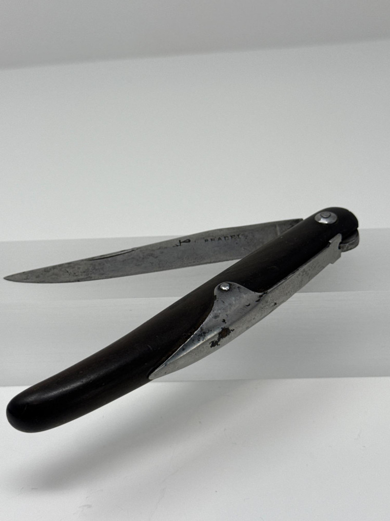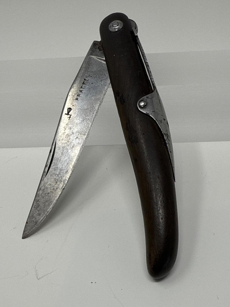 A classic example of mid-century French utility design, this Pradel folding pocket knife features a dark hardwood handle and a 4" aged steel blade with visible wear and patina. The blade is stamped “Pradel”, a mark associated with traditional French cutlery and pocket knives dating back to the early 20th century. Known for their durable construction and understated elegance, Pradel knives were widely used across France for everyday tasks and outdoor pursuits. Blade: Approx. 4" steel, aged with surface oxidation Handle: Smooth dark hardwood, gently curved for grip Markings: “Pradel” stamped on blade; partial serial or maker’s marks Mechanism: Single-blade folding with riveted pivot Origin: Likely French-made, mid-20th century Condition: Blade shows wear and oxidation; handle intact with light surface wear