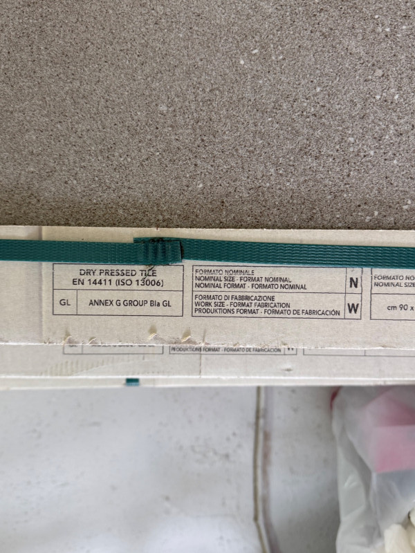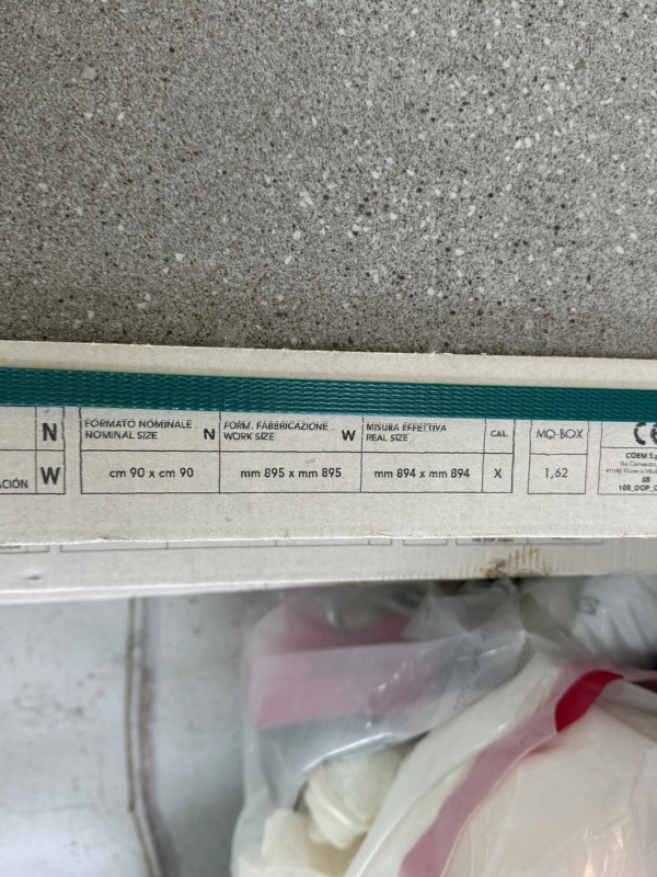 This lot includes 46 individual tiles (unopened) packaged in boxes of 2. Each tile measures approximately 90 x 90 cm (35.4" x 35.4"), offering a clean, modern look with a durable porcelain surface.