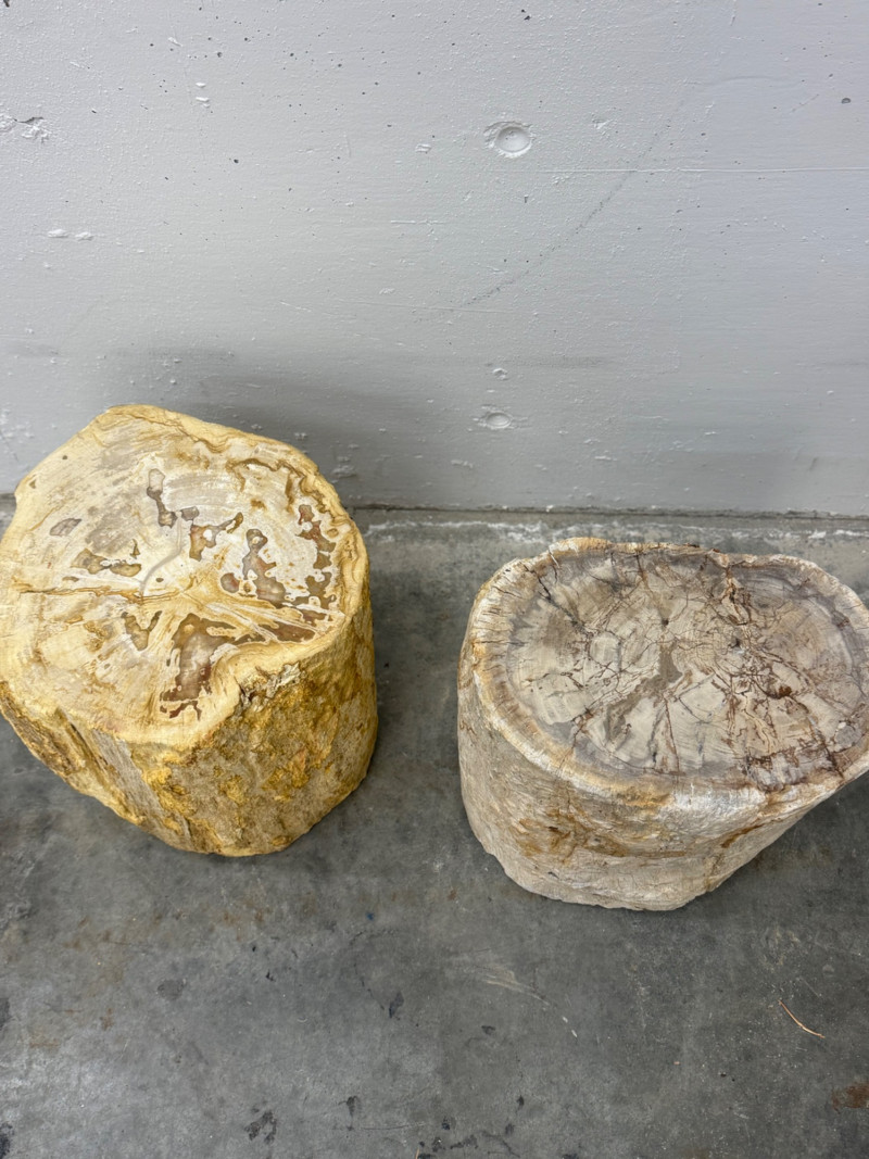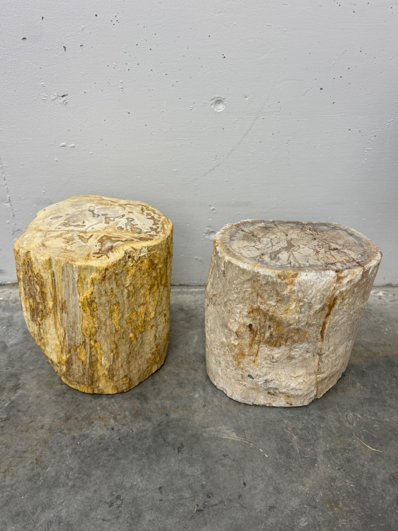 A striking pair of natural petrified wood stools, showcasing millions of years of organic history transformed into stone. Each piece displays unique veining, color variations, and polished tops that reveal the intricate fossilized grain. Versatile as side tables, display pedestals, or sculptural accents, they bring a raw yet refined element into any interior. Material: Petrified wood Quantity: 2 Measurements (each): approx. 13″ H x 14″ D Condition: Excellent, natural variations consistent with petrified wood Note: These pieces are extremely heavy, requiring careful handling and placement Timeless and substantial, they combine functionality with geological beauty — true statement pieces for any collection.