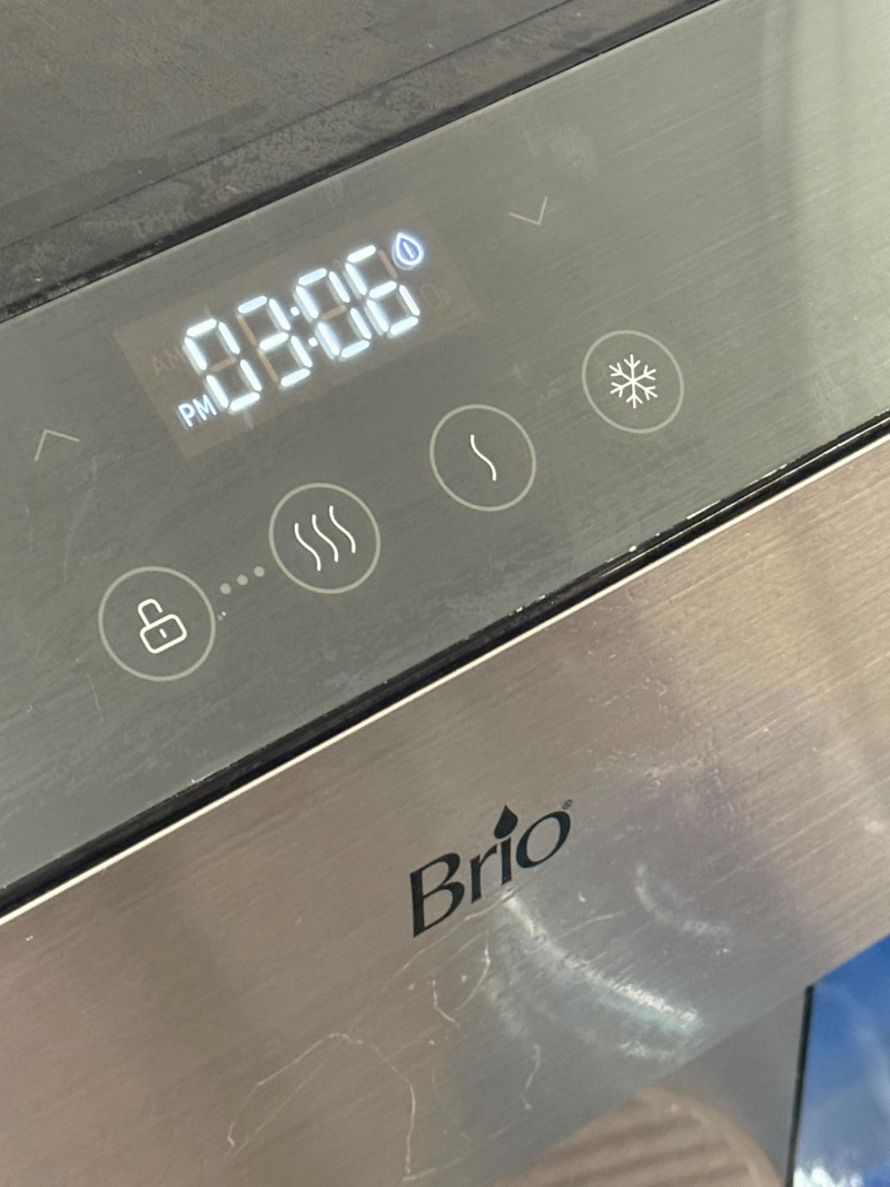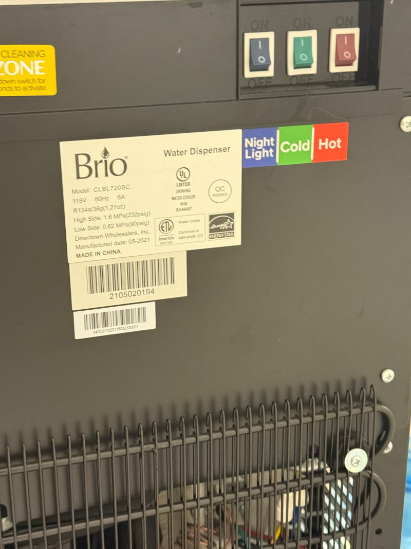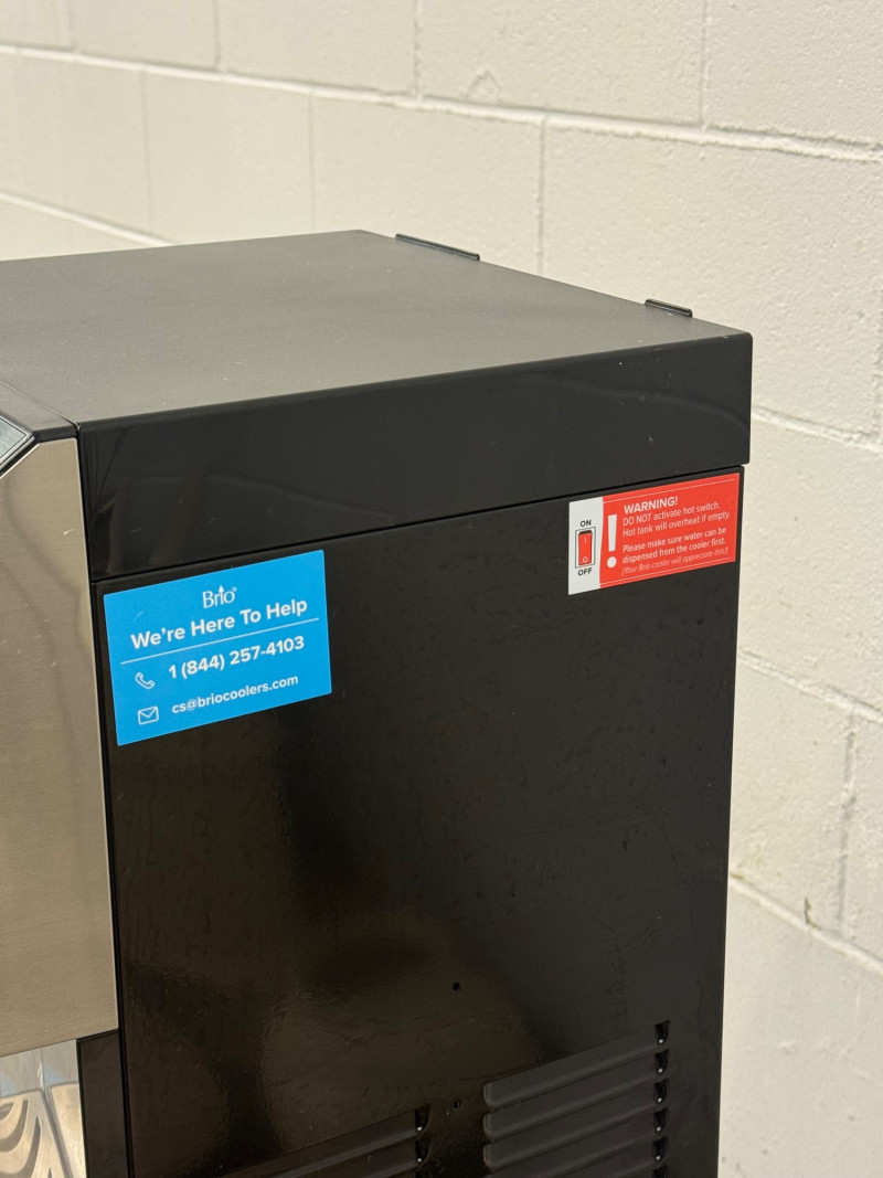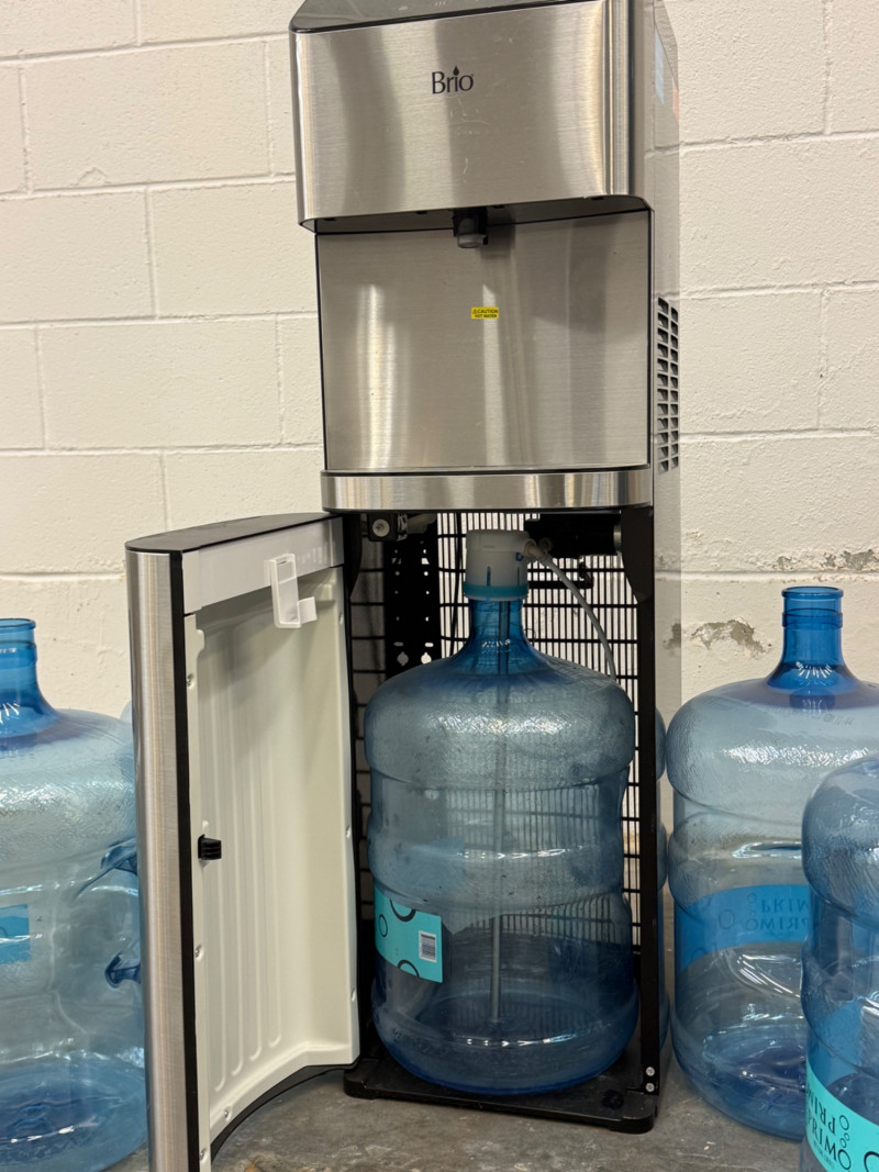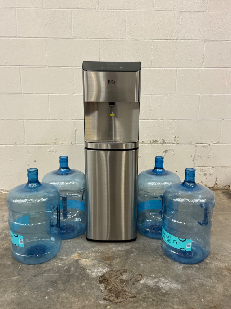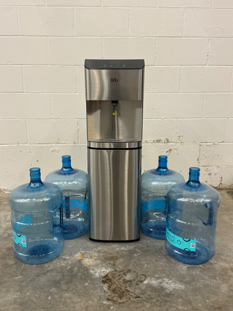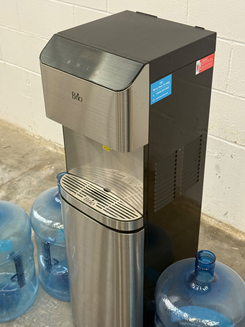 Modern Brio stainless steel water cooler dispenser, designed for top-loading 5-gallon bottles. Dispenses hot, cold, and room temperature water with a sleek brushed steel finish, making it ideal for office, gym, or home use. This lot also includes six 5-gallon water jugs, giving you plenty of capacity for rotation and storage. Brand: Brio Type: Top-loading stainless steel dispenser Functions: Hot, cold, and room temperature dispensing Includes: 6 × 5-gallon water jugs Condition: Excellent, lightly used