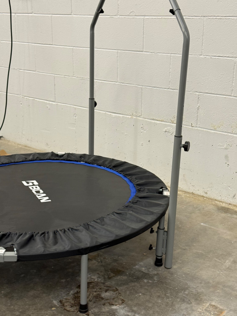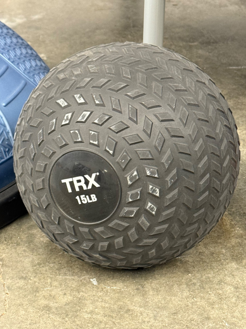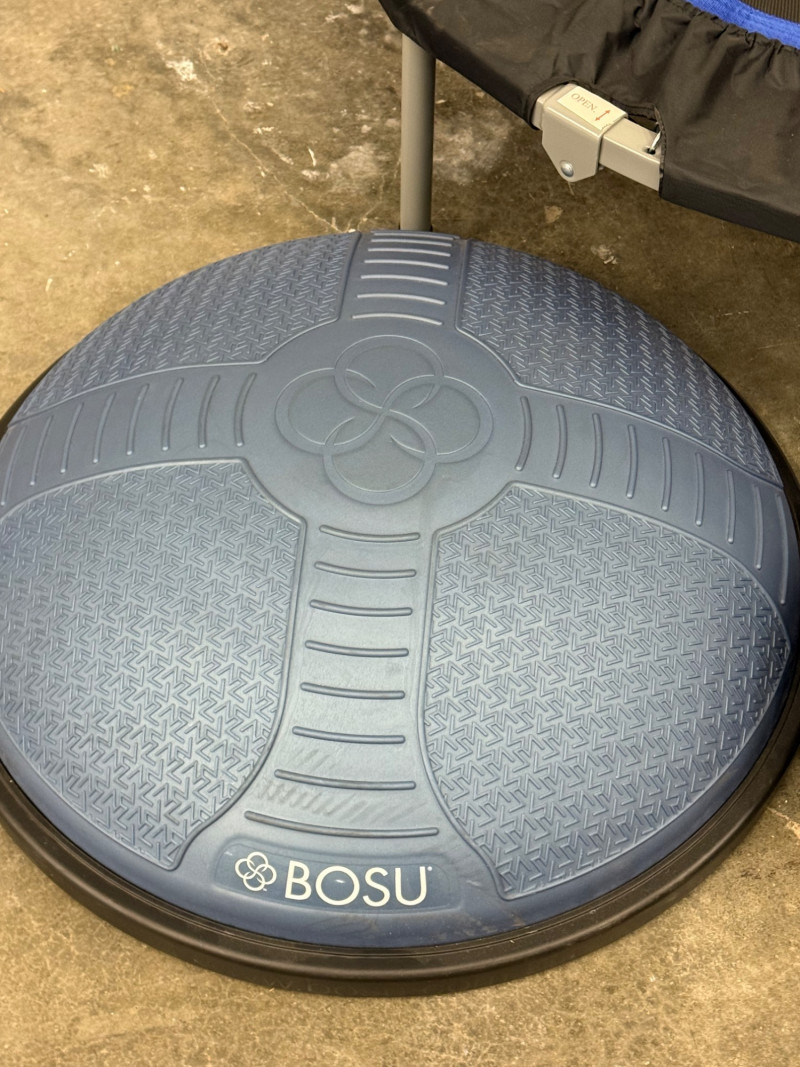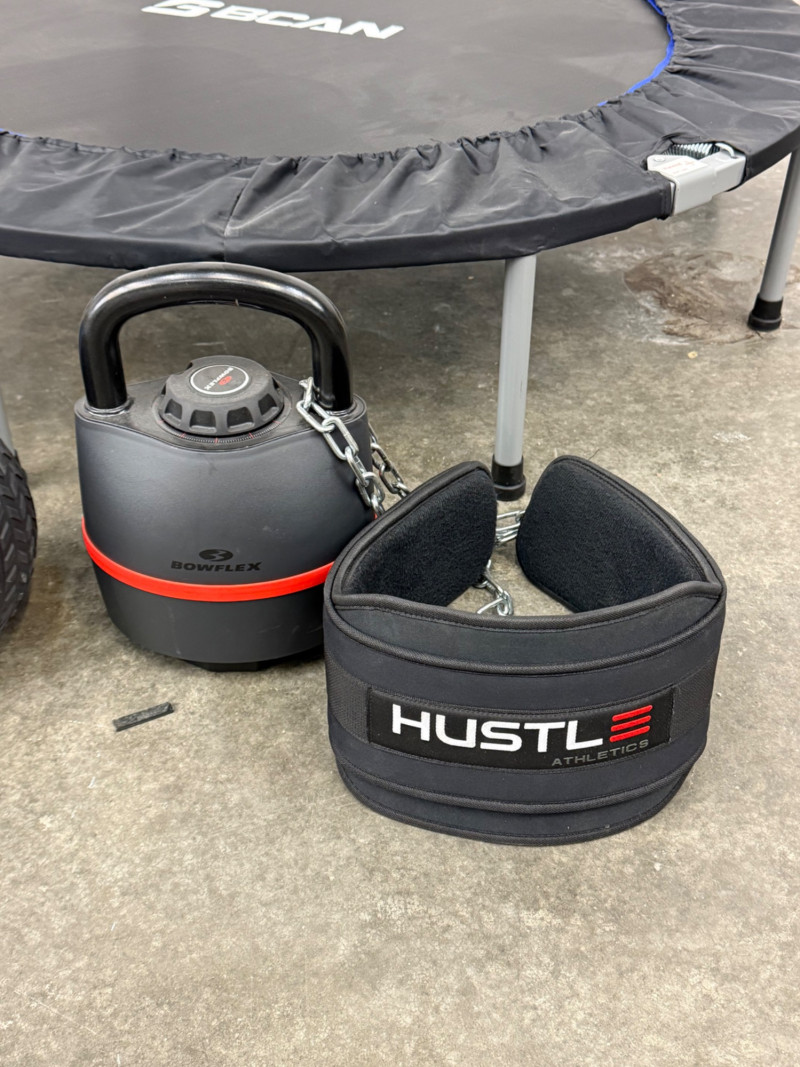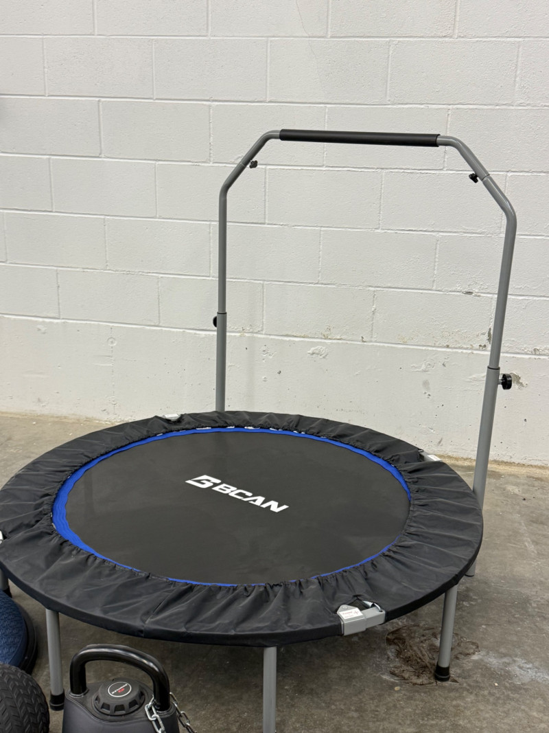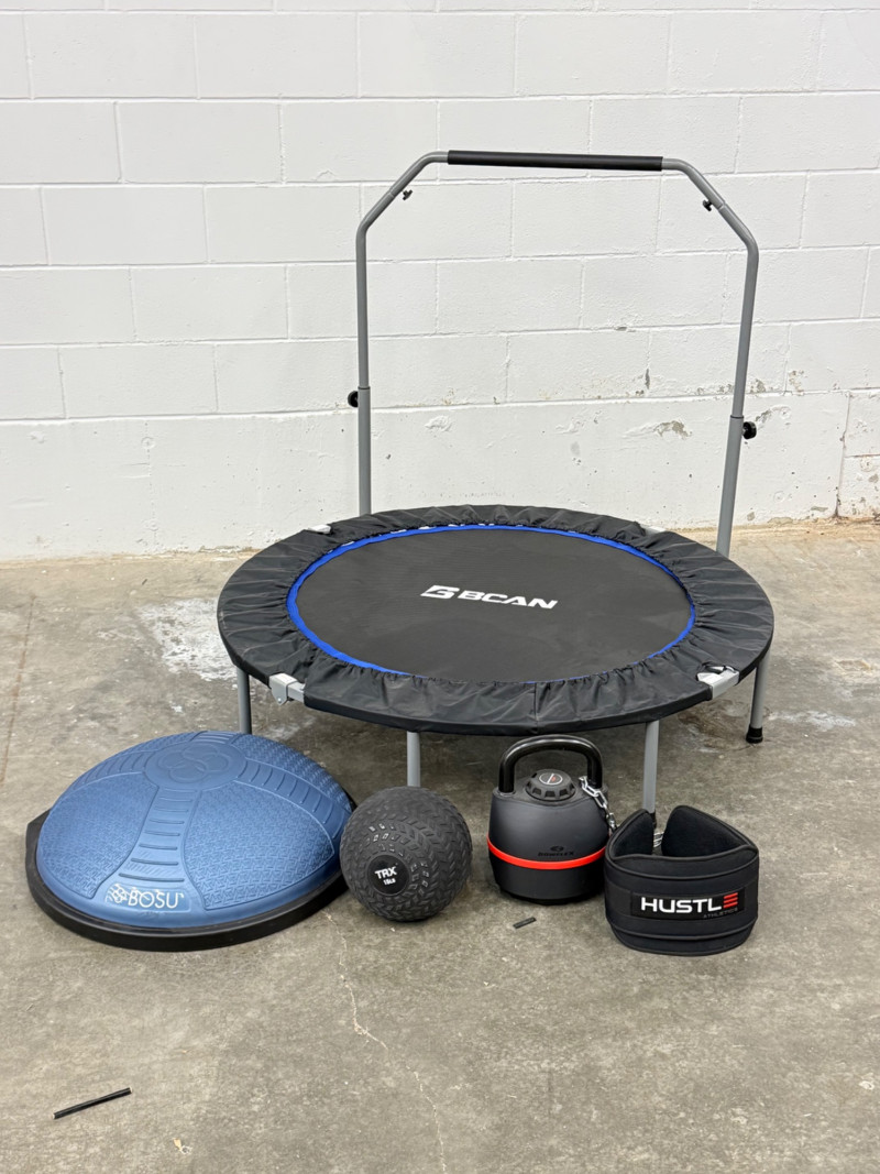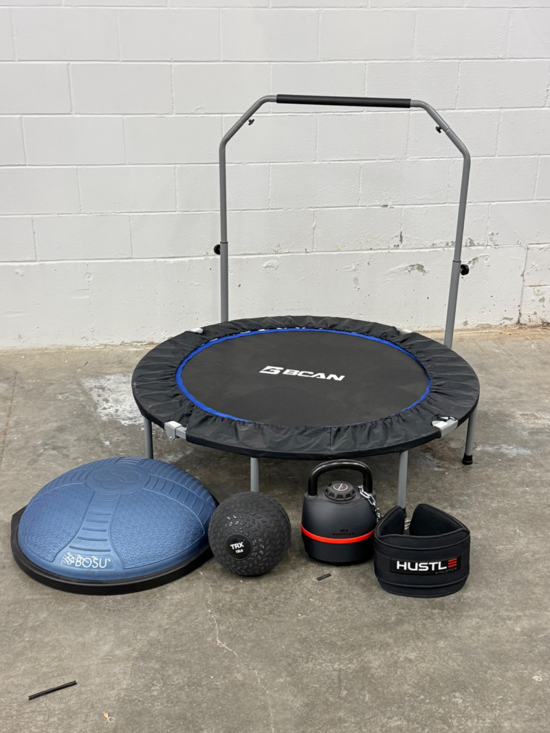 A versatile set of fitness gear designed for cardio, strength, and balance training. This lot includes: Bcan Mini Trampoline with Handlebar – approx. 40″ diameter, for cardio and rebounding workouts BOSU Balance Trainer – approx. 26″ diameter, 10″ high, for balance and core stability TRX Slam Ball (30 lb) – approx. 10″ diameter, textured for grip and durability Bowflex SelectTech Adjustable Kettlebell – compact, approx. 12″ H x 9″ W, adjustable weight settings Hustle Weightlifting Belt – adjustable size, padded for support Condition: Excellent overall, light wear consistent with normal use. This set covers a wide range of training needs in a compact footprint, with equipment sizes ranging from 18″ to 40″.