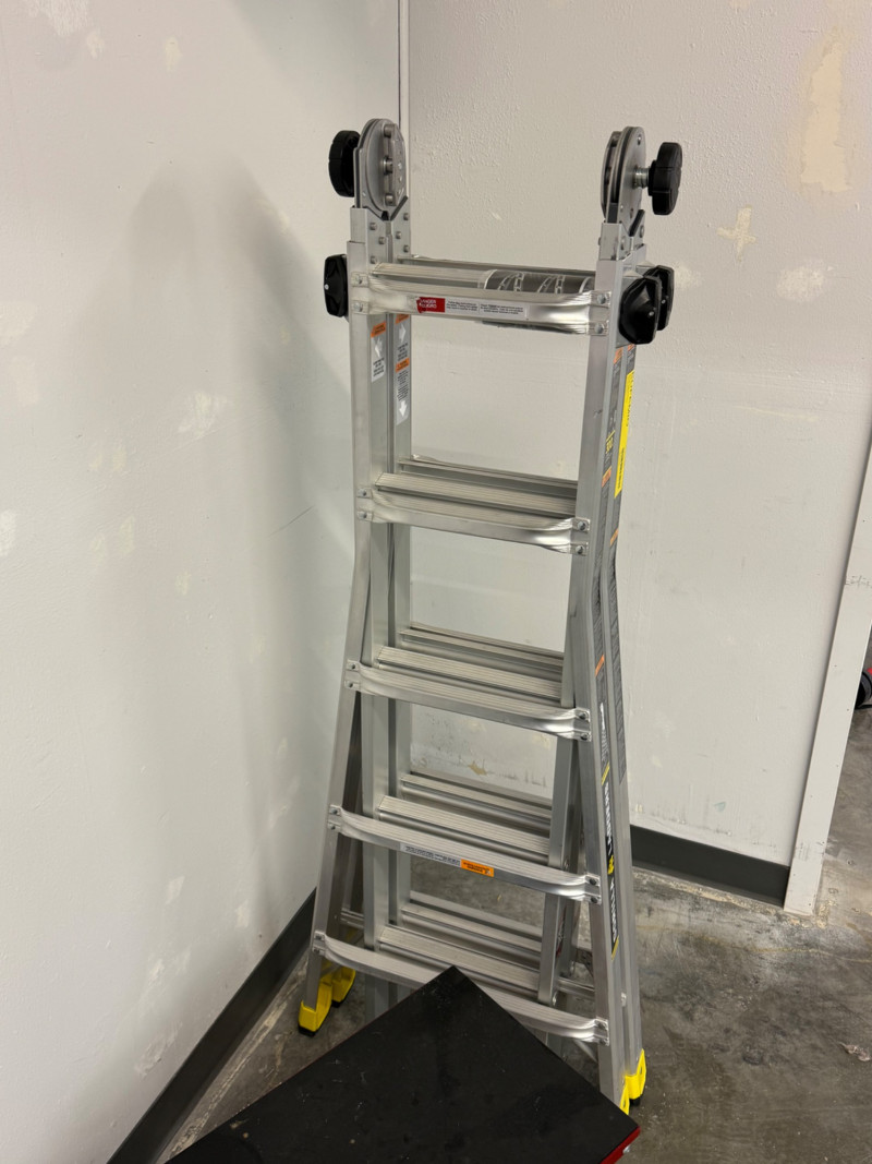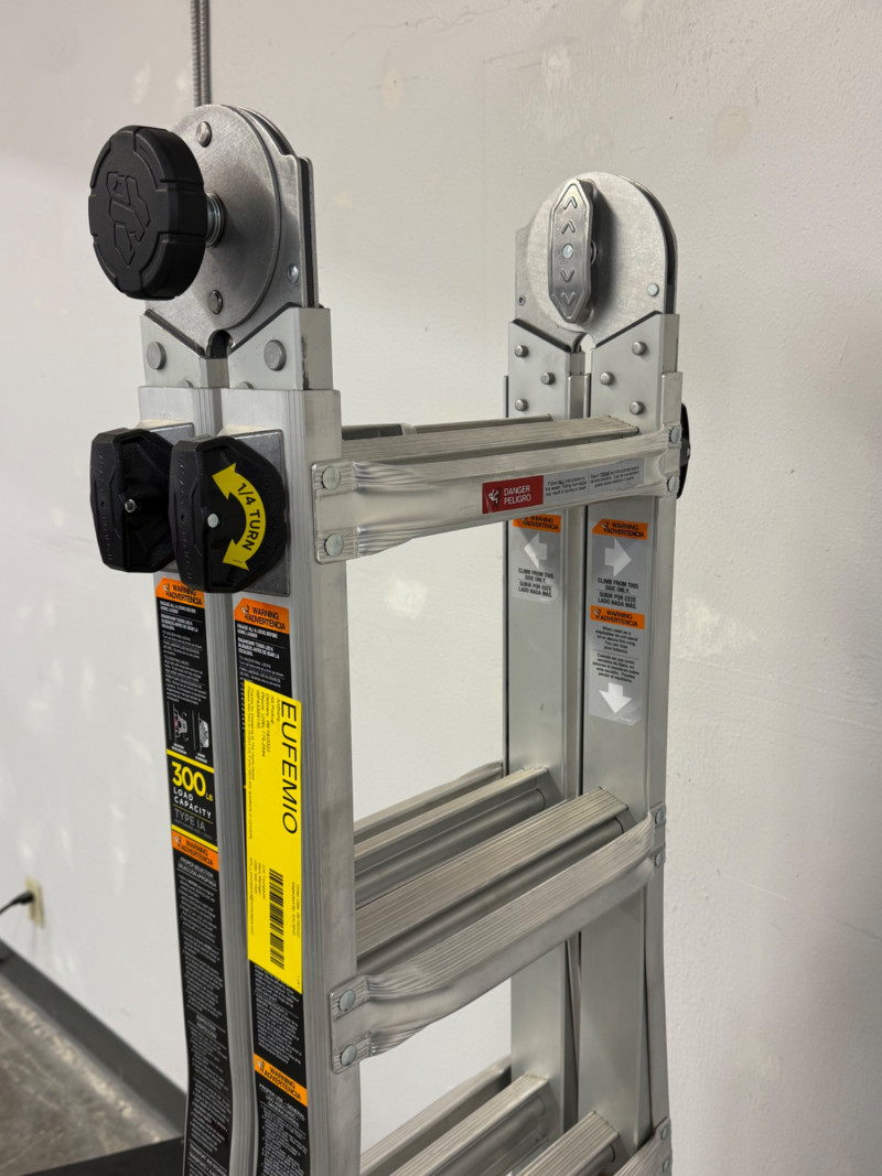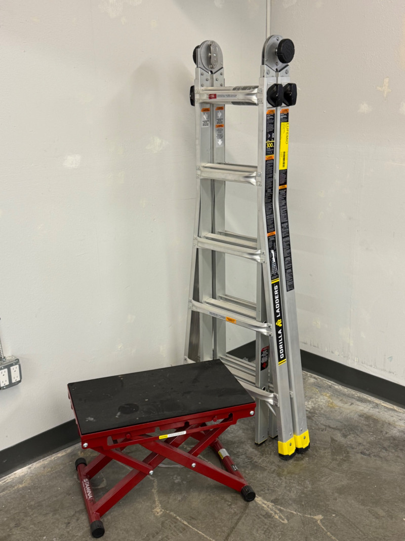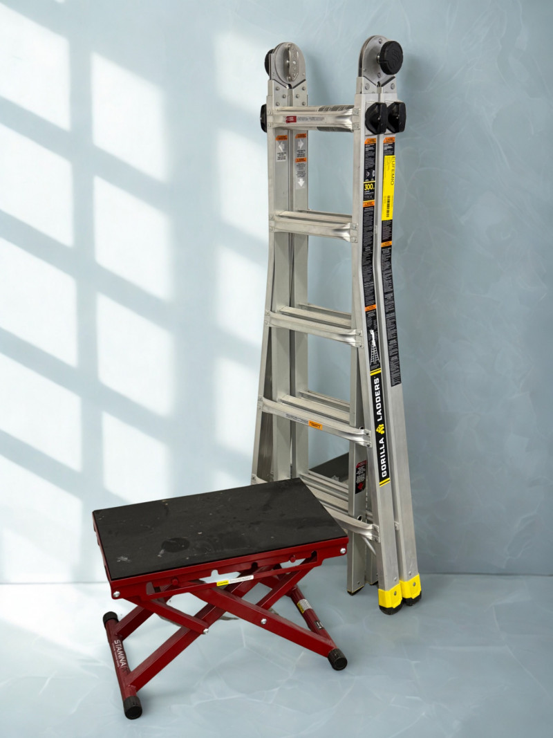 A practical pair for any workshop, garage, or job site. This lot includes a Gorilla multi-position ladder and a Stamina adjustable scissor-lift work table, both built tough for serious projects. Details: Gorilla Ladder – Heavy-duty aluminum, multi-position design (extension, step, scaffold, and more). Load capacity: 300 lbs. Approx. height: 4 ft compact, extends up to ~13–17 ft depending on configuration. Stamina Lift Table – Steel-framed with rubberized top platform, adjustable scissor-lift design. Approx. 24” L x 15” W x 18” H (adjustable). Excellent for supporting tools, small machinery, or repair projects. Condition: Used but solid. Ladder has expected scuffs, still sturdy. Lift table shows surface wear but operates as intended. Why You’ll Love It: