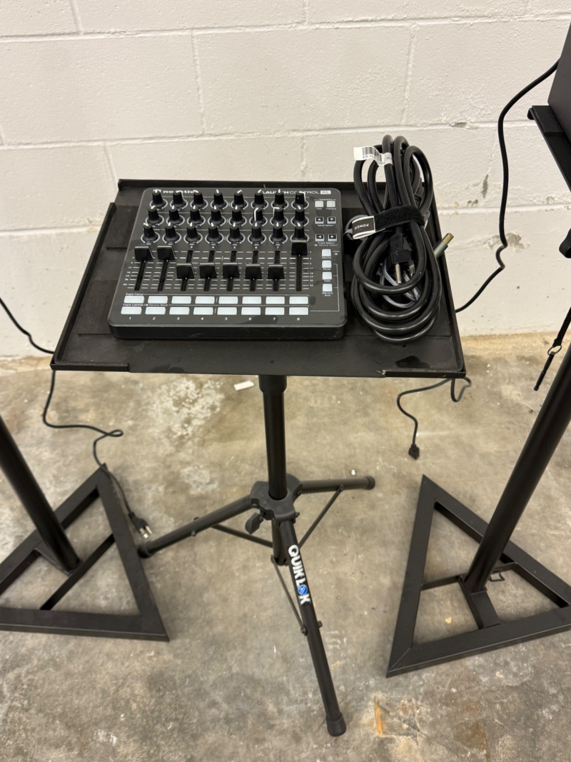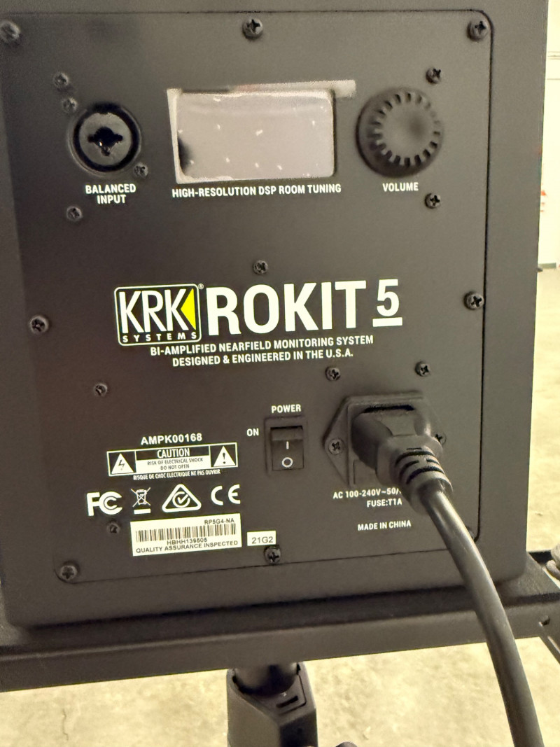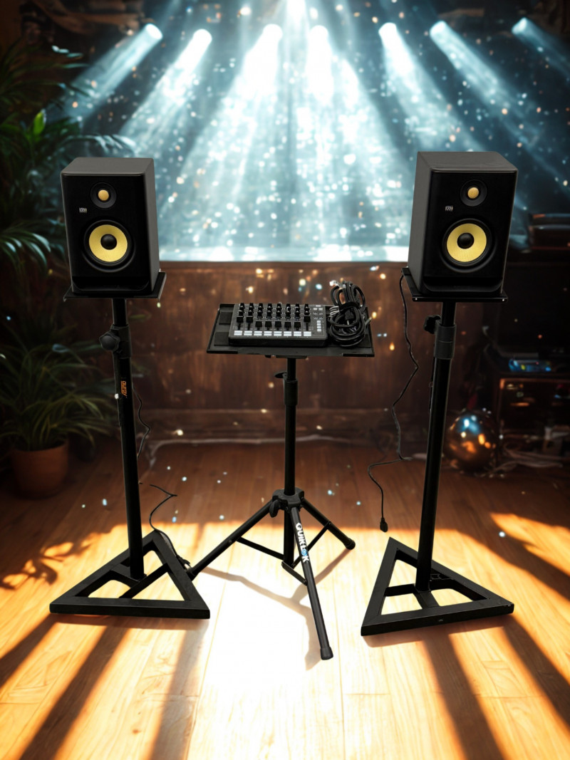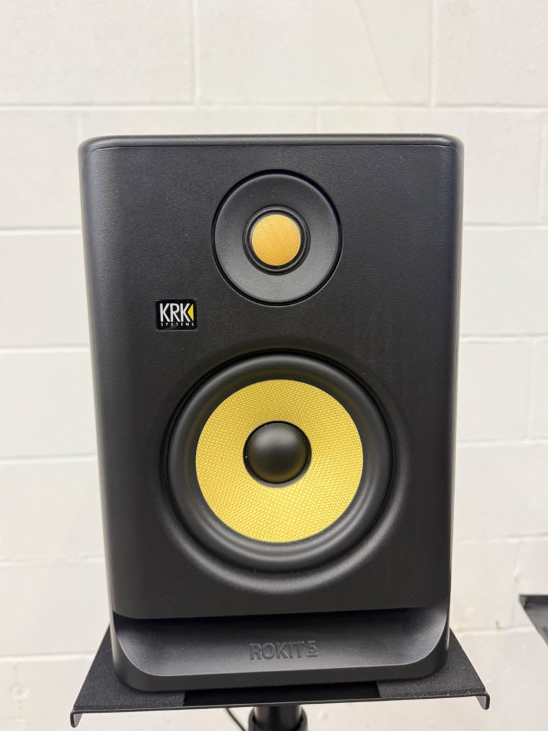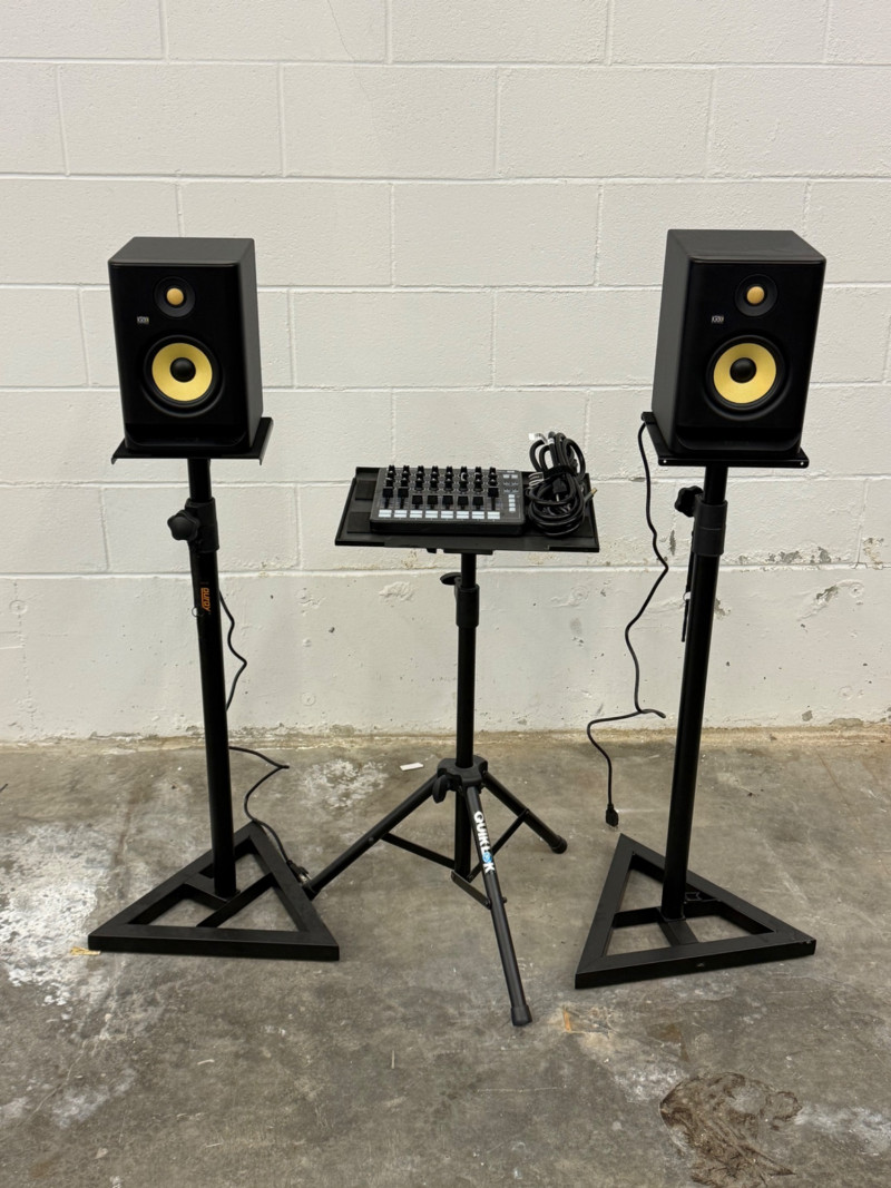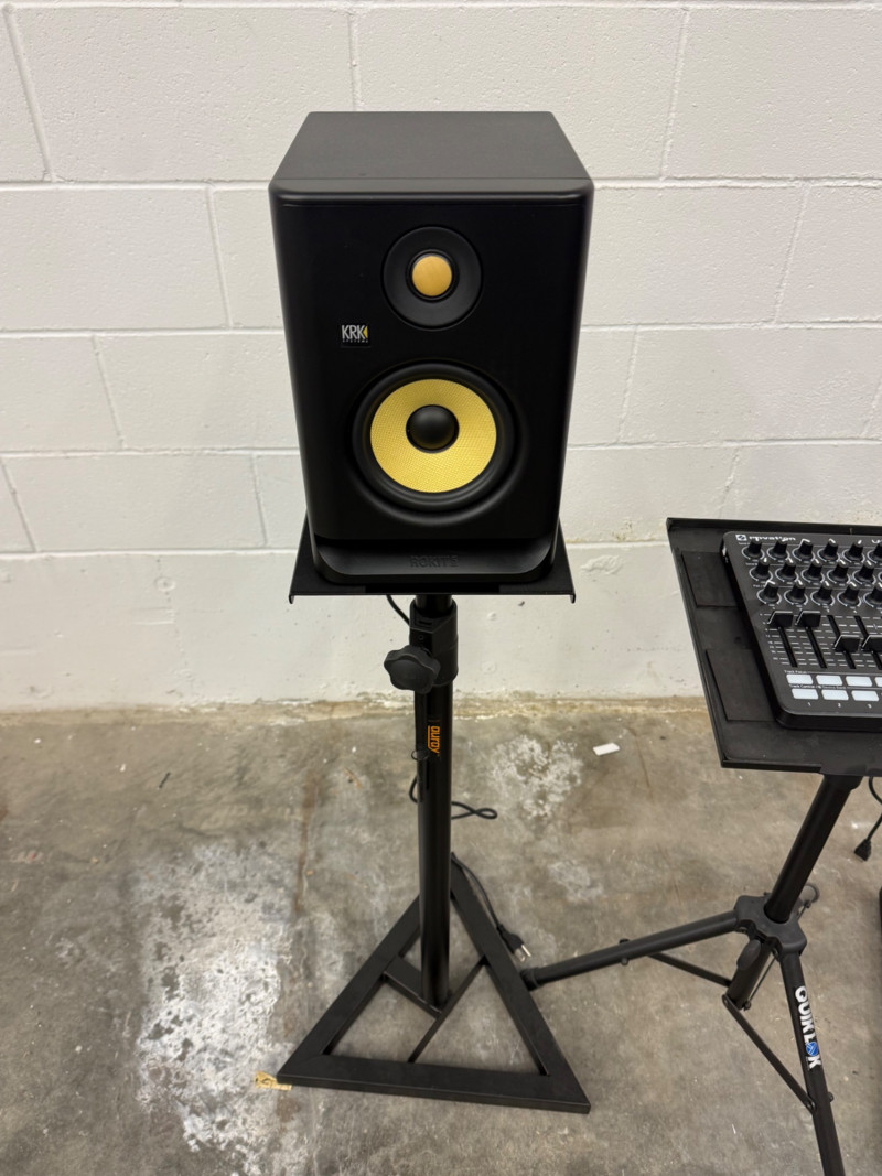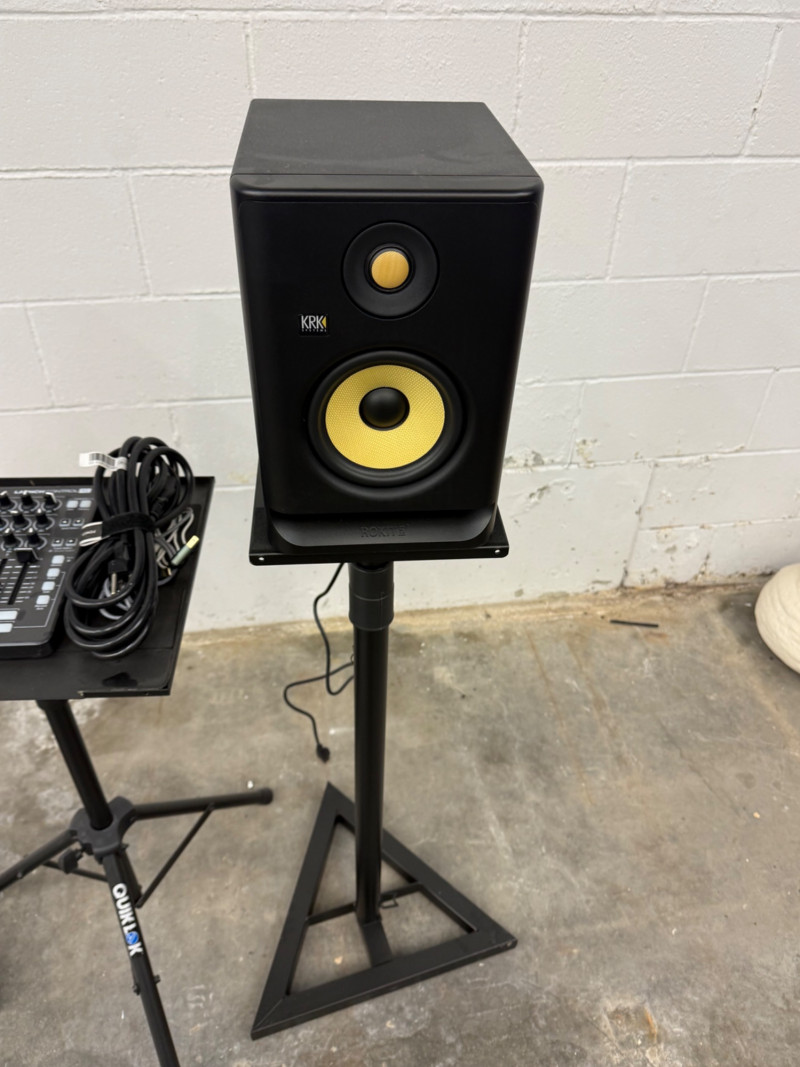 A ready-to-go studio monitor package for music production, mixing, or high-quality home audio. This set includes two KRK Rokit 5 powered studio monitors, known for their iconic yellow Kevlar woofers and accurate sound reproduction, plus a compact mixer/controller and sturdy adjustable-height stands. Details: Brand: KRK (Rokit 5 series) (2) Powered studio monitors with 5" woofers Compact mixer/controller with multiple input/output options Includes power and audio cables Heavy-duty, height-adjustable stands with triangular weighted bases for stability Mixer stand included Condition: Light wear consistent with studio use. Tested and powers on. Measurements: Speakers: approx. 11.2" H x 7.5" W x 9.5" D Stands: adjustable height, approx. 28" – 48" Estimated New Value: KRK Rokit 5 G4 Studio Monitors retail $400–$450 (pair) Mixer/controller retail $100–$150 Stands retail $75–$100 Total new value: $575–$700+ Why You’ll Love It: