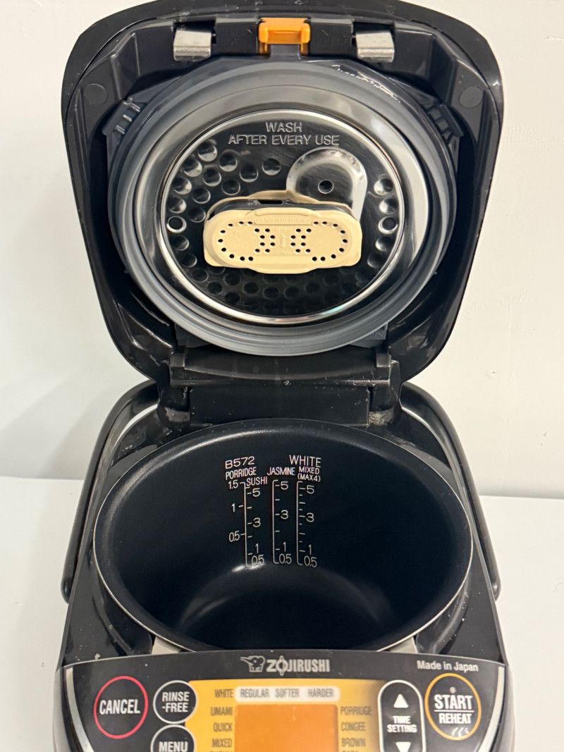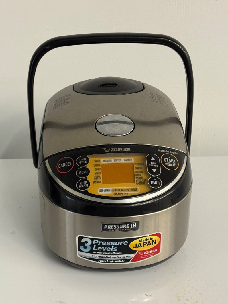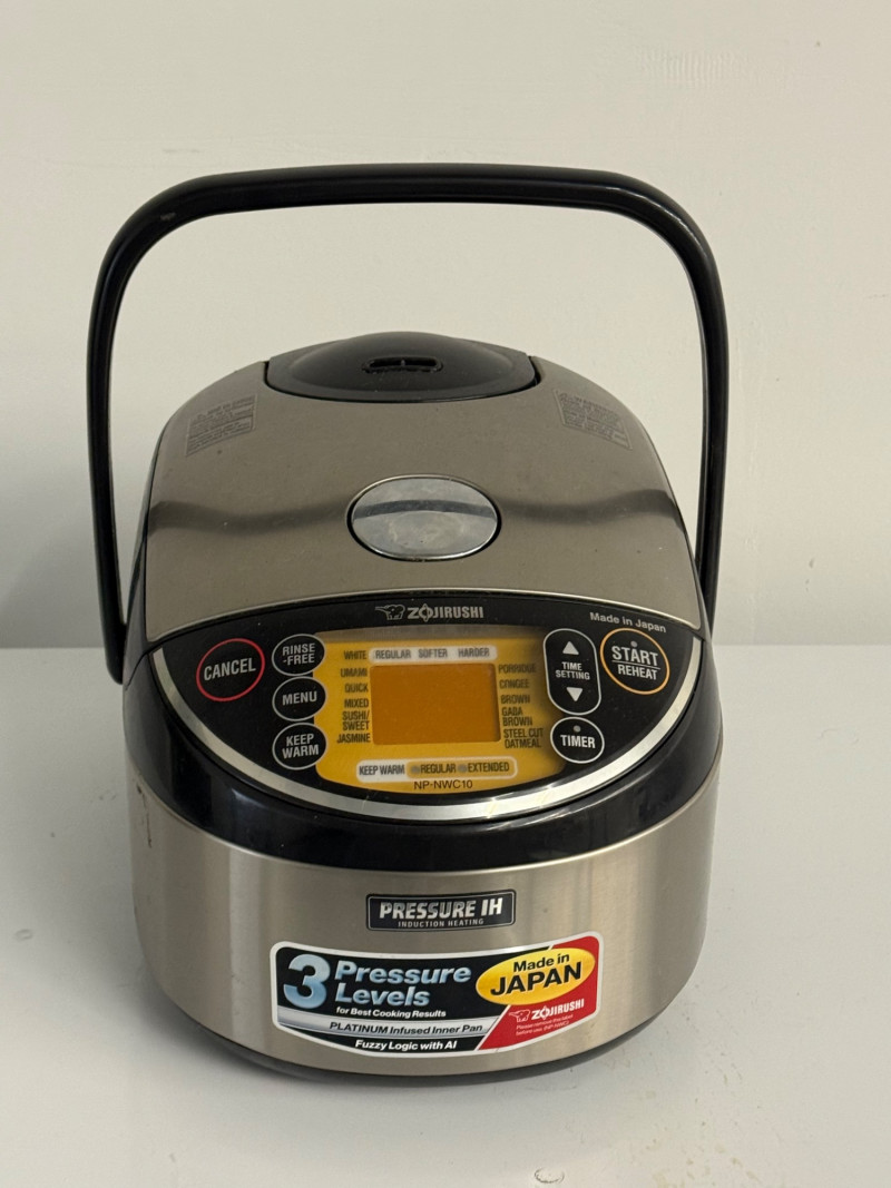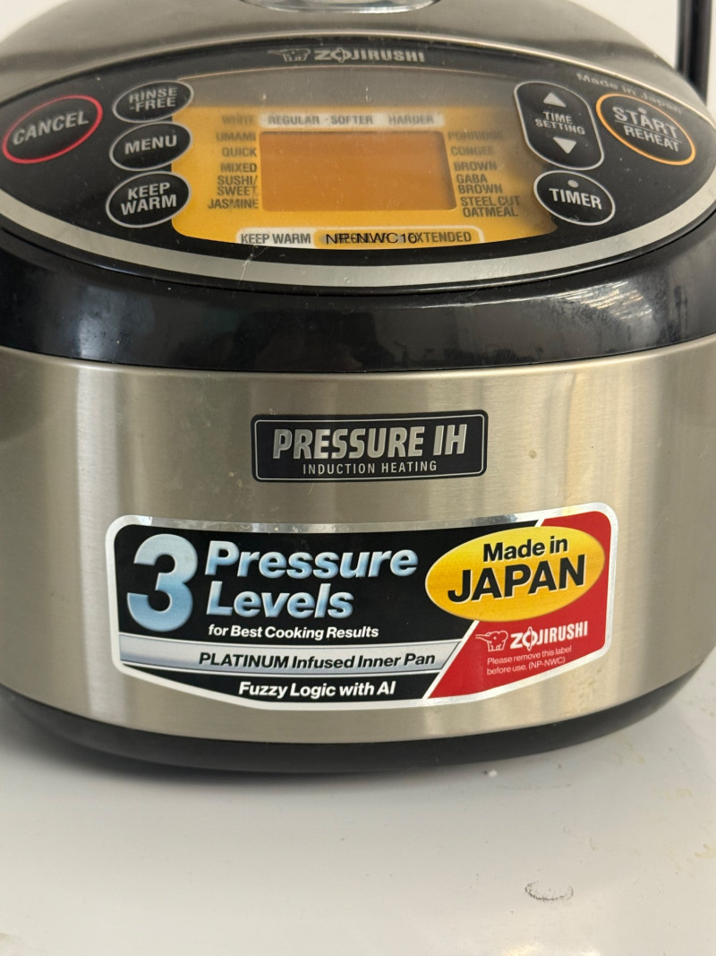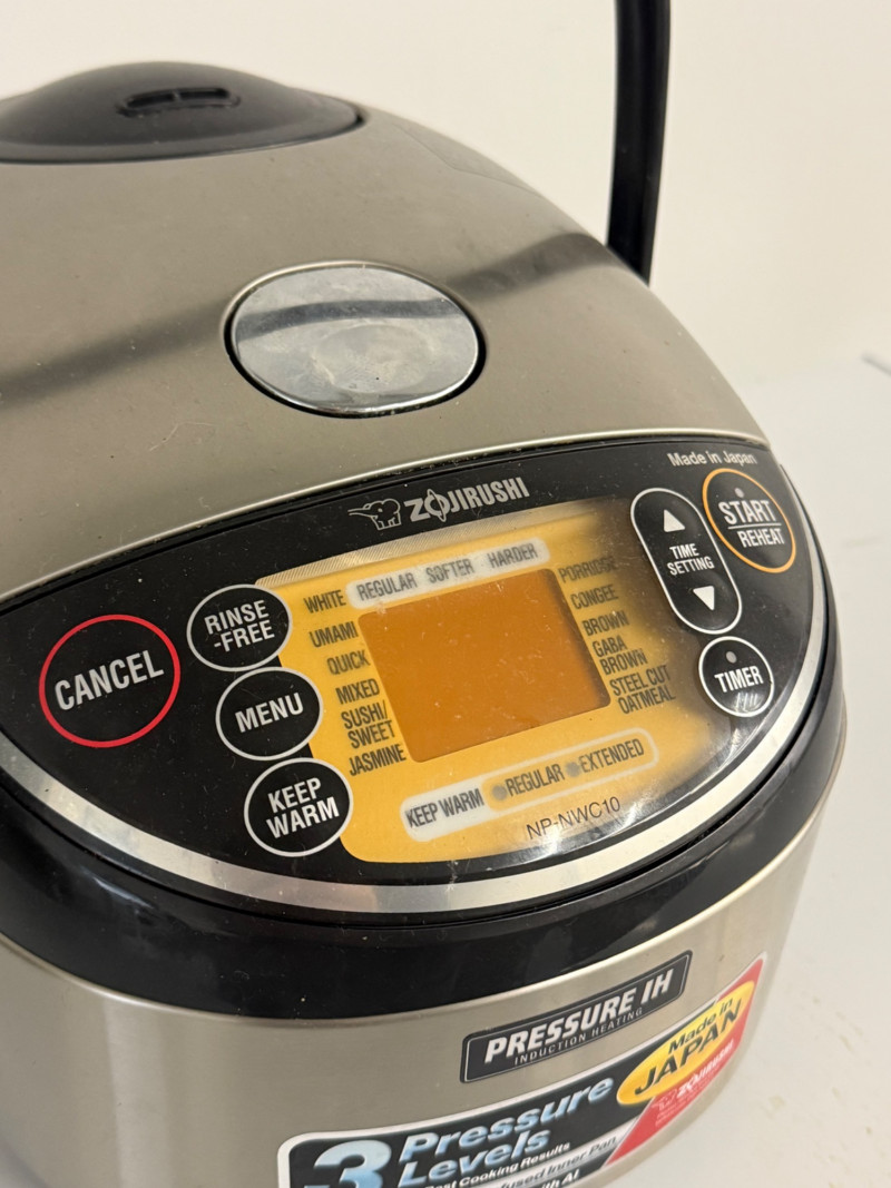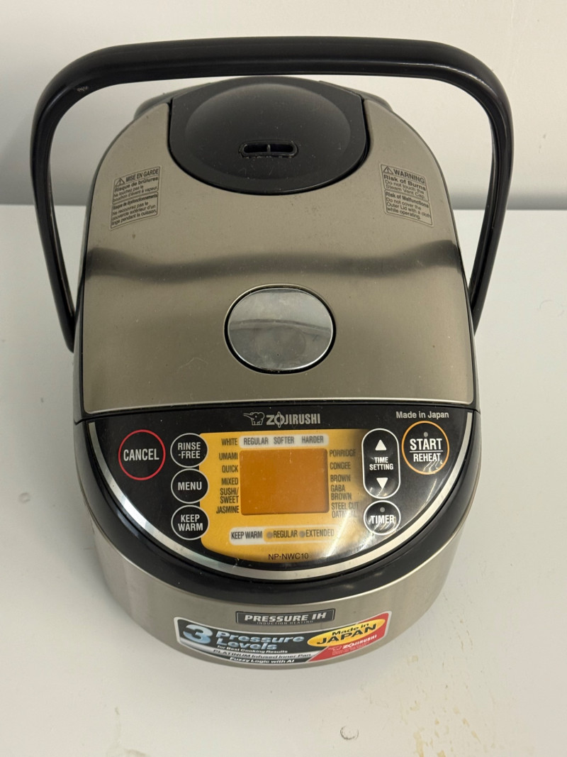 Bring world-class Japanese engineering to your kitchen with this Zojirushi NP-NWC10 pressure induction heating rice cooker. Known as one of the best rice cookers on the market, this premium model uses advanced fuzzy logic AI and 3 pressure levels to deliver perfect rice and grains every time. Details: Brand: Zojirushi Model: NP-NWC10 Made in Japan 3 Pressure Levels for optimal cooking results Induction Heating + Platinum Infused Inner Pan for even heat distribution Multiple cooking functions: white rice, sushi rice, brown rice, GABA brown, steel cut oatmeal, porridge, jasmine rice, quick cook, and more Keep warm (regular & extended) and reheat functions Carry handle for portability Capacity: approx. 5.5 cups (uncooked) Condition: Light exterior wear from normal use (see photos). Powers on, buttons and display responsive. Estimated New Value: This model retails $480–$520 new. Why You’ll Love It: