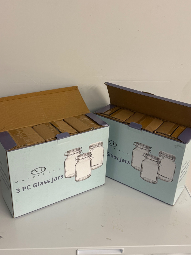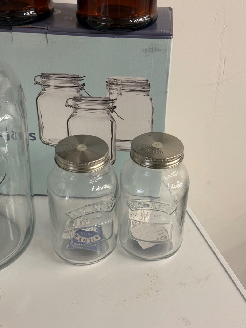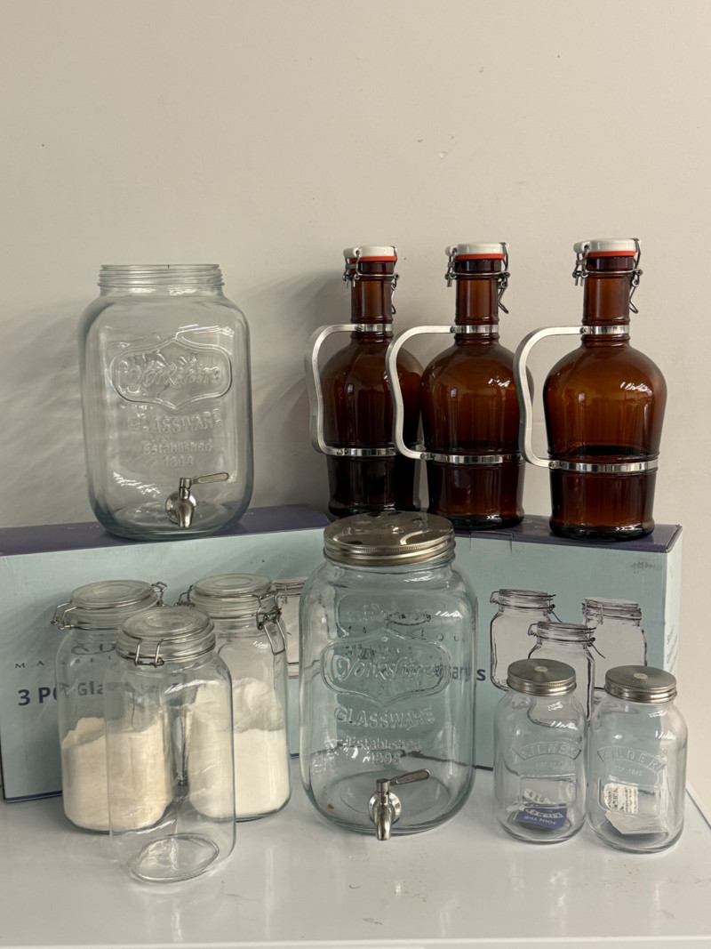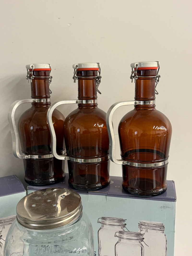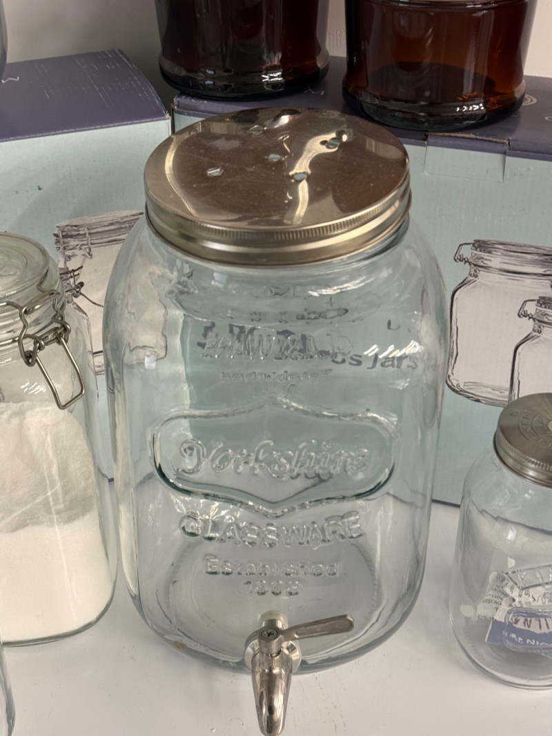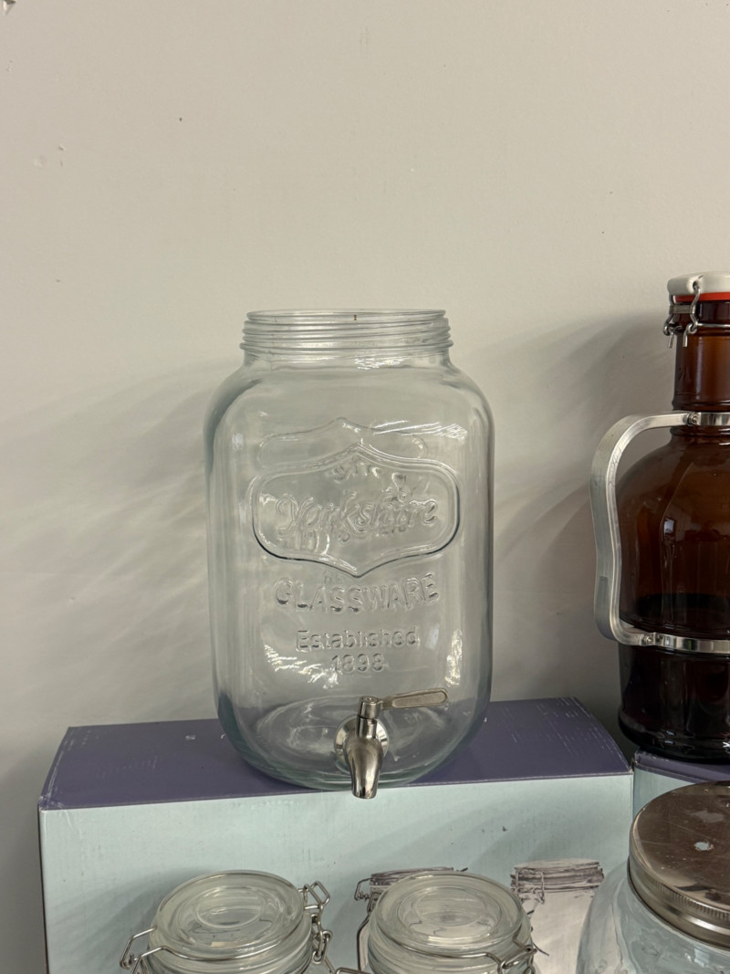 Glass Beverage Dispensers, Amber Growlers & Storage Jar Lot – Some New in Box A versatile collection perfect for entertaining, brewing, or stylish kitchen storage. This lot includes glass beverage dispensers with spigots, amber glass growlers with secure swing-top closures, and a variety of clip-top and screw-top storage jars. Details: 2 Yorkshire Glassware Beverage Dispensers with Spigots (1 with lid, 1 open) – Approx. 1.5–2 gallons each 3 Amber Glass Growlers with Metal Carriers & Swing-Top Lids – Great for home brewing, kombucha, or draft storage Set of 3 Clip-Top Glass Storage Jars – Ideal for dry goods (flour, sugar, coffee, etc.) 2 Kilner Glass Jars with Screw Tops – Classic, durable UK-made storage Unopened Boxed Sets: Includes one 3-piece storage jar set and an additional sealed beverage dispenser still in original packaging Condition: Several jars and dispensers are unused or unopened in original boxes. Opened items show light storage wear, clean and ready for use. Estimated Value: Similar sets retail $120–$150 total when purchased new. Why You’ll Love It:
