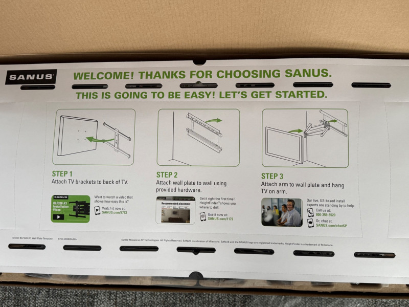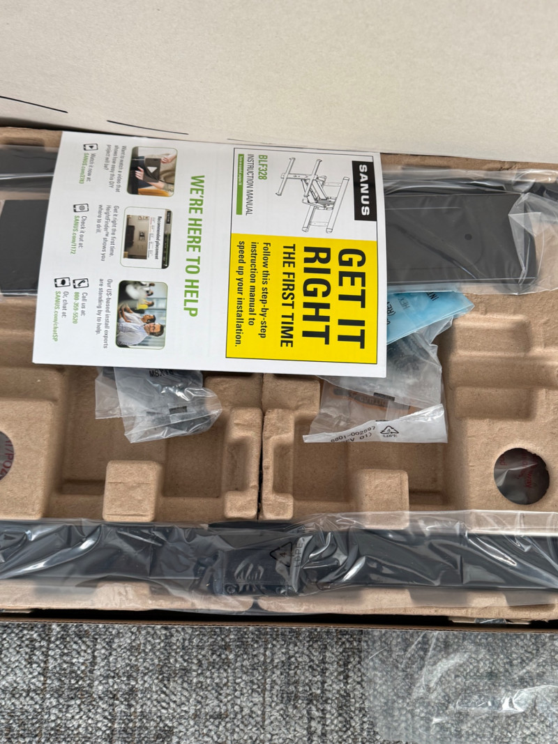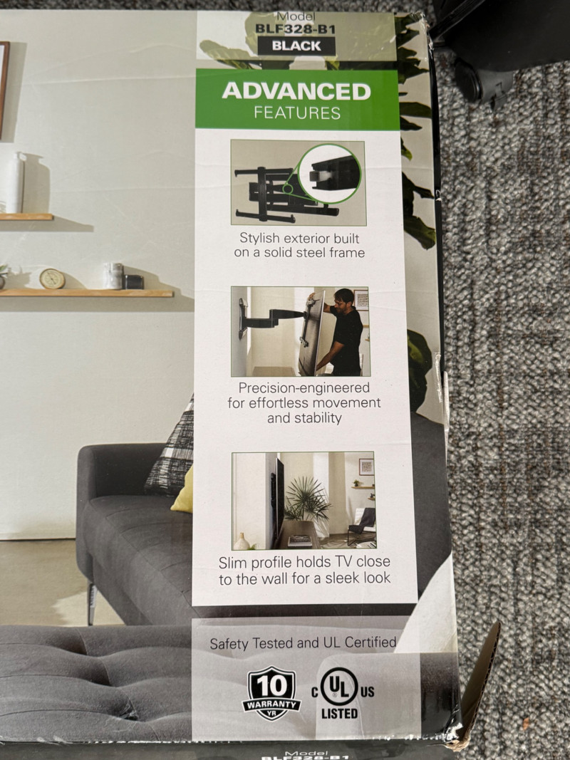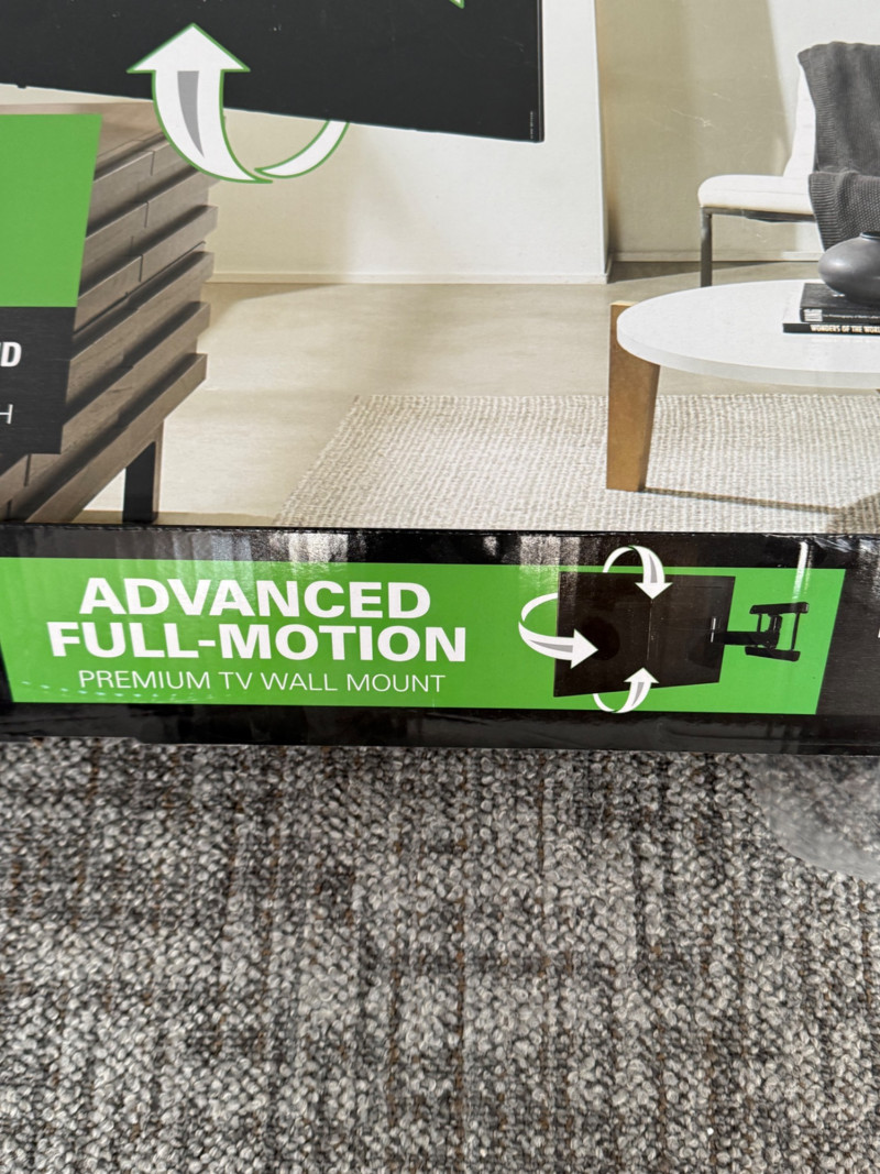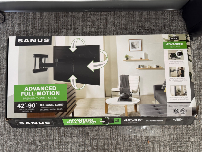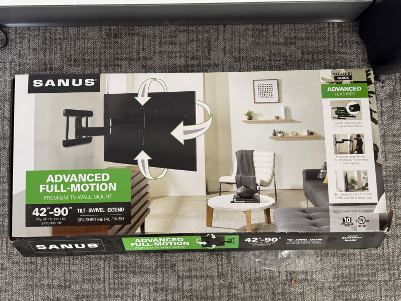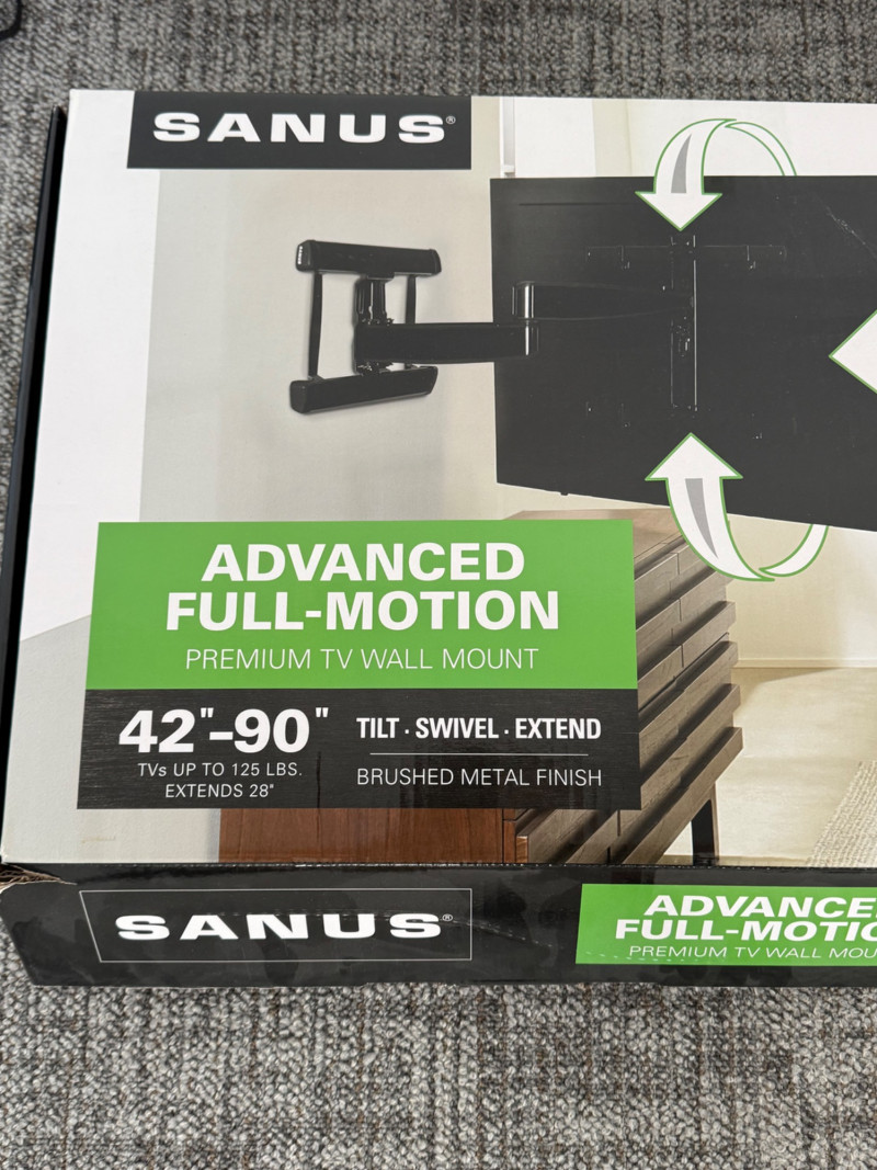 Upgrade your viewing experience with this Sanus Advanced Full-Motion TV Wall Mount, designed for flexibility, durability, and style. Features: Fits TVs 42"–90" (up to 125 lbs) Tilt, swivel, and extend functions for optimal viewing angles Extends up to 28" from the wall Brushed metal finish for a sleek, modern look Slim profile keeps TV close to the wall when retracted Precision-engineered for smooth, stable adjustments Safety Tested & UL Certified for secure installation Stylish steel frame design Estimated Value: Retail Price (new): $249 – $299 Why You’ll Love It:
