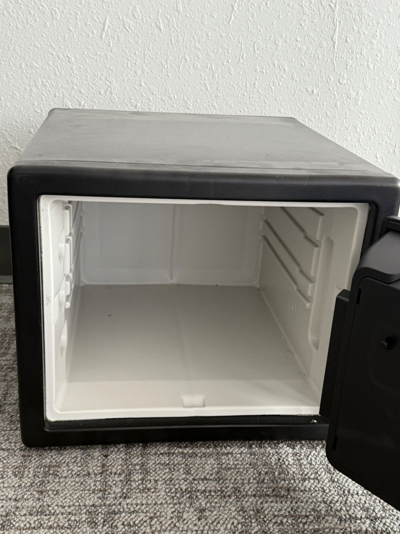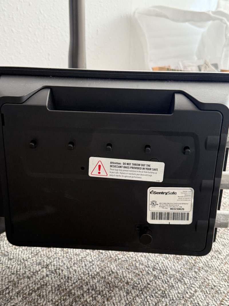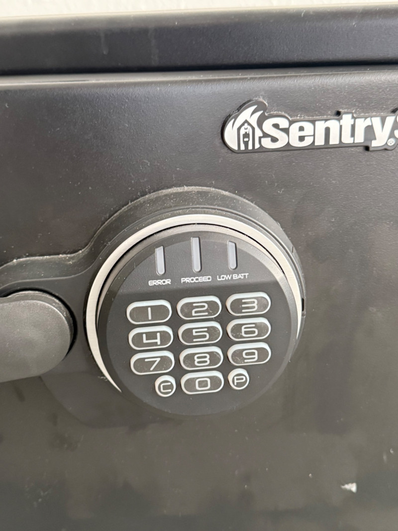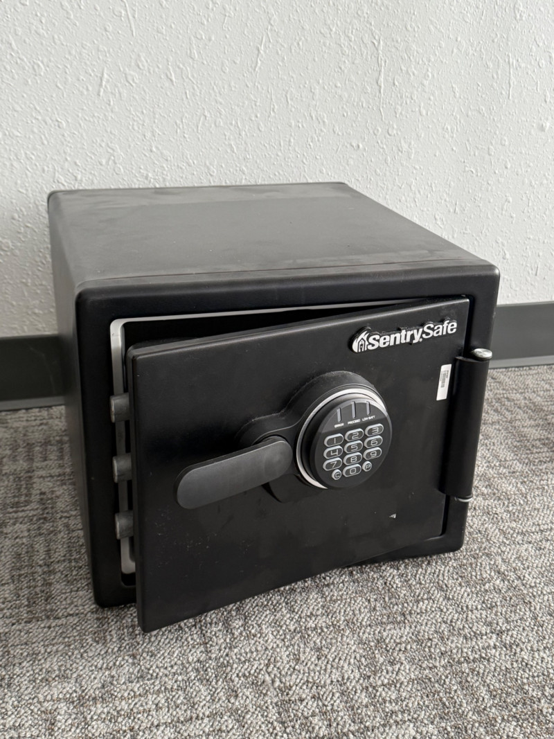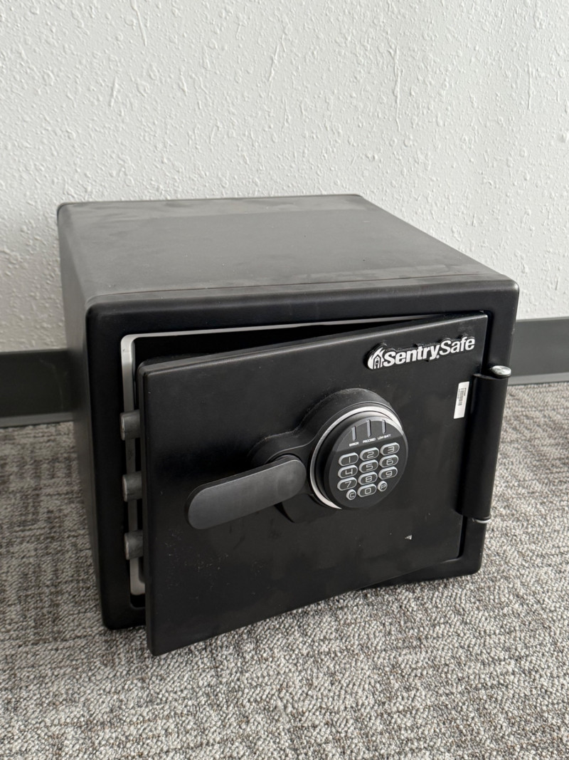 Exterior Dimensions: 16.3" H × 19.3" W × 17.8" D Interior Dimensions: 12.6" H × 15.3" W × 11.9" D Weight: around 85 lbs Condition: Used, some surface wear (see photos), but keypad and locking mechanism appear intact. Key not shown — buyer may need to reset code or obtain replacement key from SentrySafe if necessary.