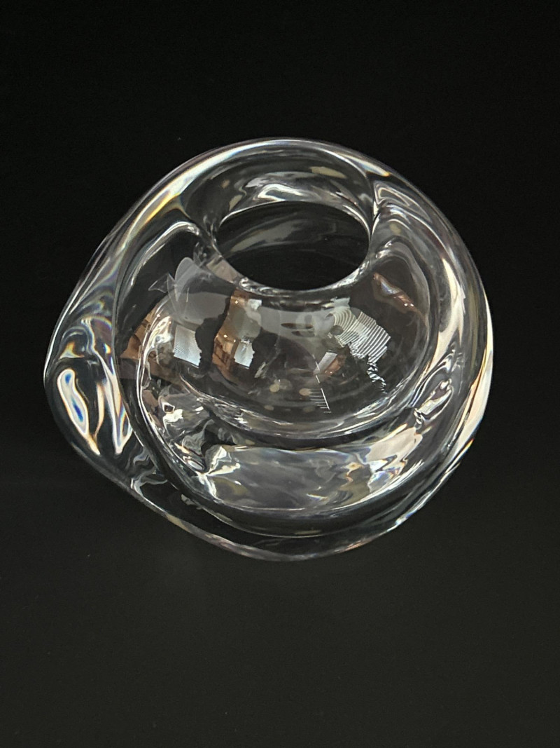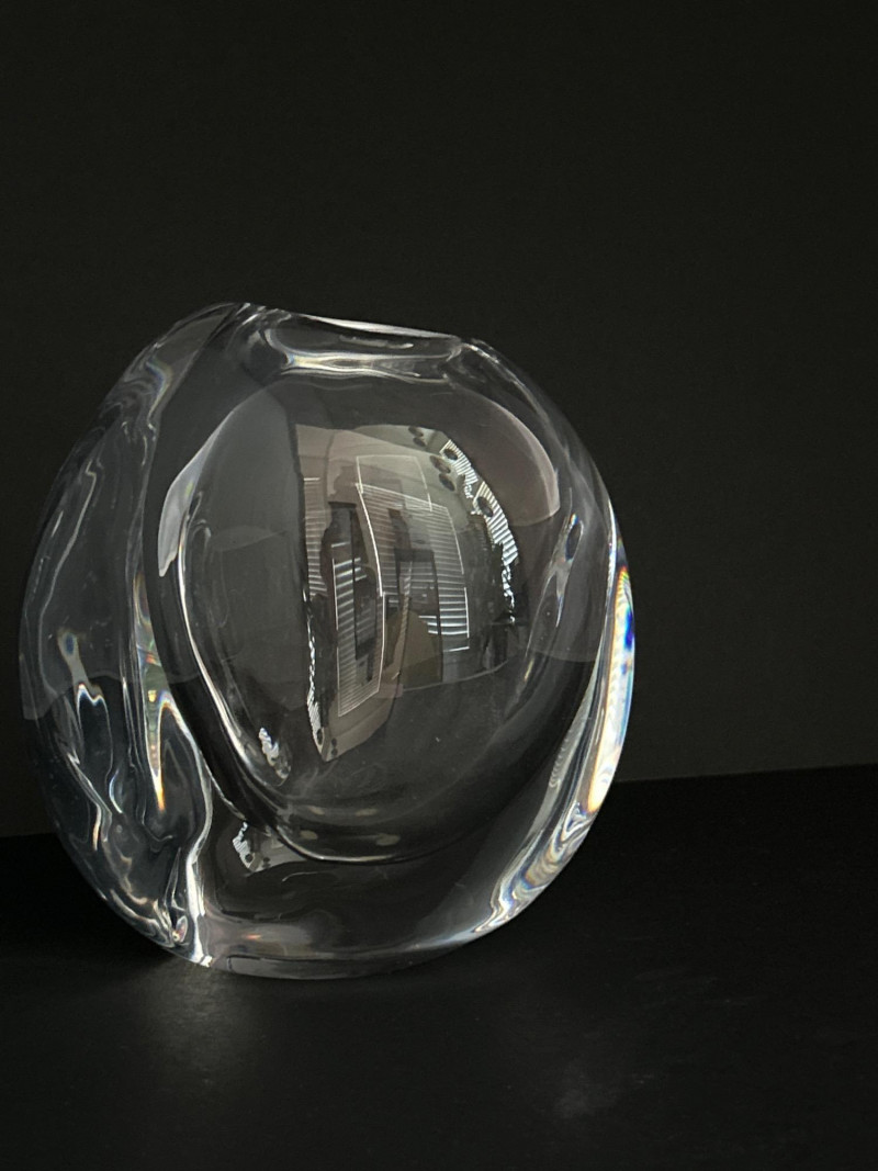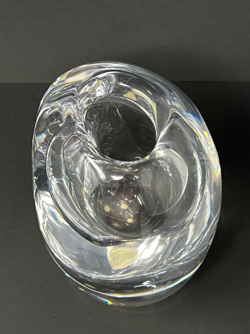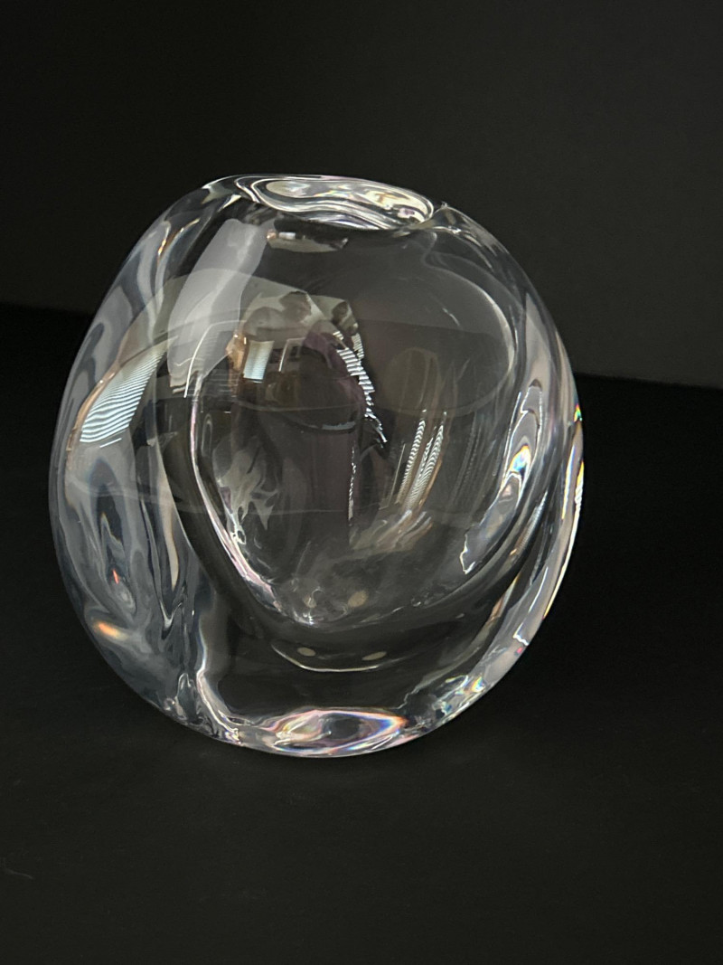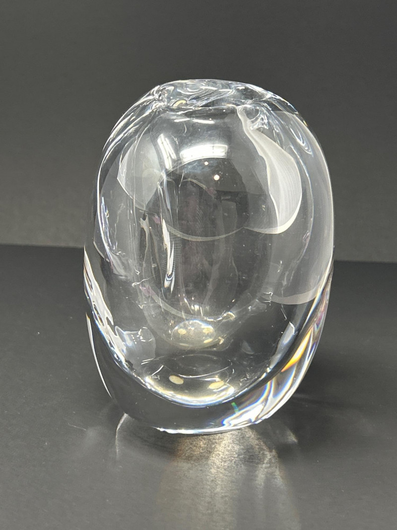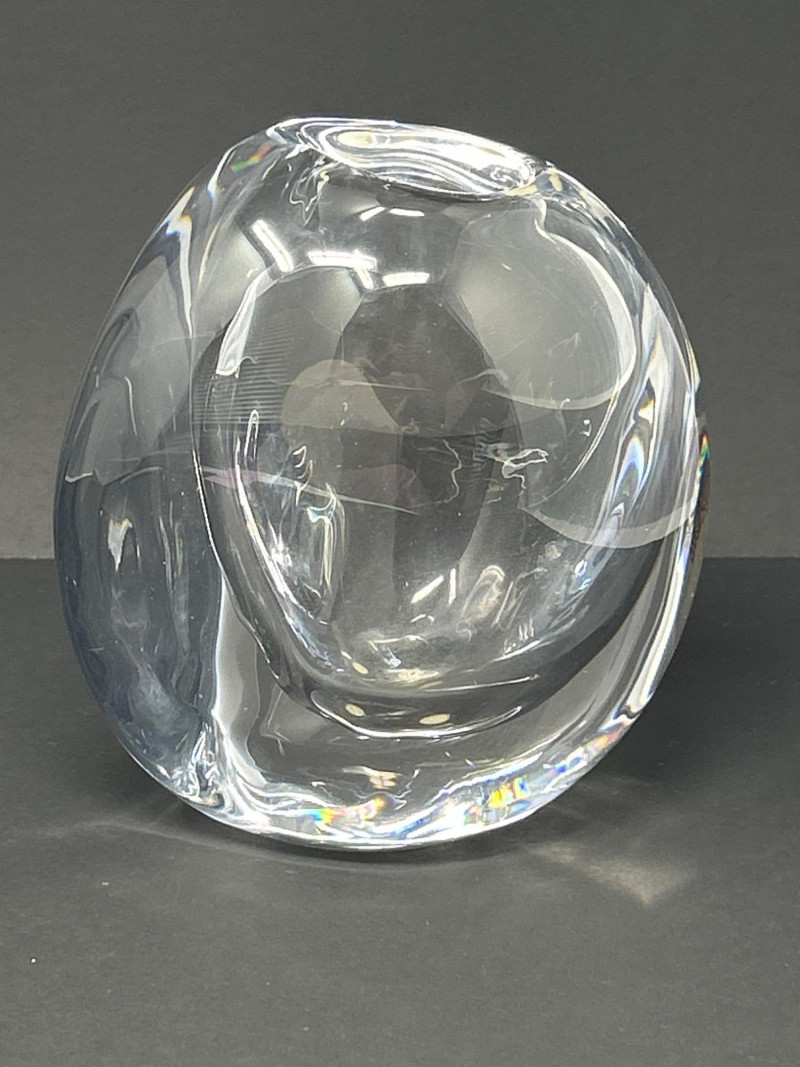 A masterwork of Swedish modernist glass, this hand-blown crystal vase by Göran Wärff for Kosta Boda exemplifies the fluid elegance of the “Warp” series. Its asymmetrical contours and organic curvature refract light with sculptural brilliance, echoing Wärff’s lifelong fascination with water and movement. Signature: Etched “Kosta Boda Art 43885 Wärff” on base Dimensions: Approx. 6" H × 7" W × 4" D Material: Hand-blown lead crystal About the Artist: