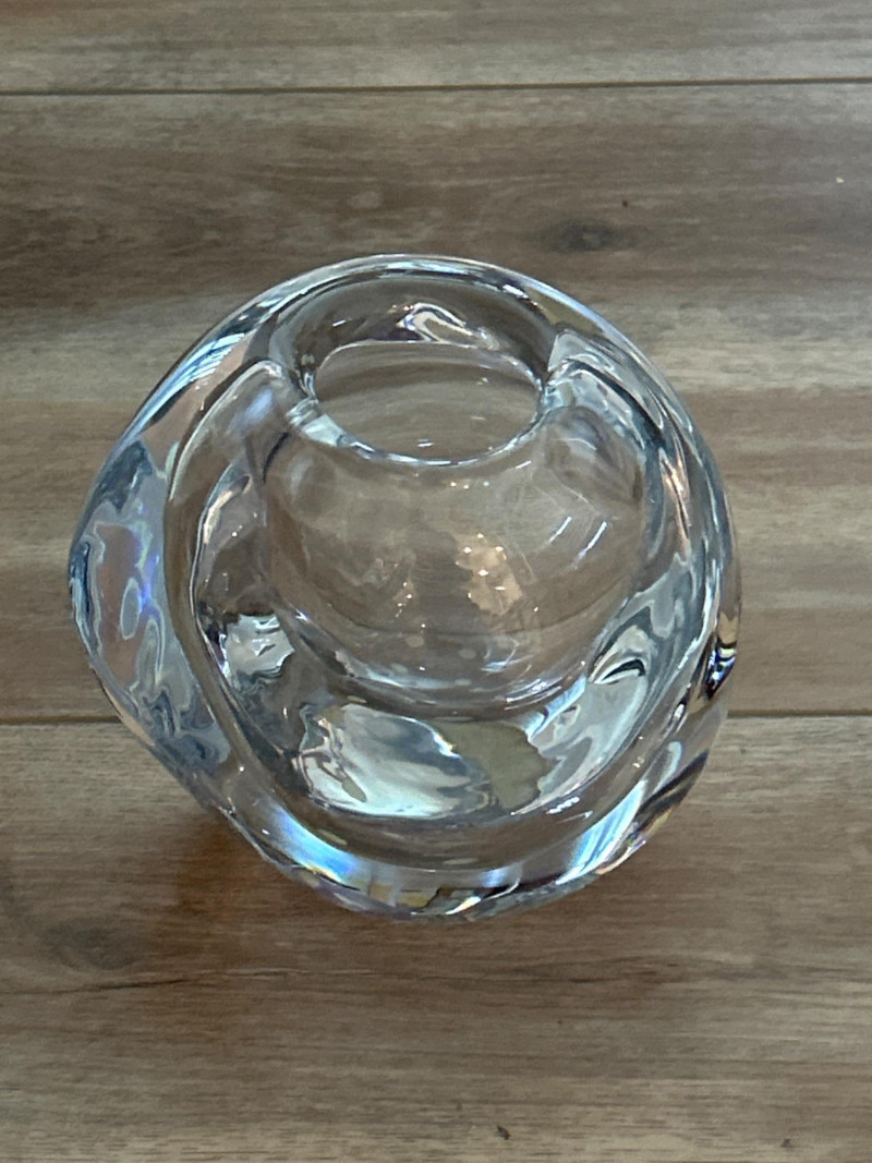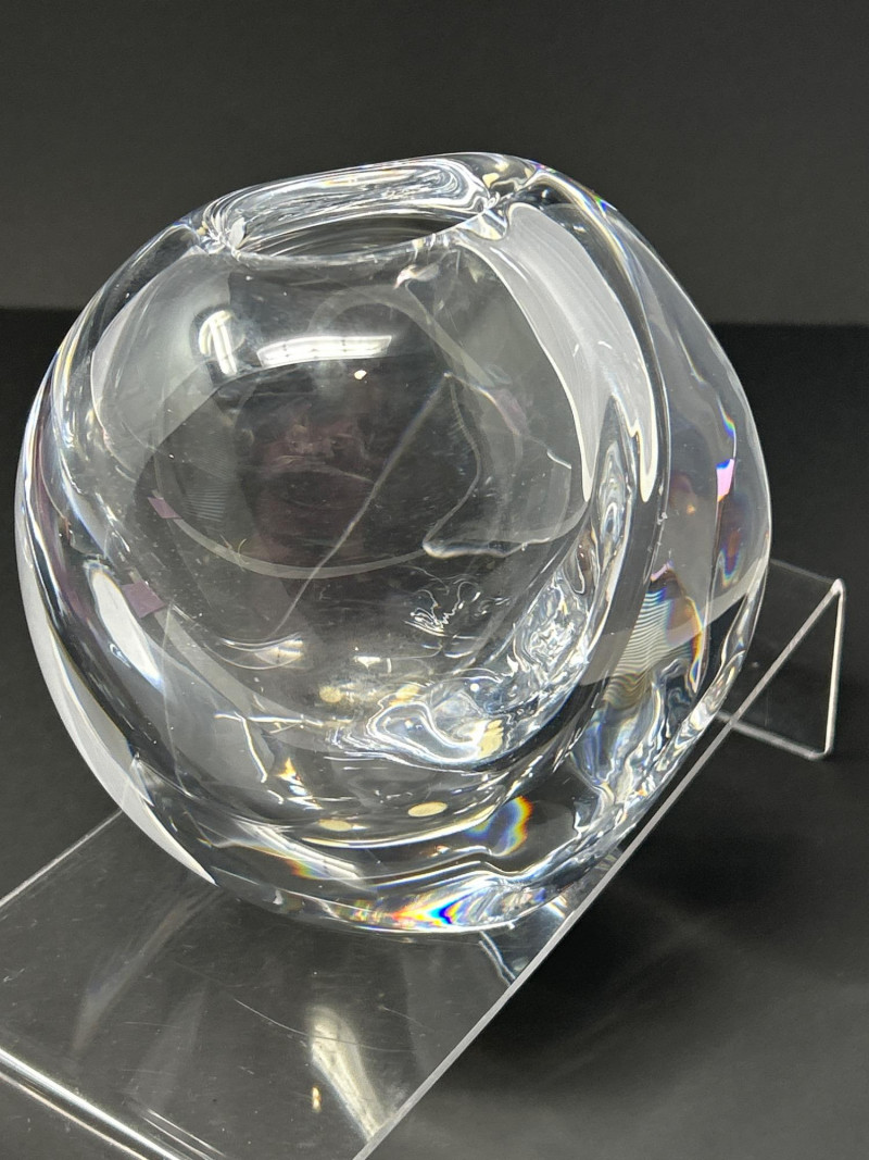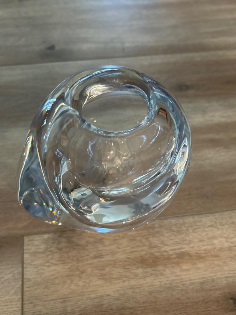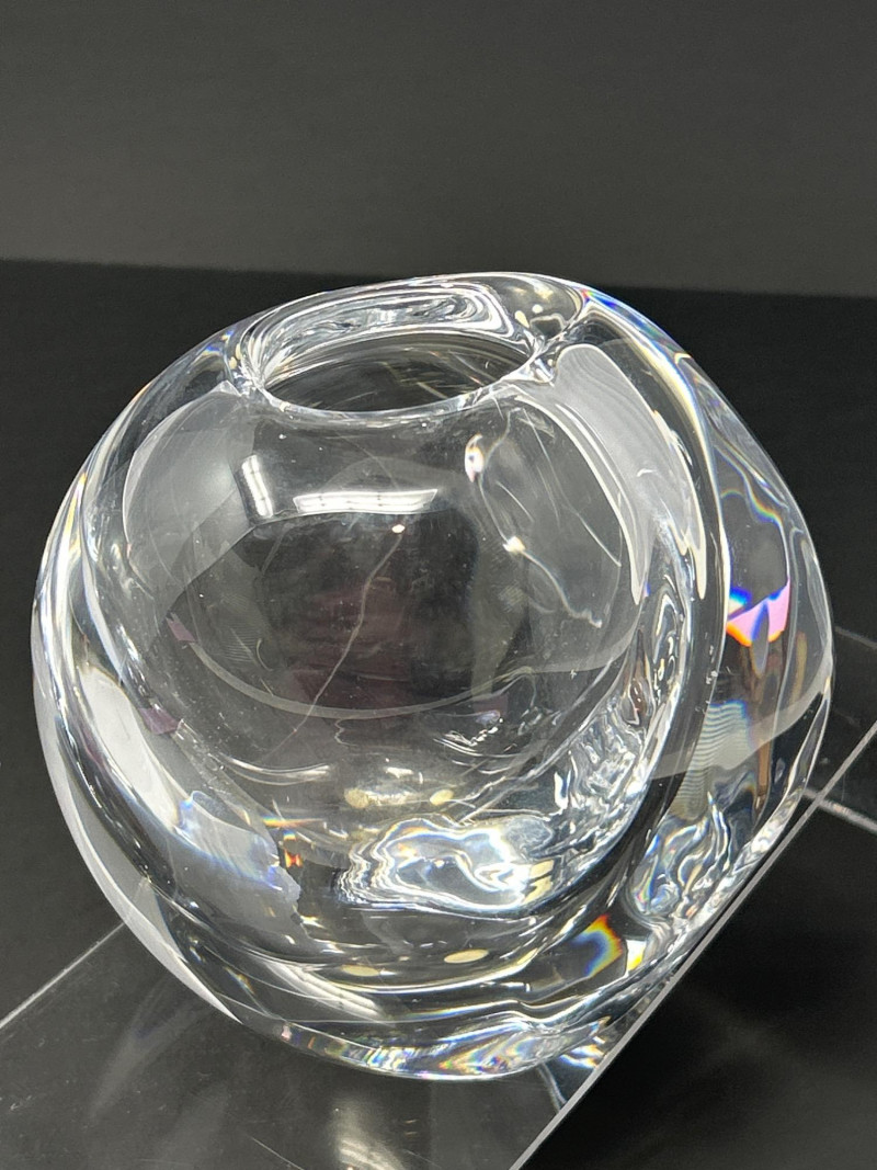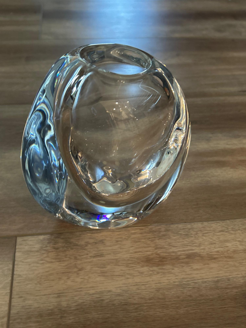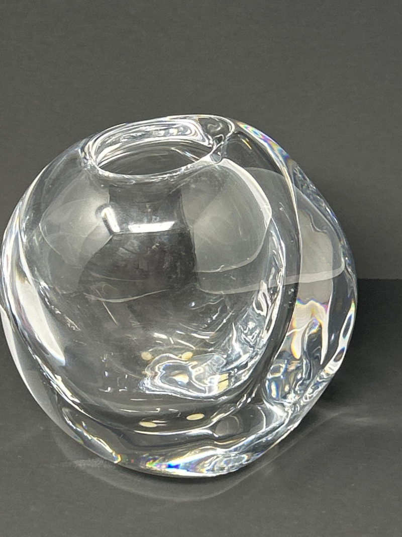 A masterwork of Swedish modernist glass, this hand-blown crystal vase by Göran Wärff for Kosta Boda exemplifies the fluid elegance of the “Warp” series. Its asymmetrical contours and organic curvature refract light with sculptural brilliance, echoing Wärff’s lifelong fascination with water and movement. Signature: Etched “Kosta Boda Art 43885 Wärff” on base Dimensions: Approx. 6" H × 7" W × 4" D Material: Hand-blown lead crystal About the Artist: