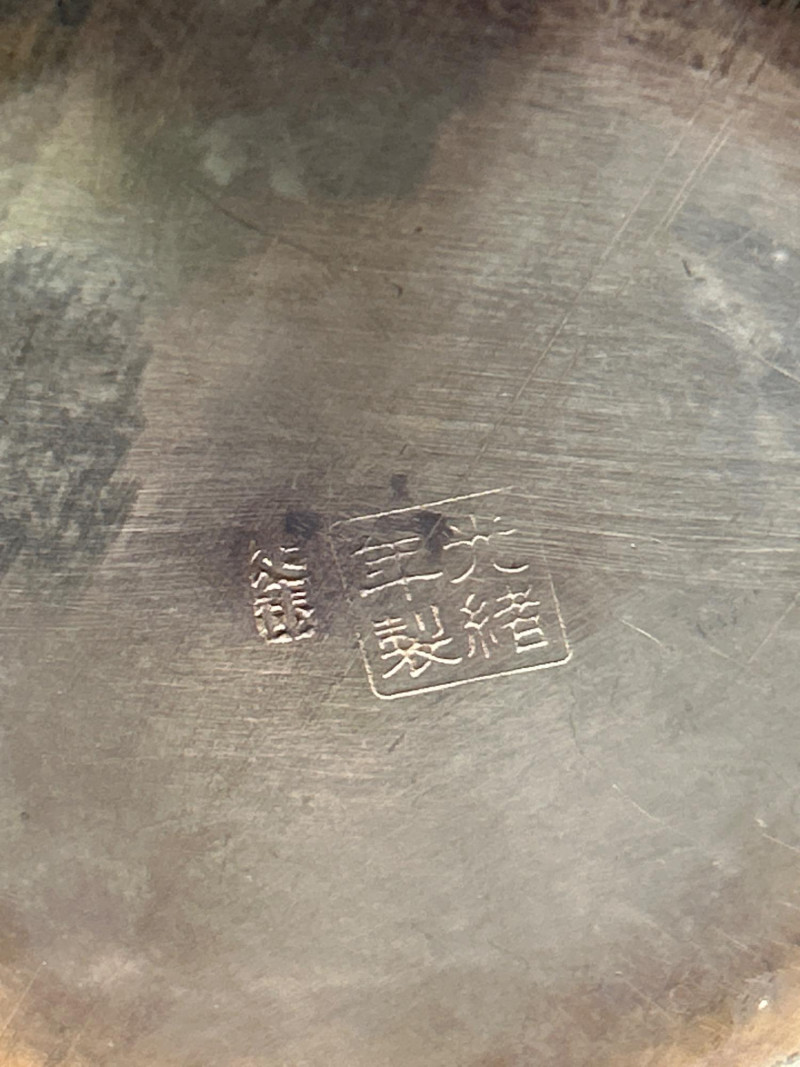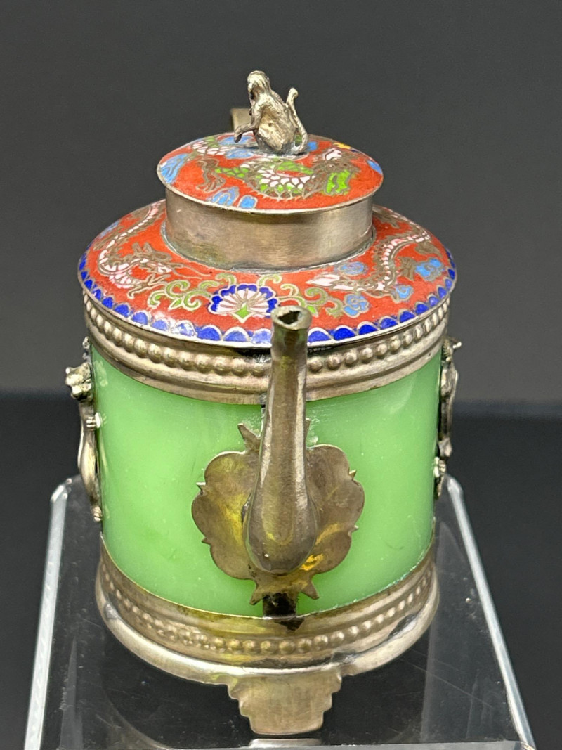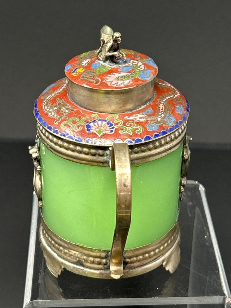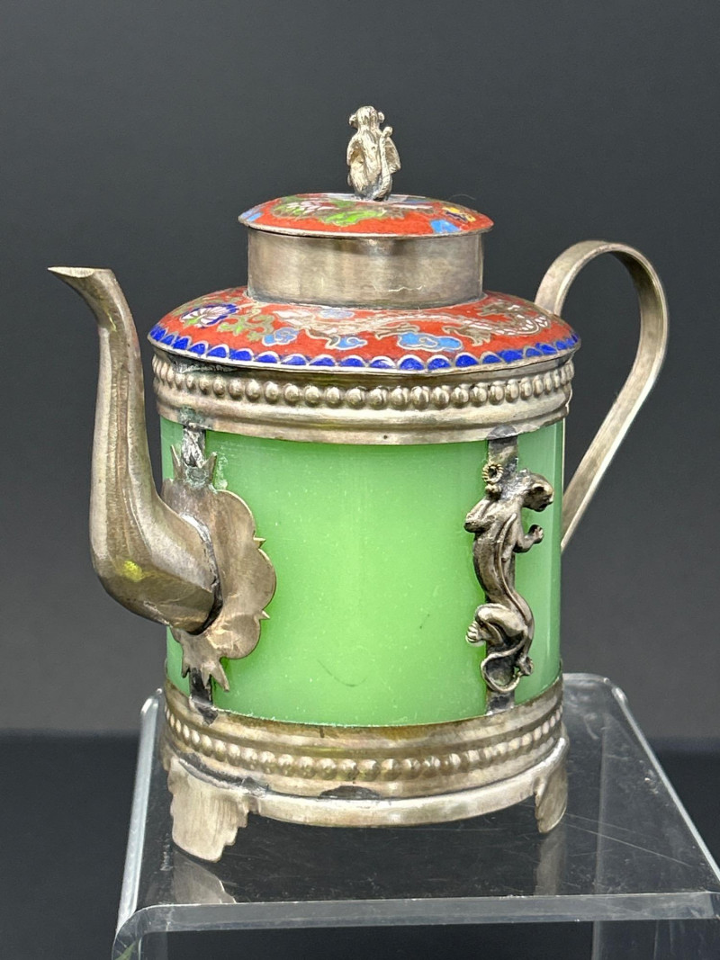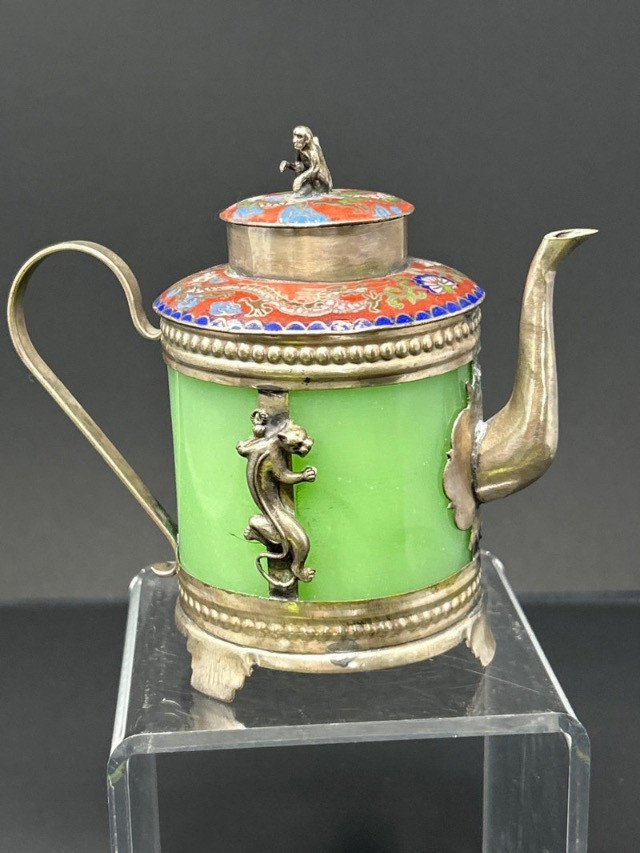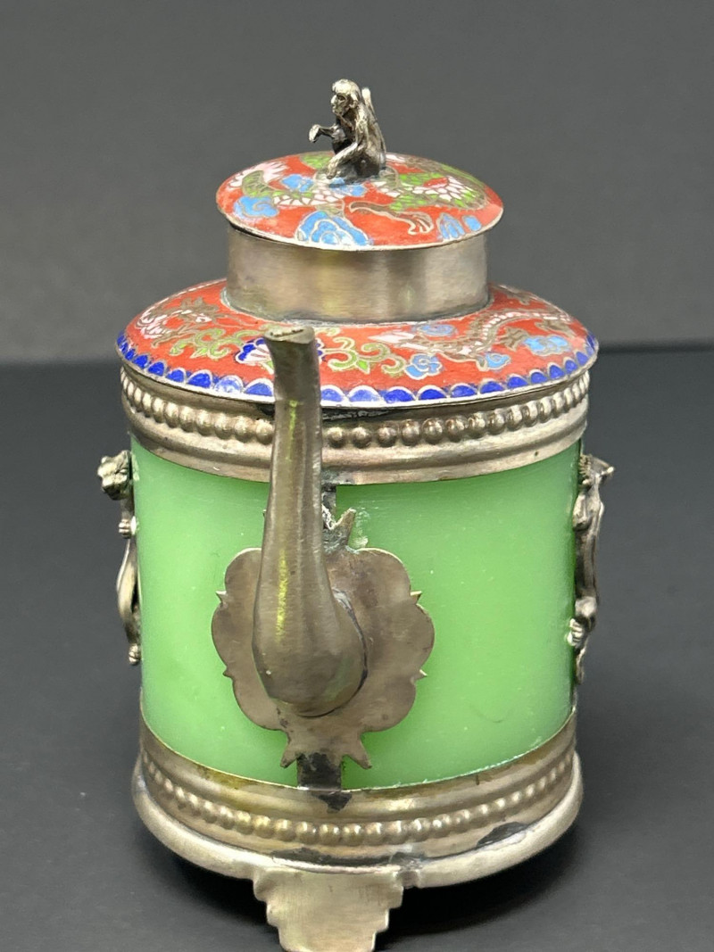 A late-Qing cloisonné-style teapot of cylindrical form, crafted in mixed metal with vivid enamel work and symbolic ornamentation. The apple-green glass (or jadeite-hued) body is framed by silver-tone mounts, while the lid and shoulder are adorned with vibrant red, turquoise, and cobalt enamel featuring scrolling florals and five-clawed imperial dragons—symbols of power and auspiciousness. The lid is topped with a finely modeled monkey finial, a clever nod to promotion and nobility (猴 hóu, homophonous with 侯 “marquis”). Applied climbing dragons in high relief flank both sides of the vessel, embodying guardianship and prosperity. The spout features a lotus-form mount, and the handle is gracefully curved in silvered metal. Underside bears a four-character Guangxu mark (光绪年制), dating the piece to circa 1880–1910. Dimensions: Height (to finial): approx. 6.75 inches (17 cm)