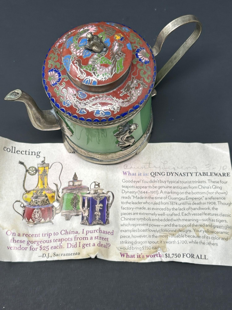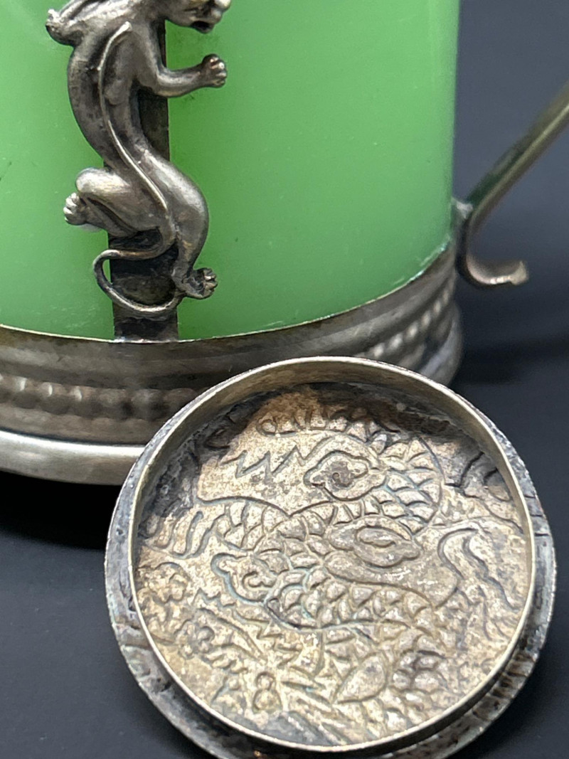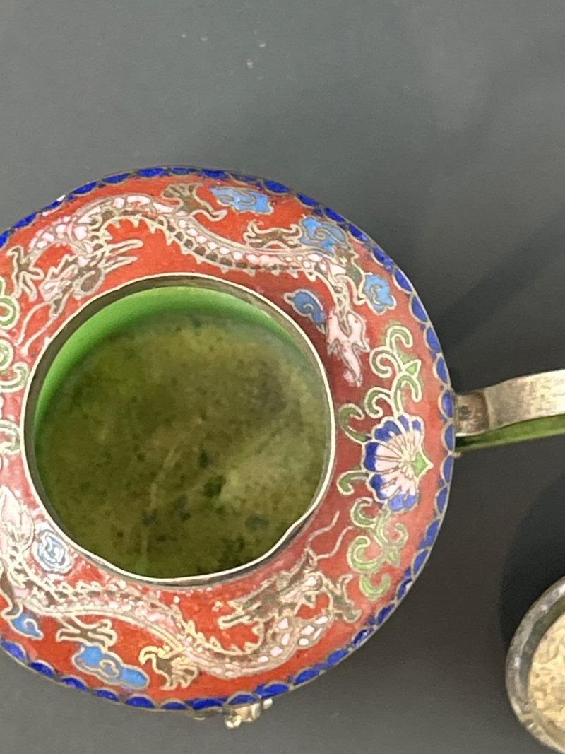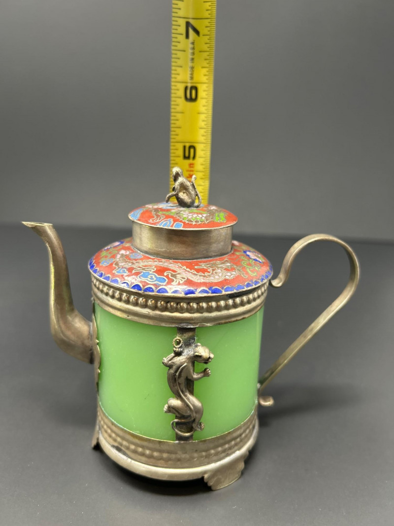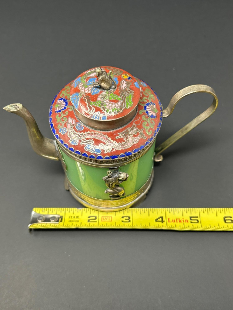 Diameter: approx. 3 inches (7.5 cm) This teapot exemplifies the fusion of Qing imperial iconography with export-era craftsmanship. While functional in form, such pieces were often intended as decorative objects, prized for their vibrant enamel work and symbolic animal motifs. The green-glass body paired with red dragon accents is especially desirable among collectors for its auspicious color symbolism and rarity.Collector’s Insight: