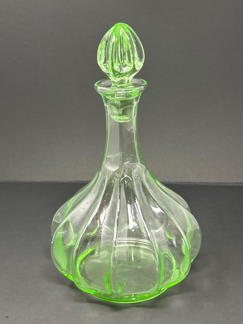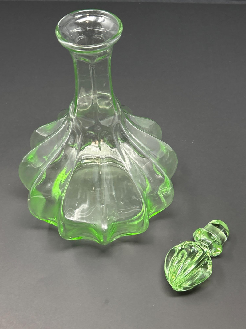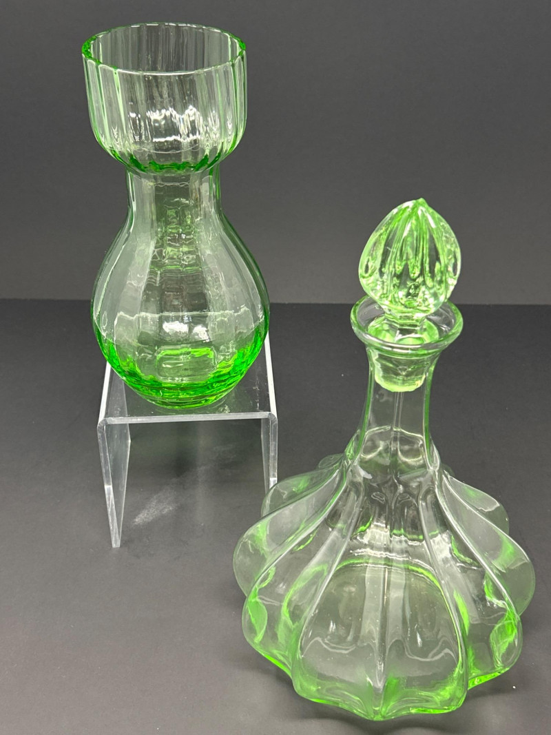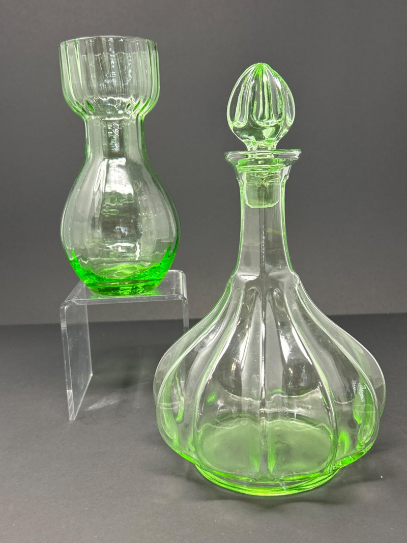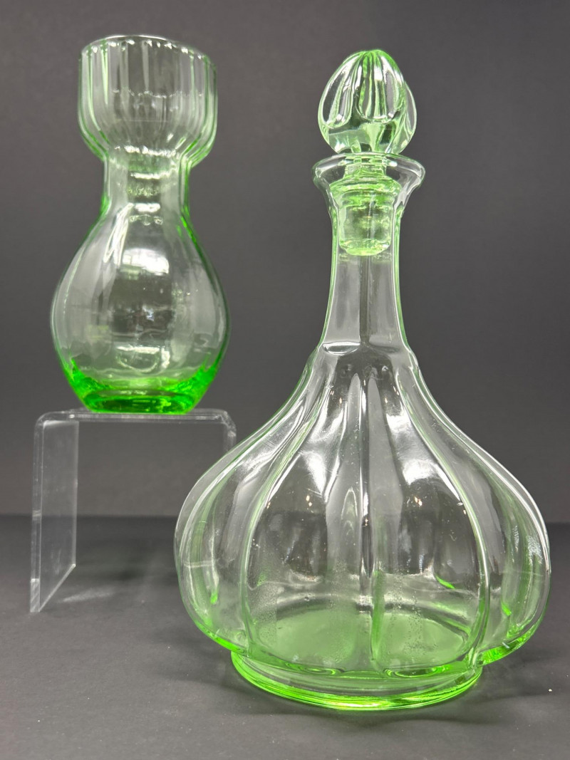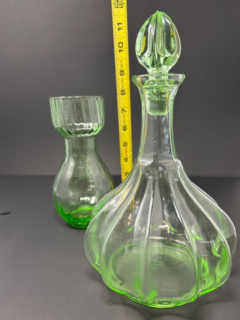 Lot # 10 - Mid-Century Green Glass Duo – Tiara Genie Bottle & Depression Carafe