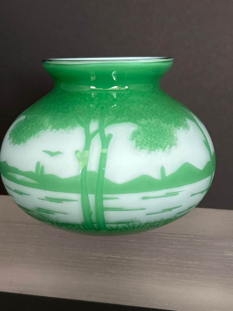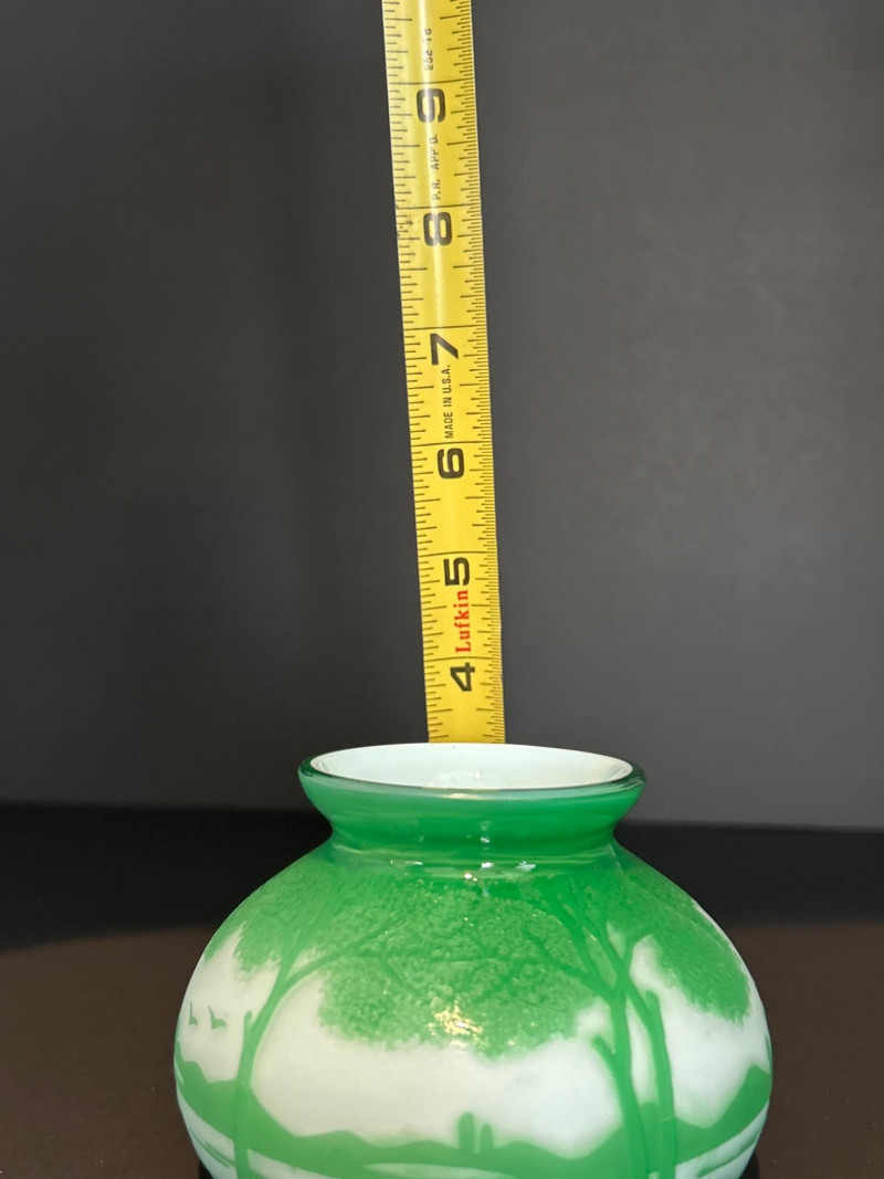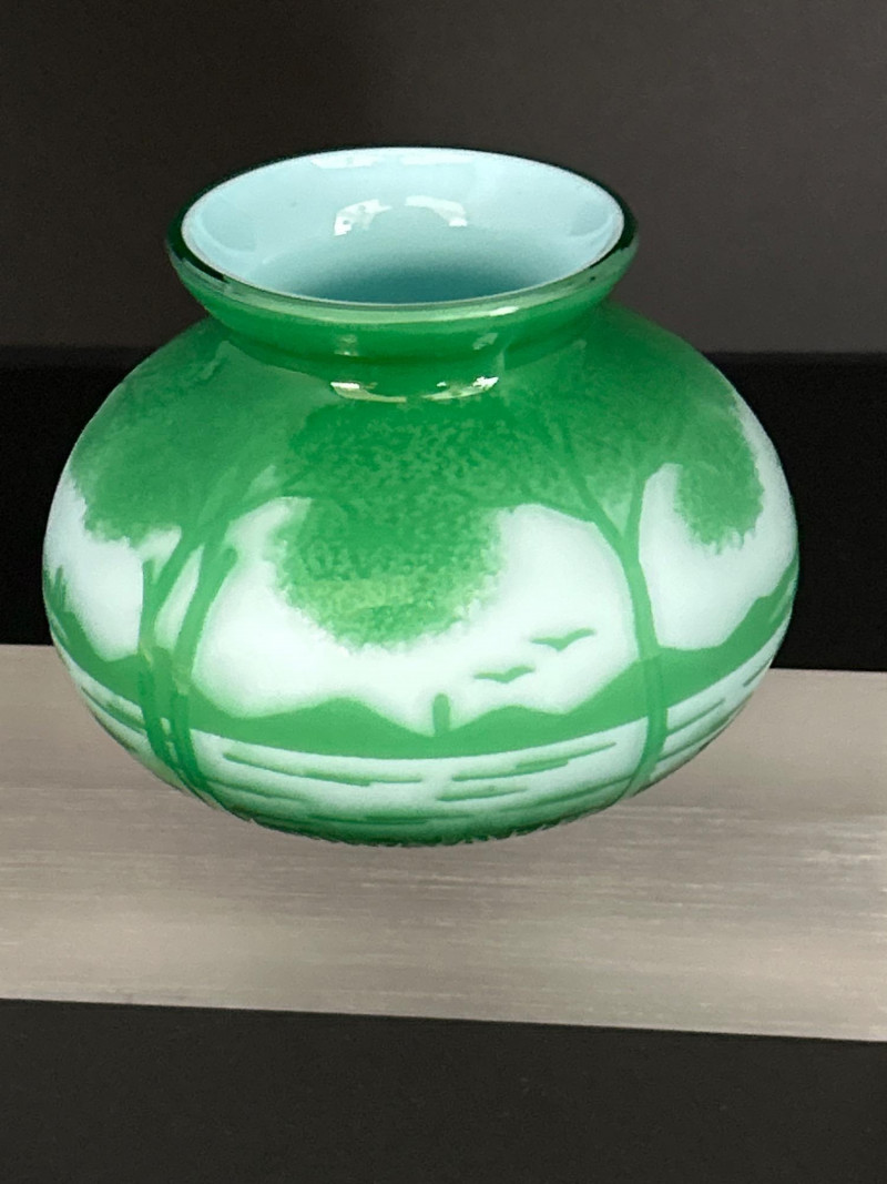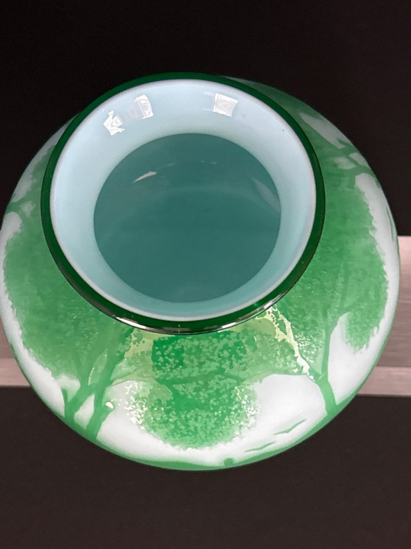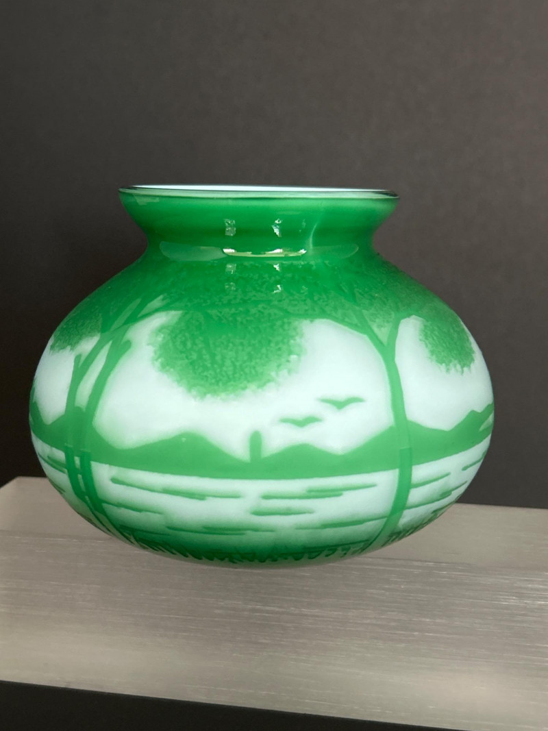 A finely executed art glass vase showcasing a vivid green-over-white cameo design with a tranquil etched landscape. The panoramic motif features trees, birds, and a distant horizon, rendered in layered glass with crisp acid-etched detailing. The interior is finished in a soft aqua blue, offering a serene contrast to the rich emerald overlay. Features: Material: Cameo glass (green overlay on white with blue interior) Color Scheme: Emerald green exterior with aqua-blue interior Form: Bulbous body, short neck, flared rim Dimensions: Height: Approx. 5½ inches Diameter: Approx. 4¾ inches (widest point) Opening: Approx. 2⅞ inches Collecting Note: This piece reflects the nature-inspired elegance of early 20th-century European decorative glass, reminiscent of French Art Nouveau and Art Deco traditions. The layered cameo technique and pastoral etching evoke the refined craftsmanship of makers such as Legras, Gallé, and Daum Nancy. Ideal for collectors of period glass or revivalist studio works.