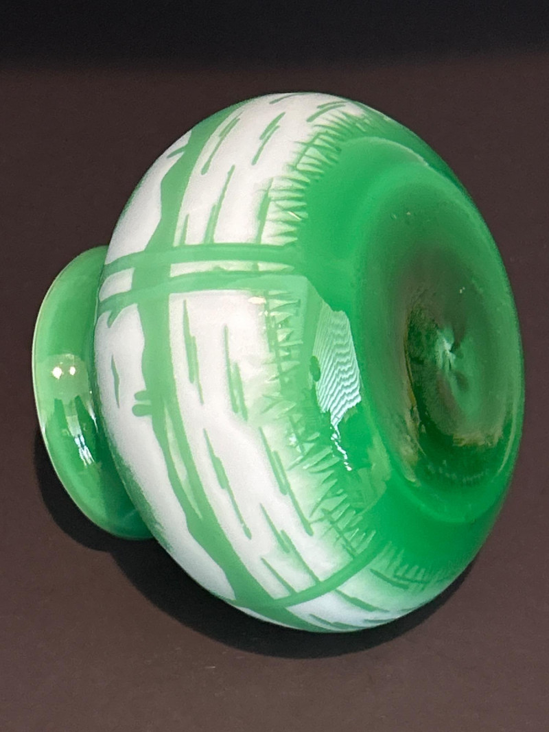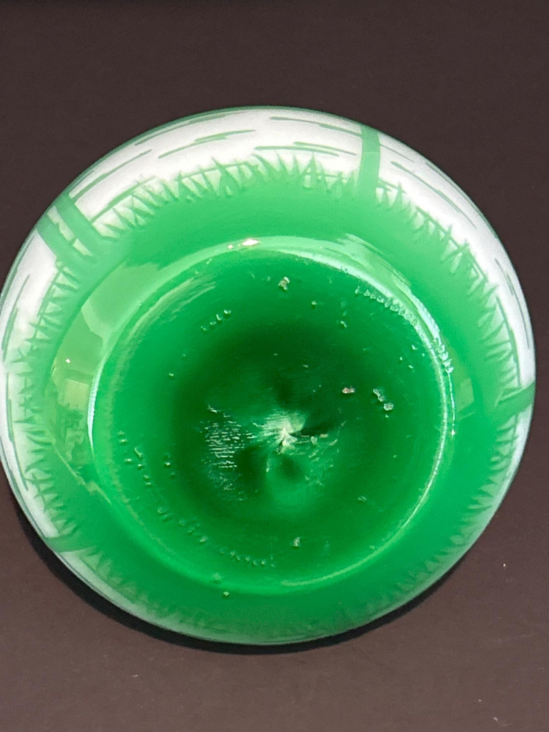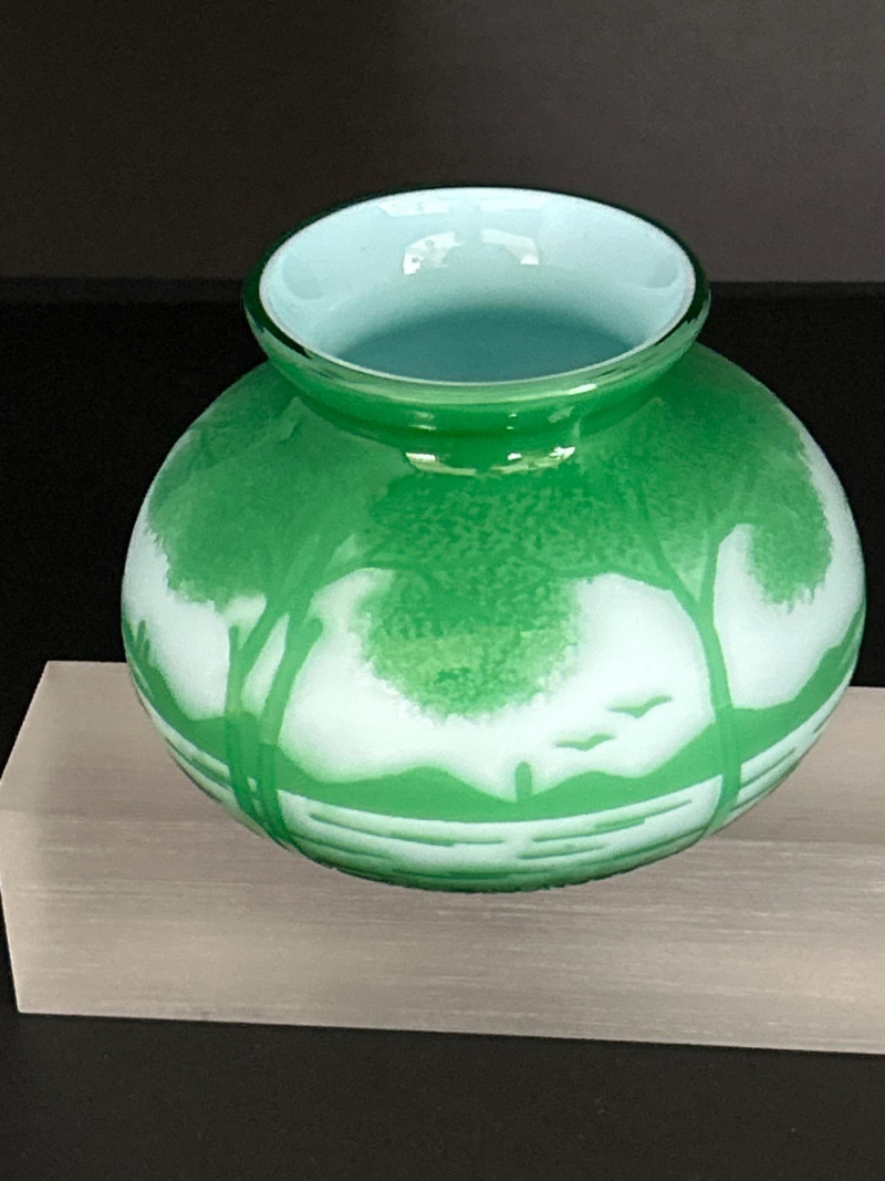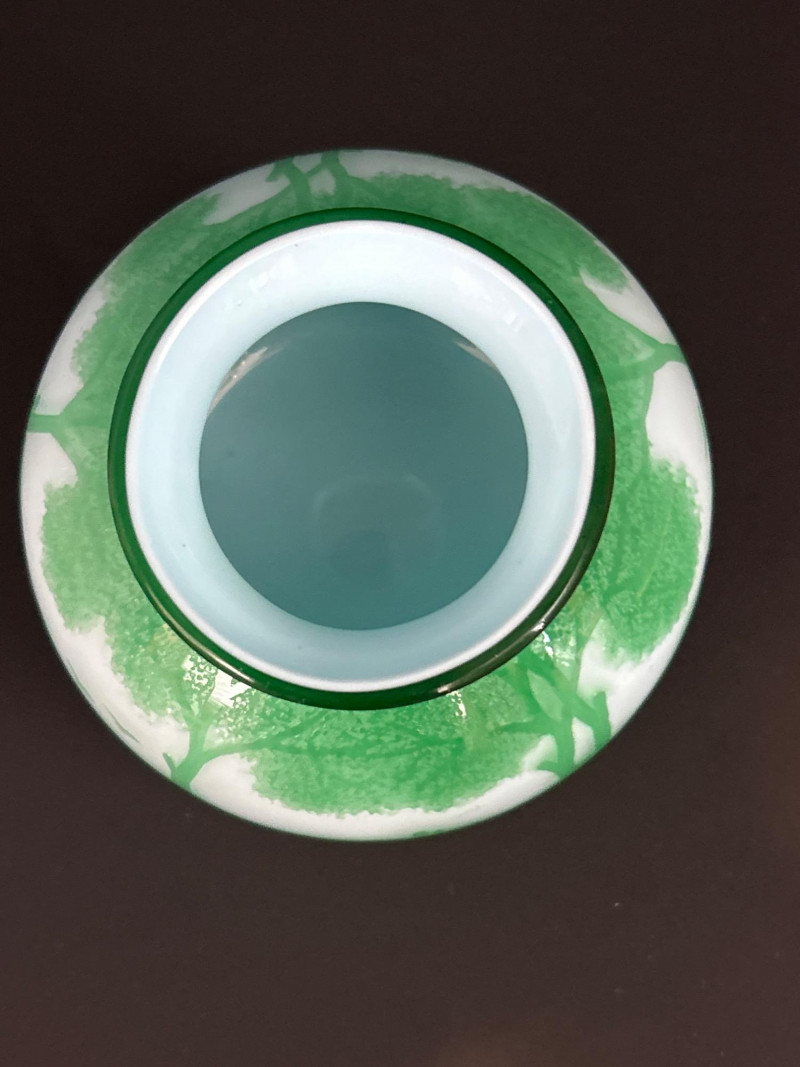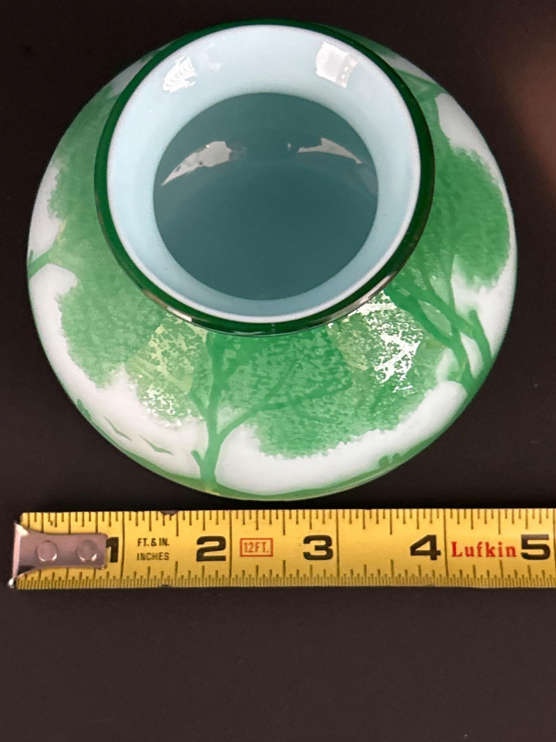 A finely executed art glass vase showcasing a vivid green-over-white cameo design with a tranquil etched landscape. The panoramic motif features trees, birds, and a distant horizon, rendered in layered glass with crisp acid-etched detailing. The interior is finished in a soft aqua blue, offering a serene contrast to the rich emerald overlay. Features: Material: Cameo glass (green overlay on white with blue interior) Color Scheme: Emerald green exterior with aqua-blue interior Form: Bulbous body, short neck, flared rim Dimensions: Height: Approx. 5½ inches Diameter: Approx. 4¾ inches (widest point) Opening: Approx. 2⅞ inches Collecting Note: This piece reflects the nature-inspired elegance of early 20th-century European decorative glass, reminiscent of French Art Nouveau and Art Deco traditions. The layered cameo technique and pastoral etching evoke the refined craftsmanship of makers such as Legras, Gallé, and Daum Nancy. Ideal for collectors of period glass or revivalist studio works.
