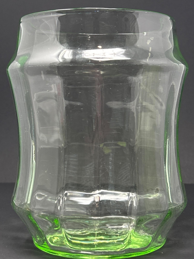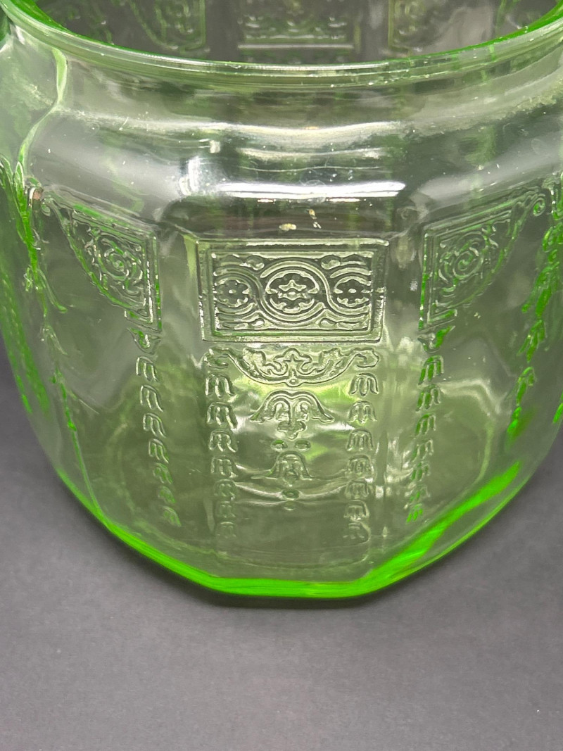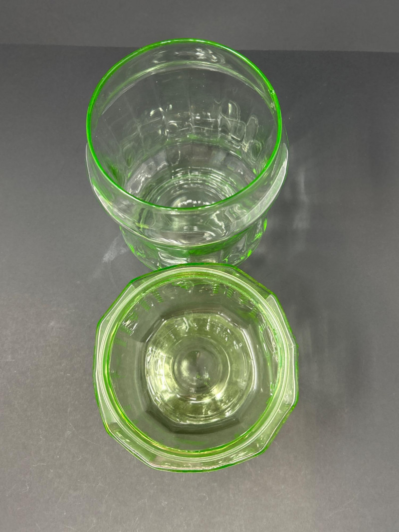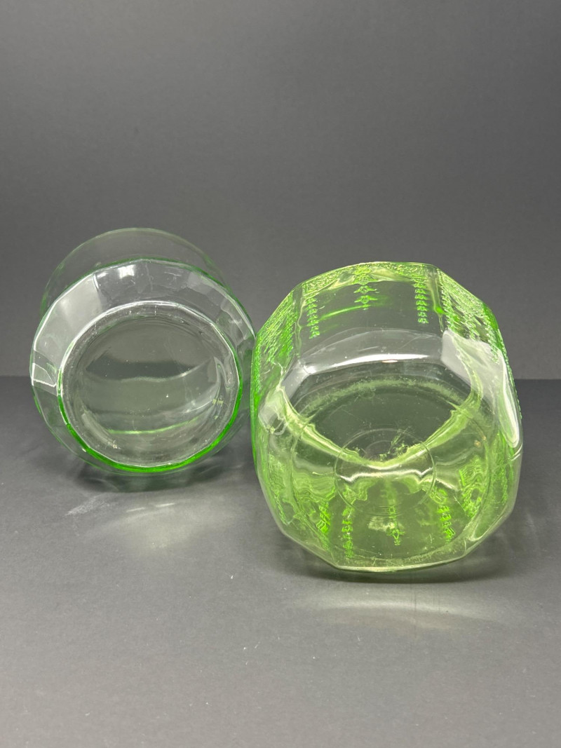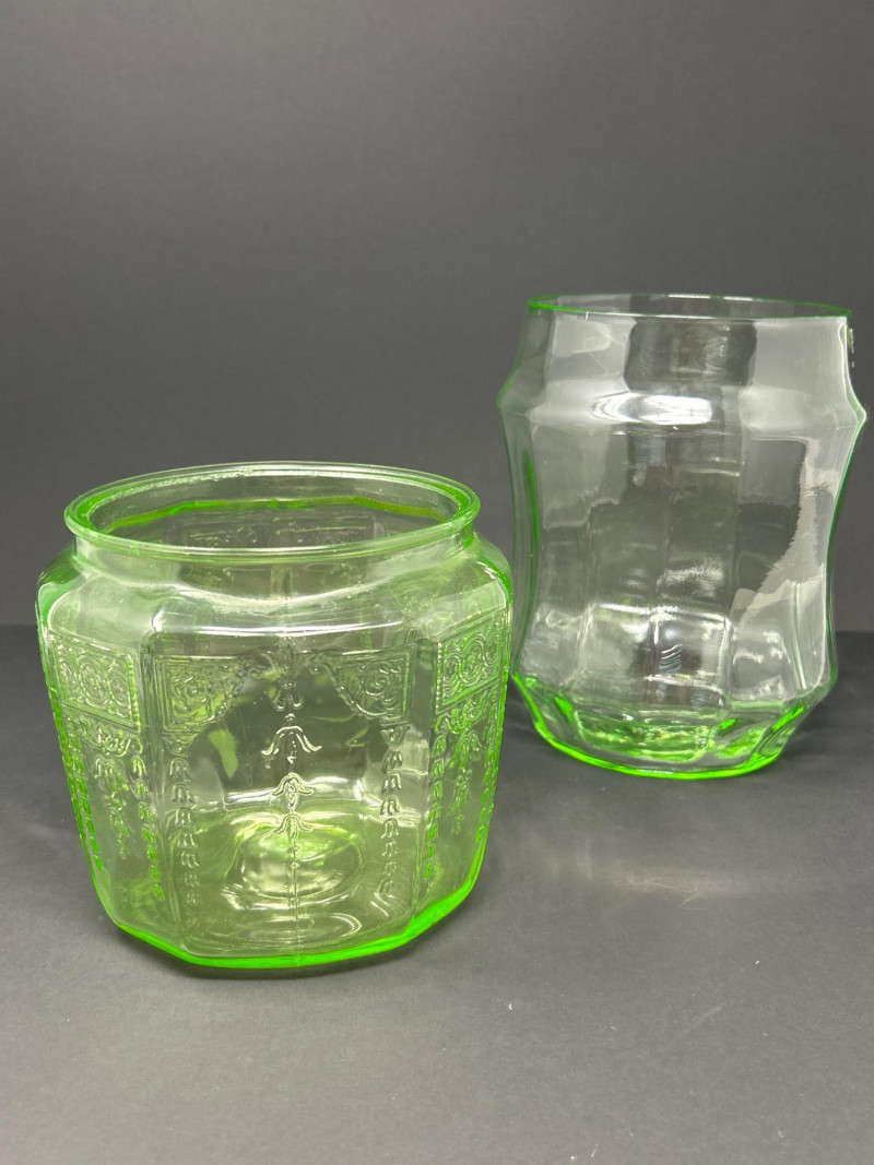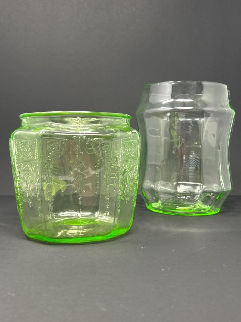 Dimensions: 5" tall × 7" wide Color: Transparent green; fluoresces bright neon under UV light Origin: Anchor Hocking Glass Co., USA, c.1931–1935 Design: Octagonal pressed glass with draped garlands, scrollwork, and geometric panels—hallmarks of the Princess pattern. Originally produced with a lid (not included). Style Notes: A quintessential Depression glass piece, celebrated for its Art Deco flourishes and vivid uranium glow. Dimensions: 7.5" tall × 7" wide Color: Pale green; fluoresces vividly under UV light Design: Smooth paneled body with gentle flare at rim and base. Clean Deco lines offer a sleek counterpoint to Jar A’s ornate styling. Style Notes: Likely American-made, c.1930s. Exemplifies the streamlined aesthetic of early modernist glassware.A – Anchor Hocking “Princess” Pattern Cookie Jar
