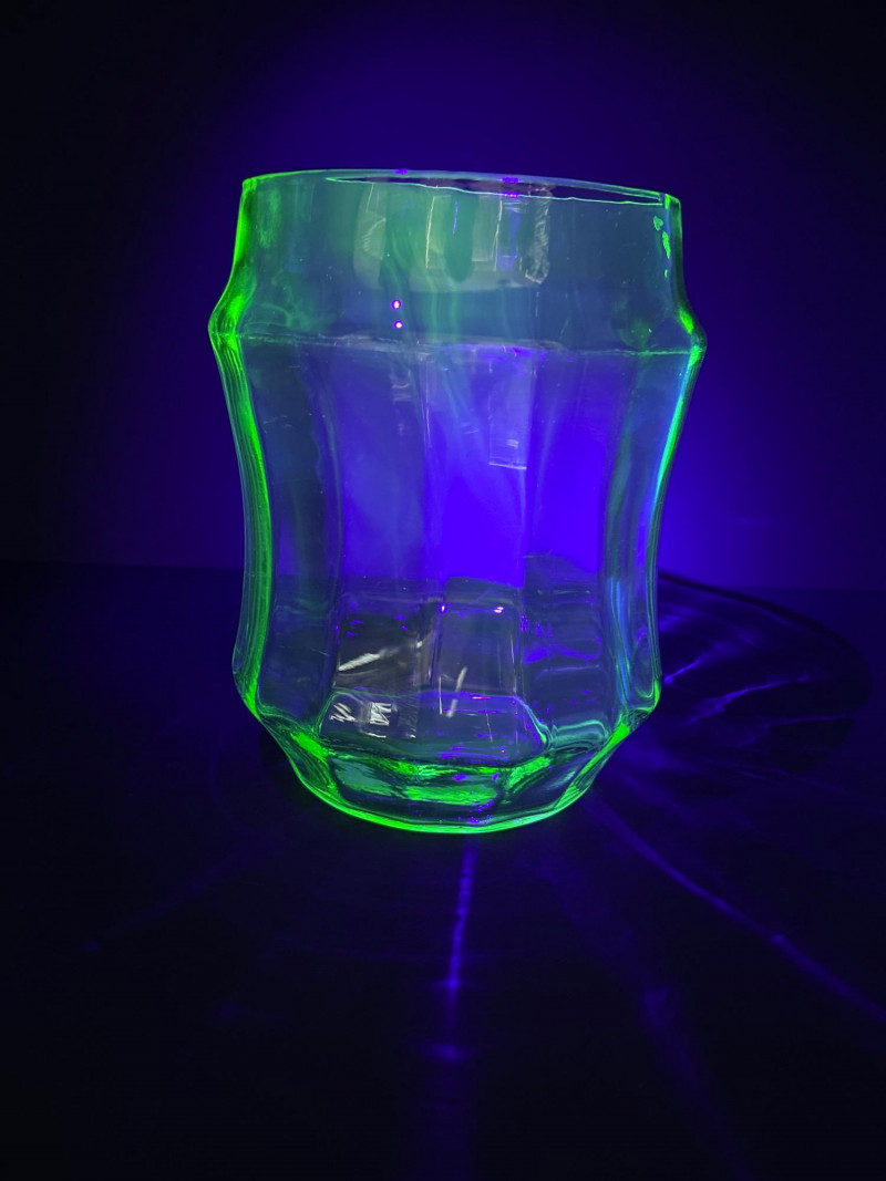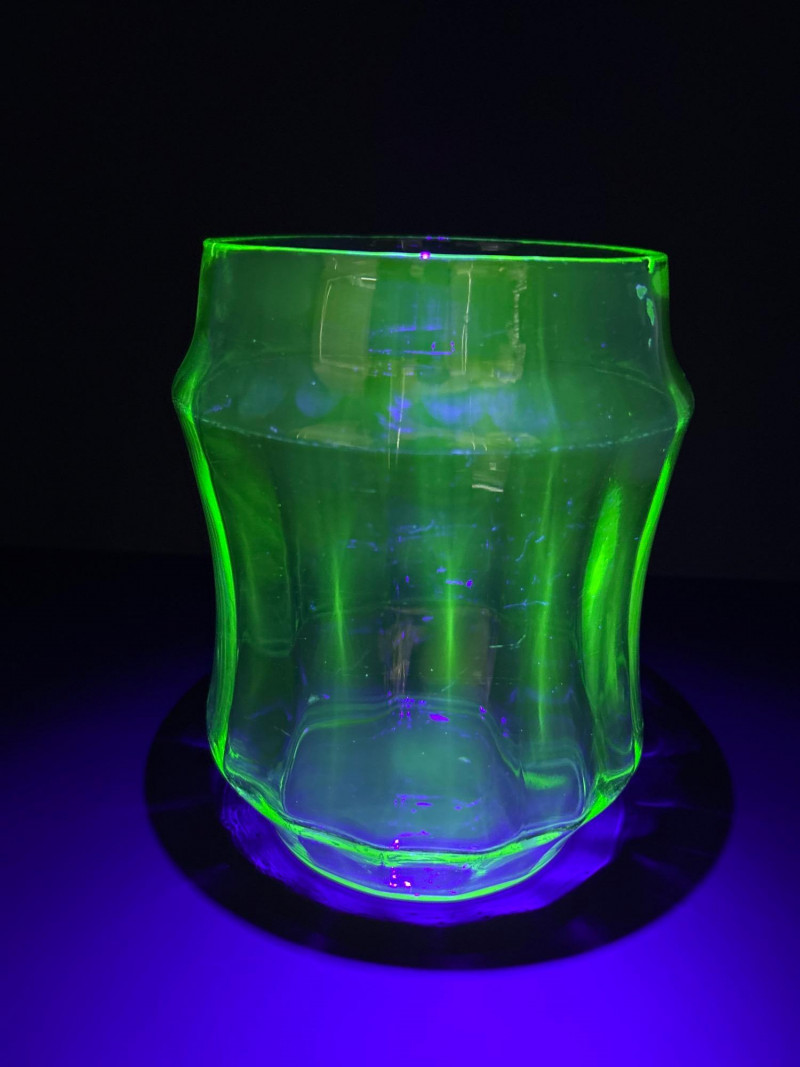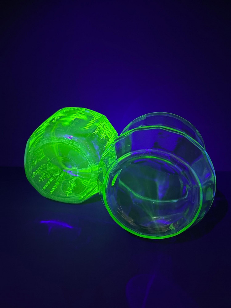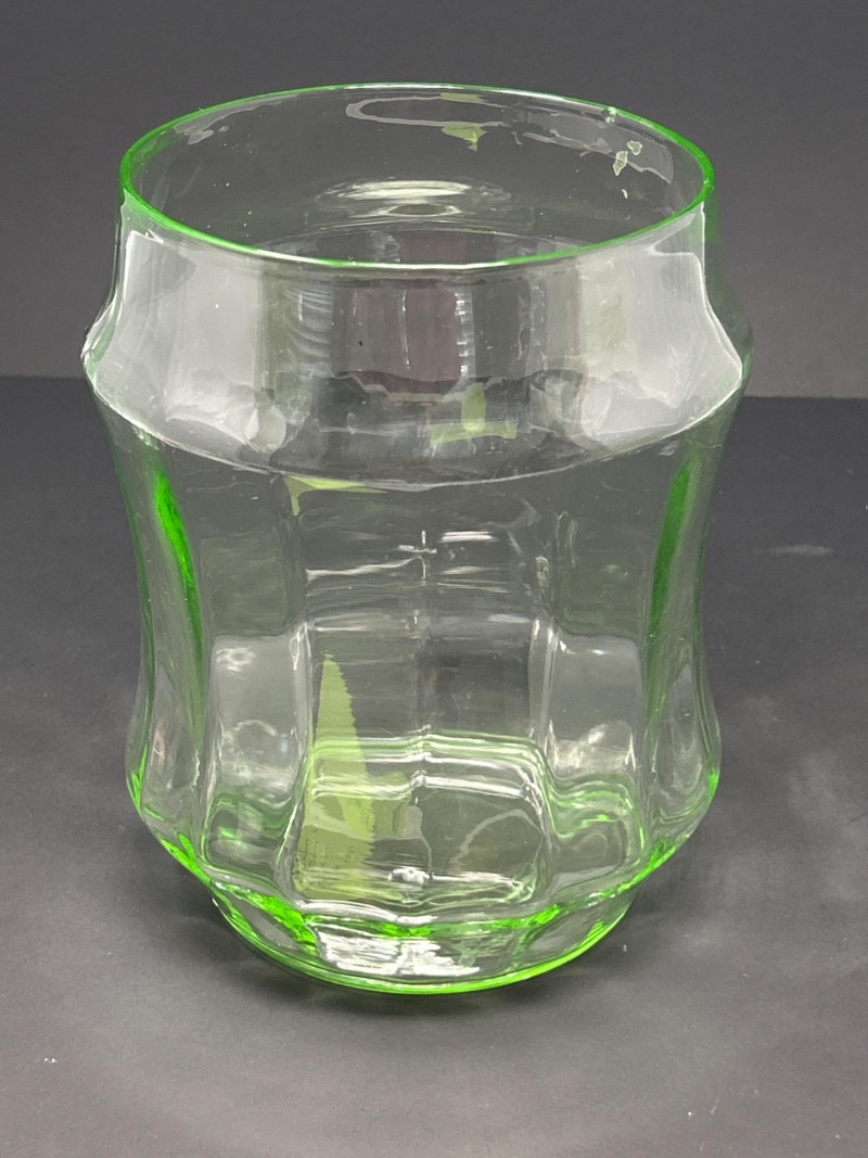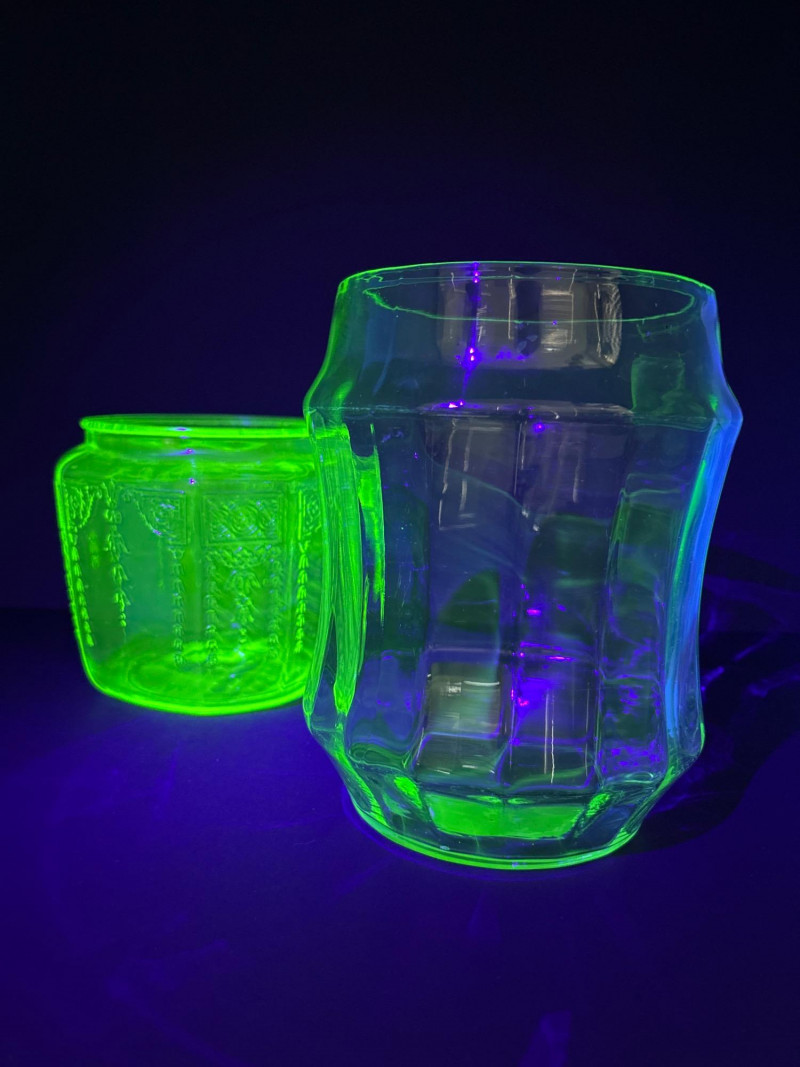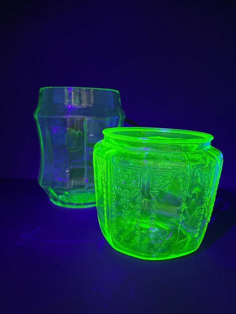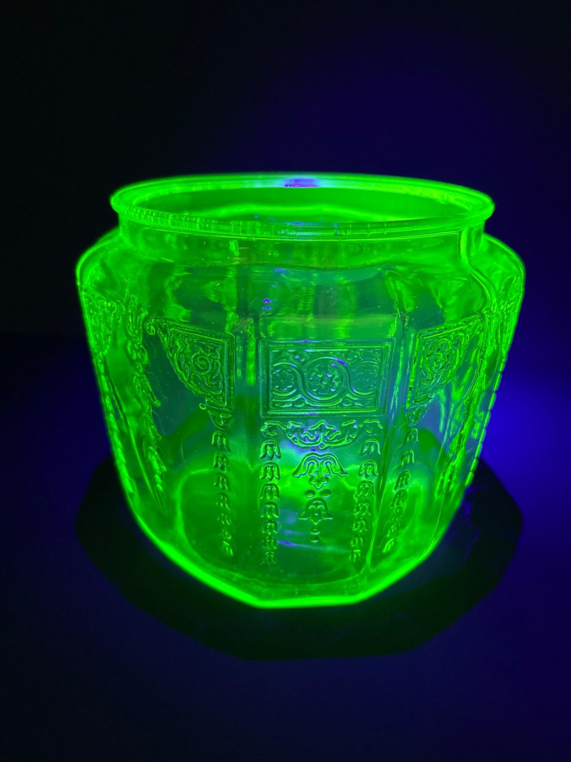 Dimensions: 5" tall × 7" wide Color: Transparent green; fluoresces bright neon under UV light Origin: Anchor Hocking Glass Co., USA, c.1931–1935 Design: Octagonal pressed glass with draped garlands, scrollwork, and geometric panels—hallmarks of the Princess pattern. Originally produced with a lid (not included). Style Notes: A quintessential Depression glass piece, celebrated for its Art Deco flourishes and vivid uranium glow. Dimensions: 7.5" tall × 7" wide Color: Pale green; fluoresces vividly under UV light Design: Smooth paneled body with gentle flare at rim and base. Clean Deco lines offer a sleek counterpoint to Jar A’s ornate styling. Style Notes: Likely American-made, c.1930s. Exemplifies the streamlined aesthetic of early modernist glassware.A – Anchor Hocking “Princess” Pattern Cookie Jar