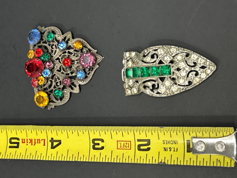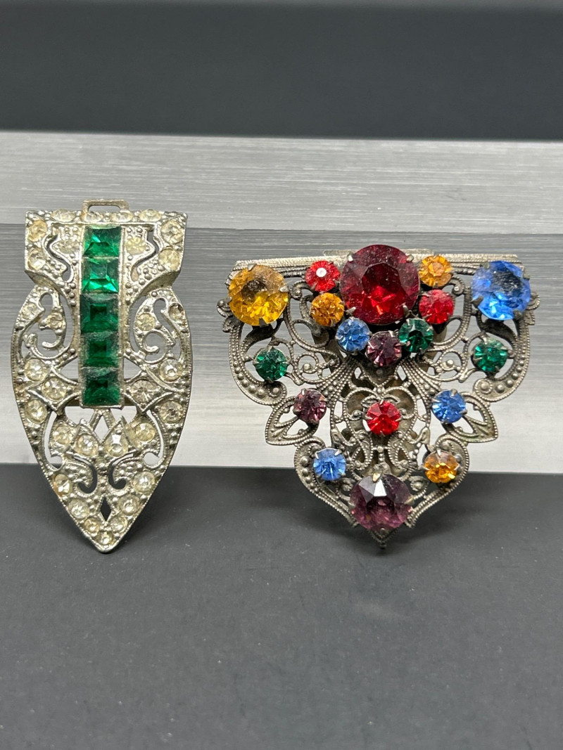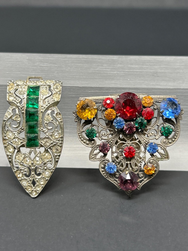 Lot # 19 - Two Vintage Art Deco Rhinestone Dress Clips – Emerald & Multicolor