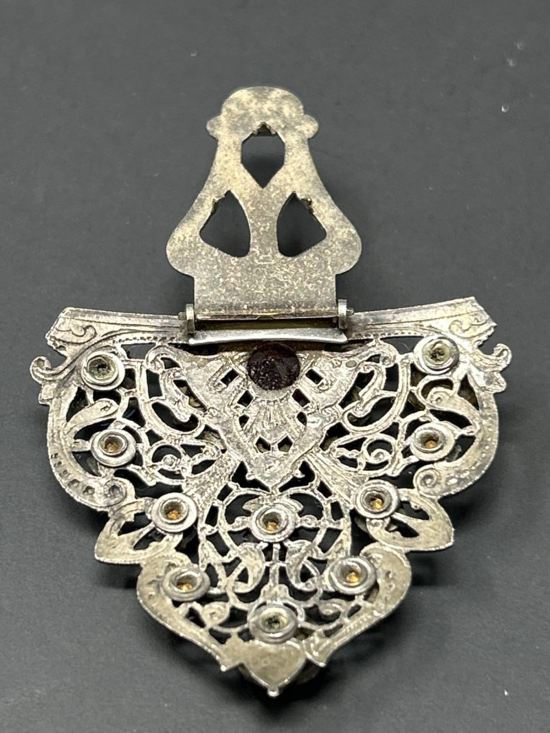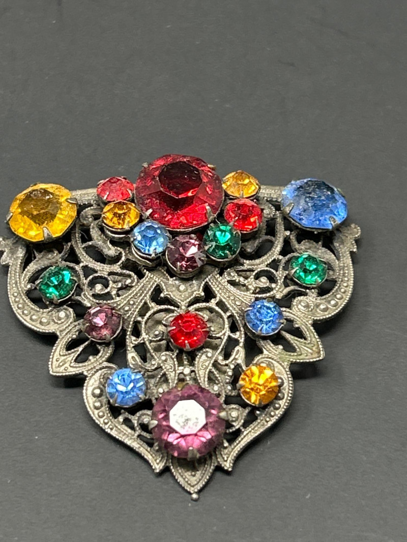 Design: Triangular silver-tone filigree base adorned with multi-size, prong-set rhinestones in vivid jewel tones. Features ornate scrolling patterns and a domed central red stone for striking visual depth.