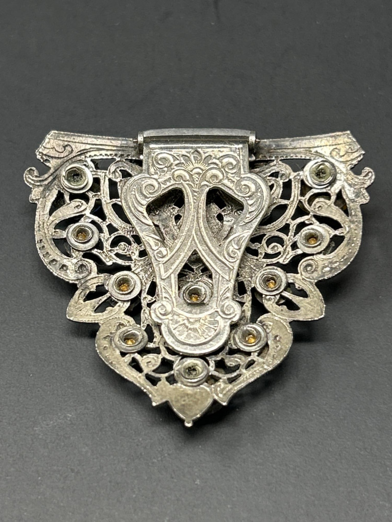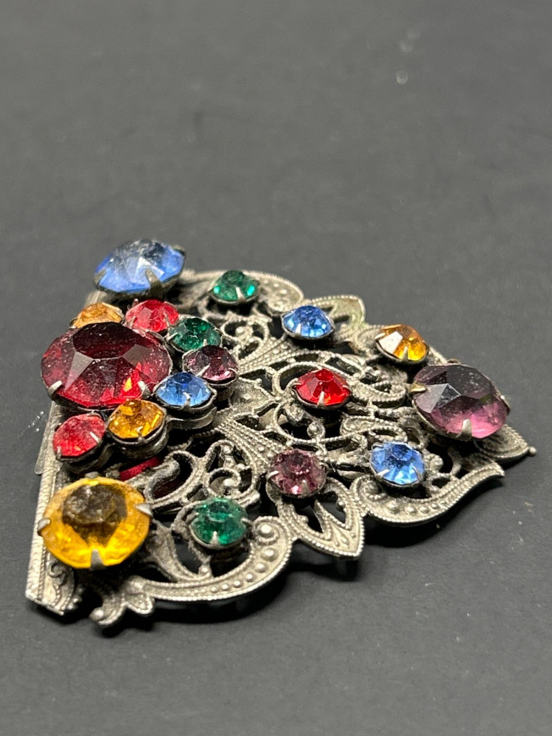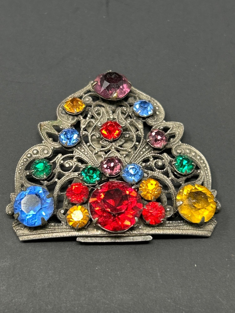 Style Notes: A refined Art Deco piece blending linear geometry with ornamental detail—perfect for accenting lapels, hats, or evening attire. Clip B – Multicolor Rhinestone Filigree