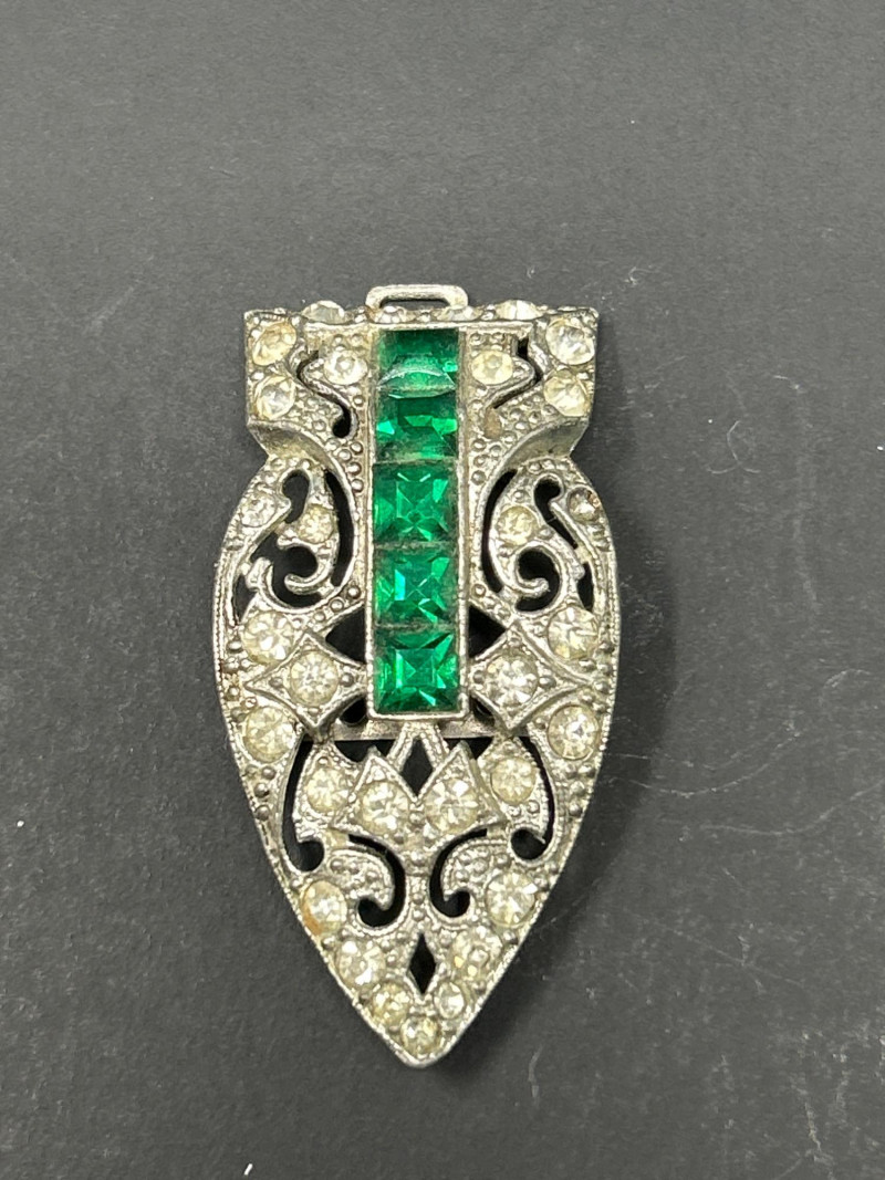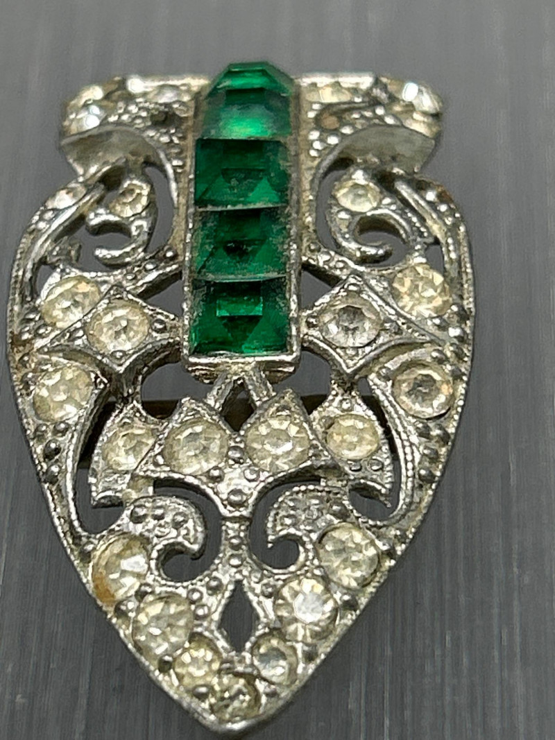 Design: Shield-shaped openwork silver-tone filigree with a vertical line of square-cut emerald glass stones bordered by round clear rhinestones. The metalwork features intricate scroll motifs and fine milgrain texture, capturing the geometric elegance of the Art Deco era.