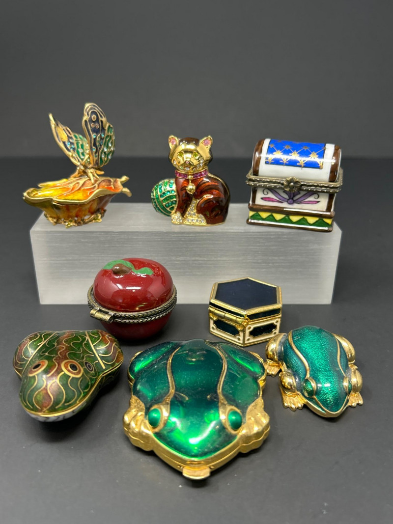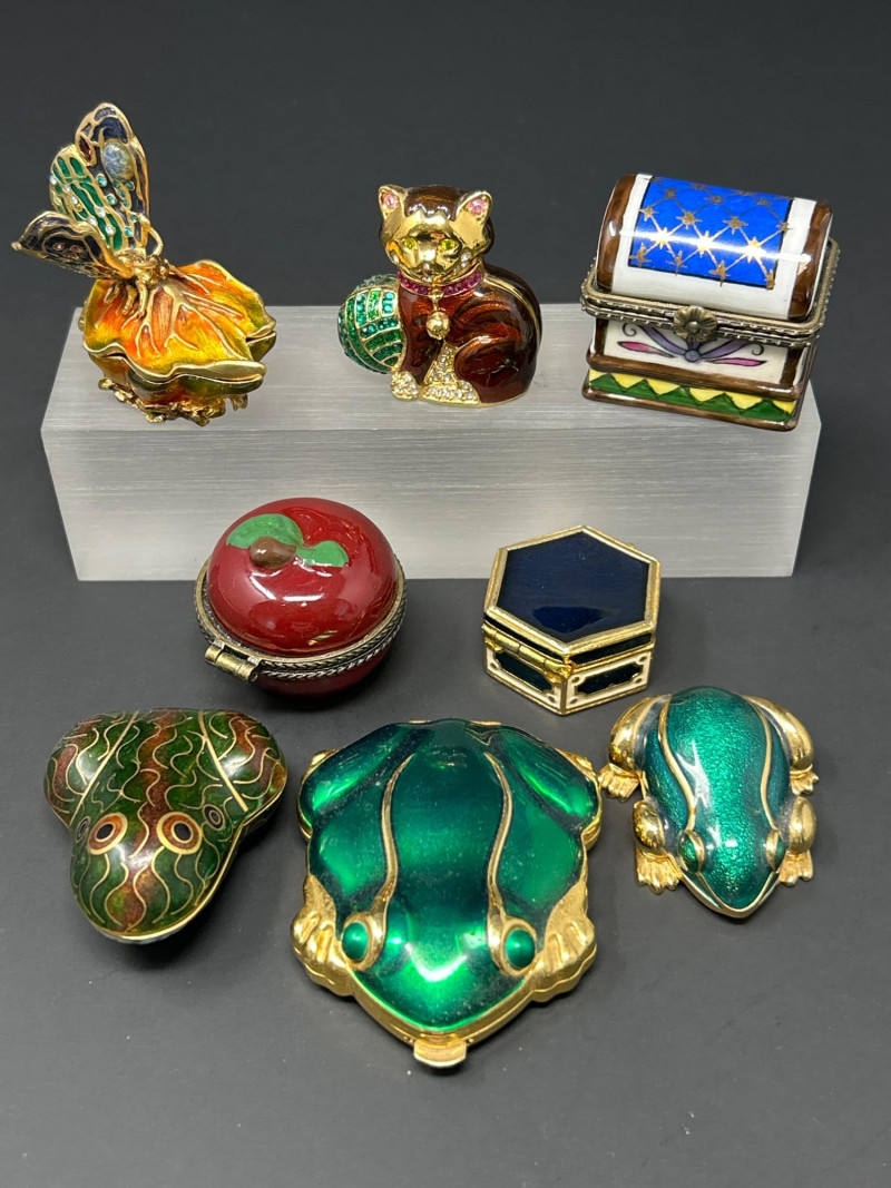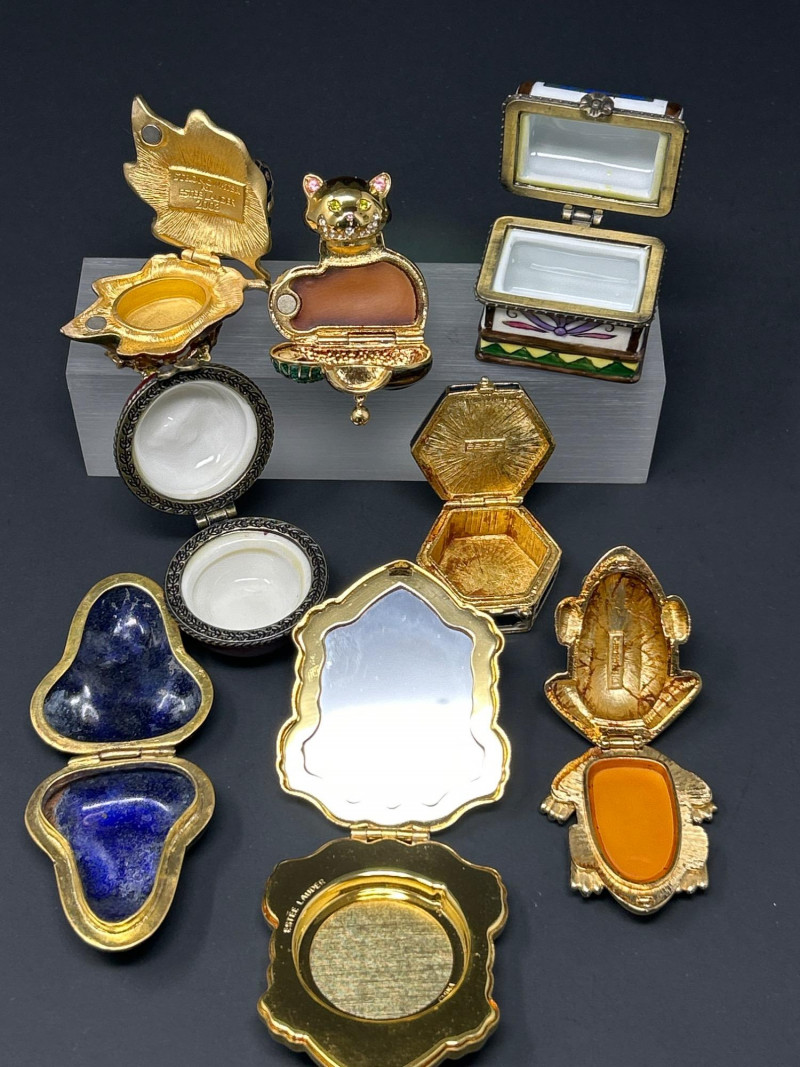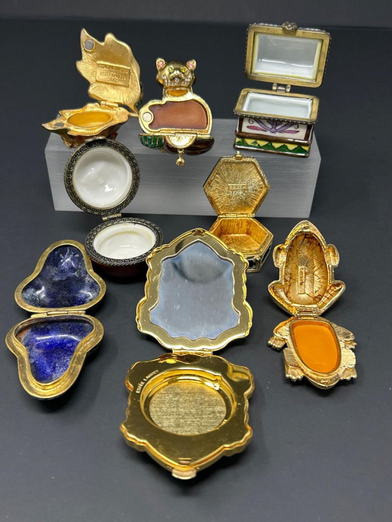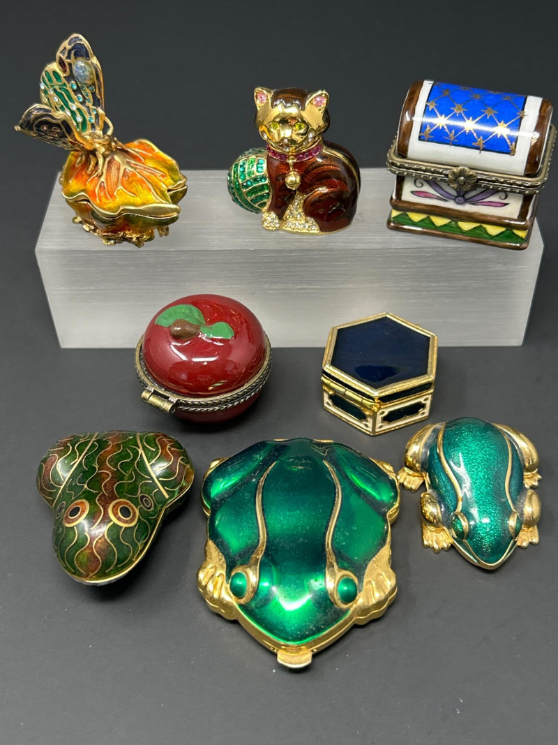 A dazzling ensemble of eight miniature hinged boxes and solid perfume compacts, celebrating the artistry of luxury vanity design. This curated set includes limited-edition Estée Lauder creations by Judith Leiber and Jay Strongwater, alongside whimsical cloisonné-style animal forms and decorative enamel boxes. Each piece showcases exquisite craftsmanship, from jeweled accents to mirrored interiors—ideal for collectors of vintage perfume objects d’art and designer vanity treasures. Estée Lauder “Intuition” Butterfly Compact (2003) Designed by Jay Strongwater. Multicolored enamel wings with crystal accents atop a golden blossom. Estée Lauder “Cuddly Kitten” Compact (2004) Designed by Judith Leiber. Jeweled feline with pink, green, and clear rhinestones, playfully clutching a green yarn ball. Estée Lauder Hexagonal Compact Gilt metal with cobalt blue enamel, radiant sunburst texture, marked “Estée”. Estée Lauder Frog Compact (1990s) Green enamel with gold detailing, mirror interior, associated with “White Linen” fragrance. Cloisonné-Style Frog Trinket Box Hinged brass form with green enamel and blue interior. Apple-Shaped Red Enamel Box Gilt clasp, white enamel interior—charming and collectible. Rectangular Chest Box (©1997 CBK Ltd.) Blue and white star motif, gilt trim, marked Union City, TN. Ornate Rococo Mirror Compact Gold-tone finish with elegant scrollwork and fitted mirror.Highlights