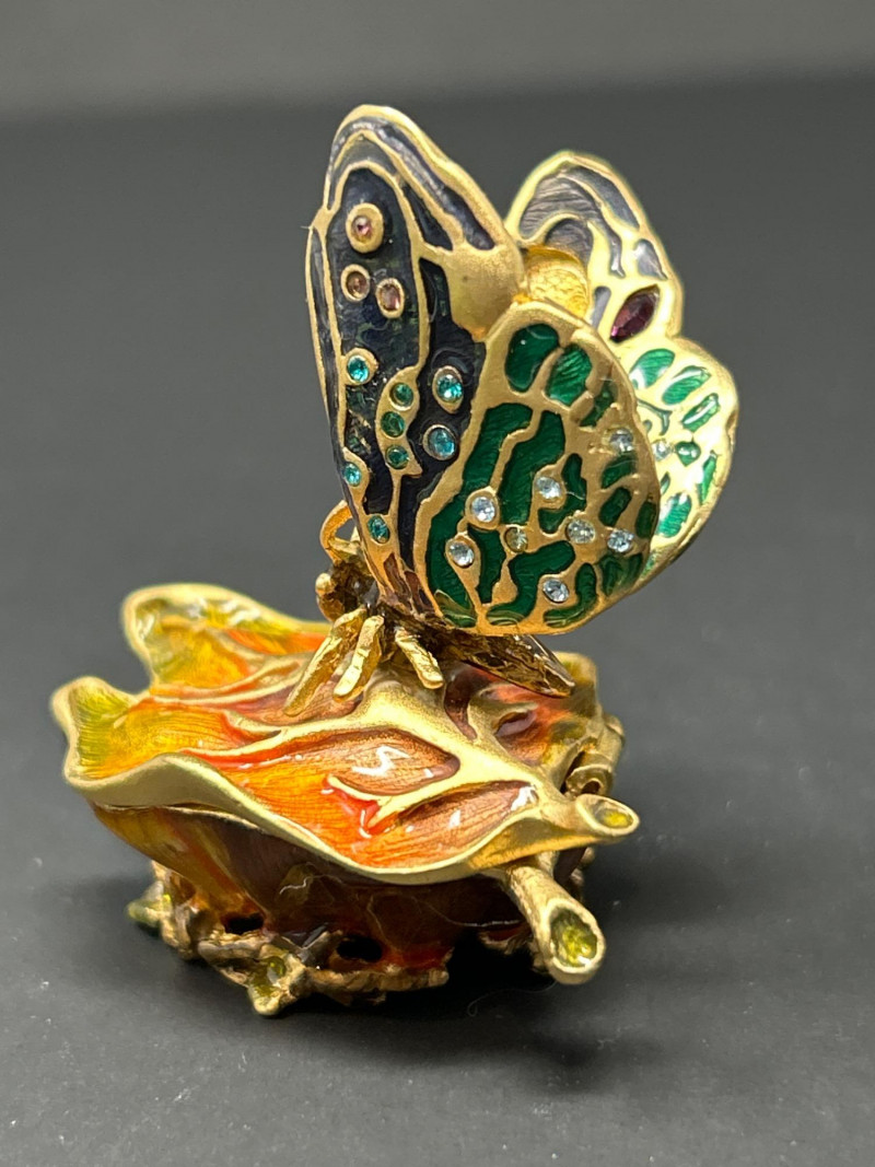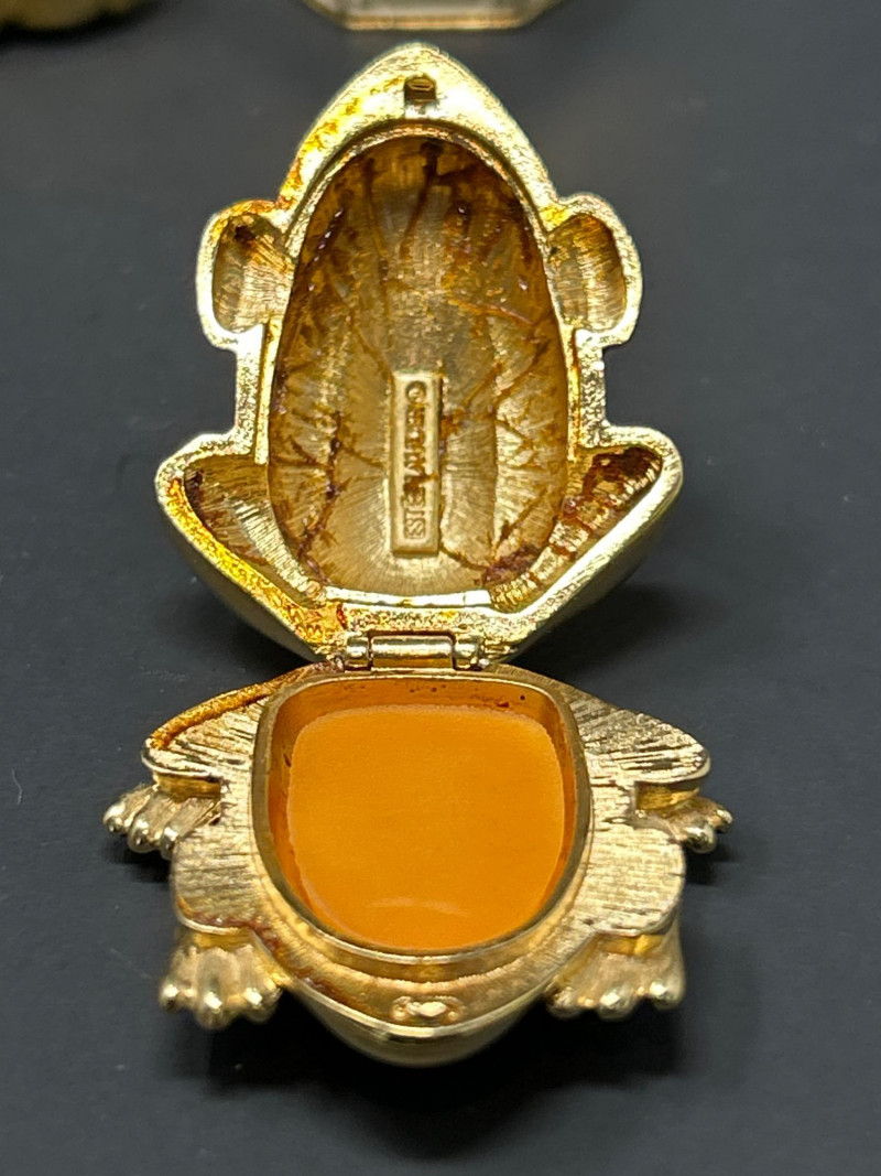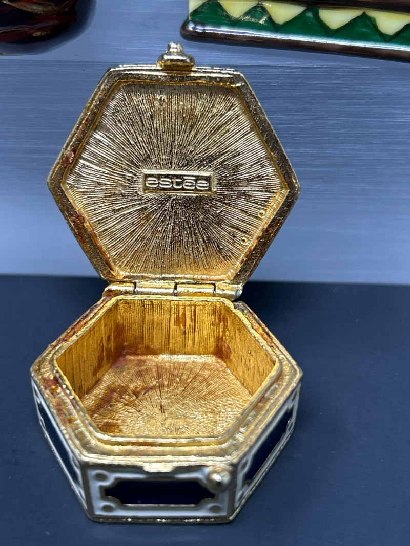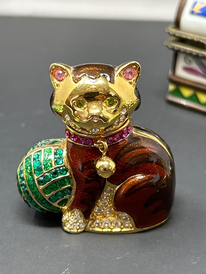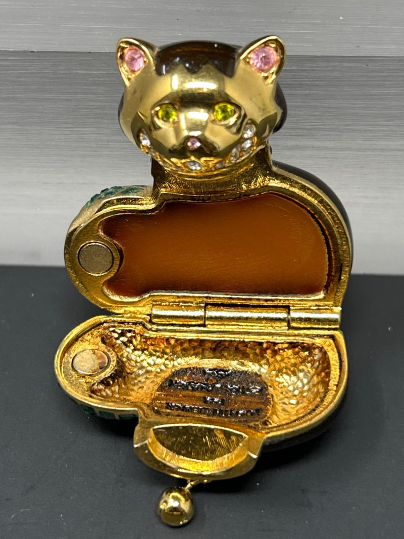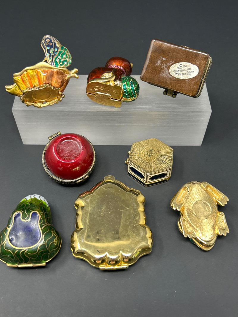 A dazzling ensemble of eight miniature hinged boxes and solid perfume compacts, celebrating the artistry of luxury vanity design. This curated set includes limited-edition Estée Lauder creations by Judith Leiber and Jay Strongwater, alongside whimsical cloisonné-style animal forms and decorative enamel boxes. Each piece showcases exquisite craftsmanship, from jeweled accents to mirrored interiors—ideal for collectors of vintage perfume objects d’art and designer vanity treasures. Estée Lauder “Intuition” Butterfly Compact (2003) Designed by Jay Strongwater. Multicolored enamel wings with crystal accents atop a golden blossom. Estée Lauder “Cuddly Kitten” Compact (2004) Designed by Judith Leiber. Jeweled feline with pink, green, and clear rhinestones, playfully clutching a green yarn ball. Estée Lauder Hexagonal Compact Gilt metal with cobalt blue enamel, radiant sunburst texture, marked “Estée”. Estée Lauder Frog Compact (1990s) Green enamel with gold detailing, mirror interior, associated with “White Linen” fragrance. Cloisonné-Style Frog Trinket Box Hinged brass form with green enamel and blue interior. Apple-Shaped Red Enamel Box Gilt clasp, white enamel interior—charming and collectible. Rectangular Chest Box (©1997 CBK Ltd.) Blue and white star motif, gilt trim, marked Union City, TN. Ornate Rococo Mirror Compact Gold-tone finish with elegant scrollwork and fitted mirror.Highlights