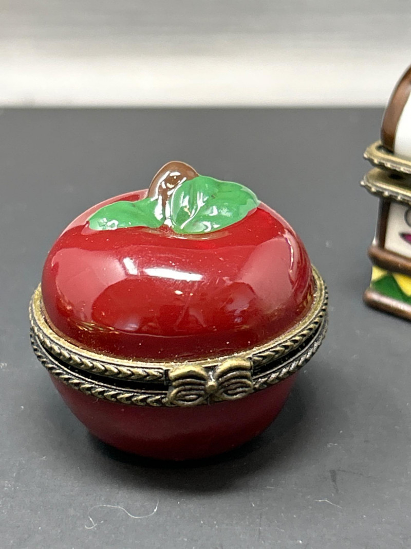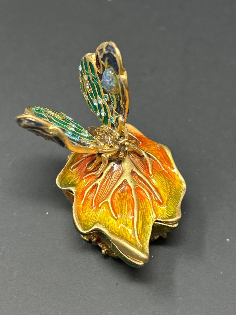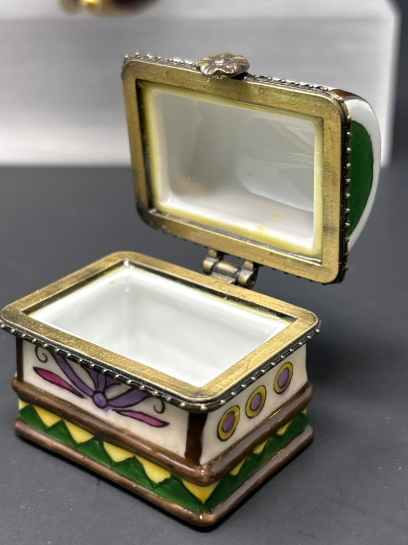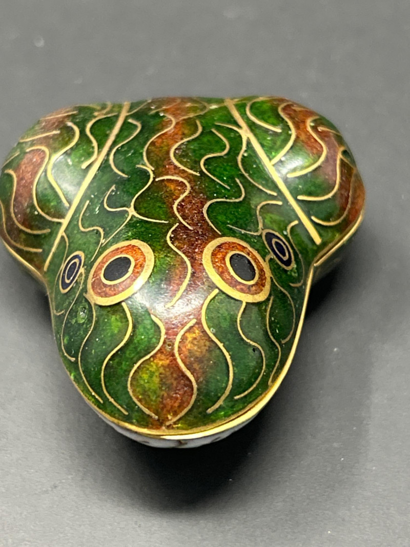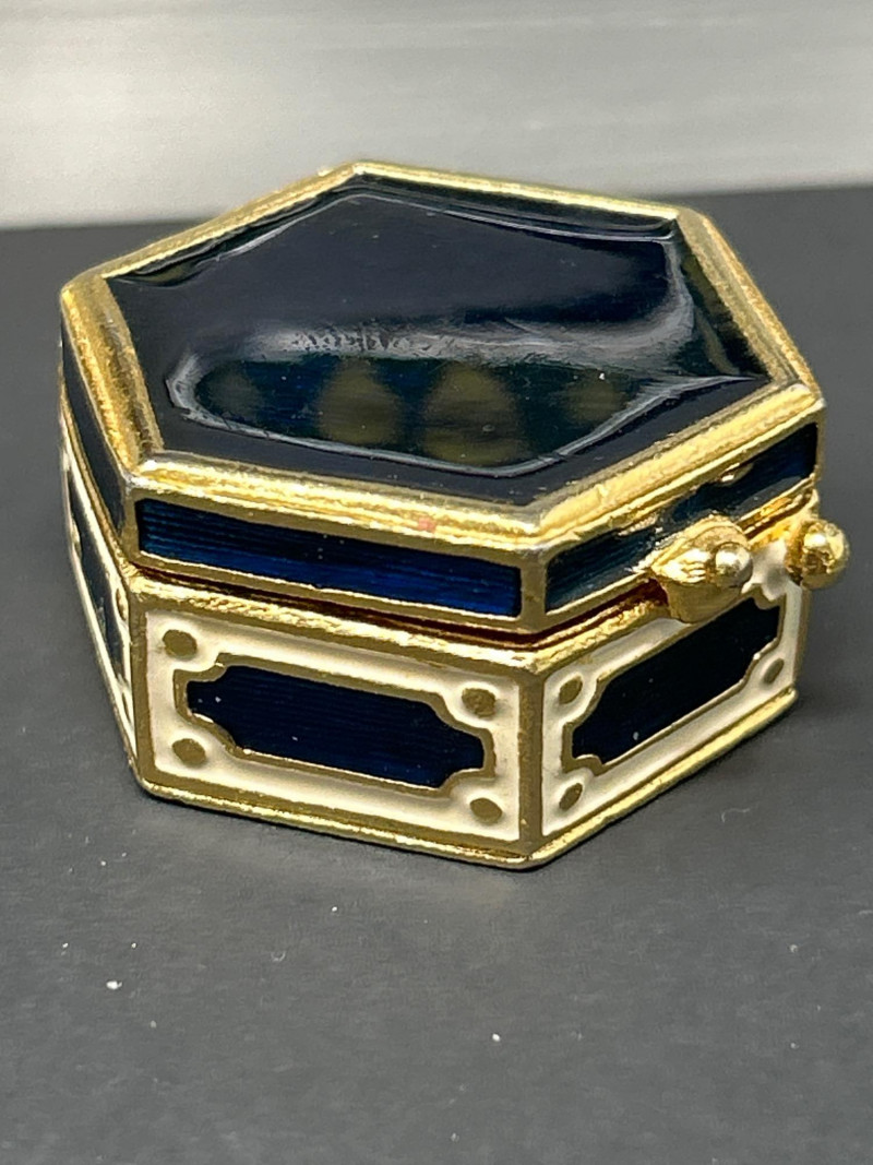 A dazzling ensemble of eight miniature hinged boxes and solid perfume compacts, celebrating the artistry of luxury vanity design. This curated set includes limited-edition Estée Lauder creations by Judith Leiber and Jay Strongwater, alongside whimsical cloisonné-style animal forms and decorative enamel boxes. Each piece showcases exquisite craftsmanship, from jeweled accents to mirrored interiors—ideal for collectors of vintage perfume objects d’art and designer vanity treasures. Estée Lauder “Intuition” Butterfly Compact (2003) Designed by Jay Strongwater. Multicolored enamel wings with crystal accents atop a golden blossom. Estée Lauder “Cuddly Kitten” Compact (2004) Designed by Judith Leiber. Jeweled feline with pink, green, and clear rhinestones, playfully clutching a green yarn ball. Estée Lauder Hexagonal Compact Gilt metal with cobalt blue enamel, radiant sunburst texture, marked “Estée”. Estée Lauder Frog Compact (1990s) Green enamel with gold detailing, mirror interior, associated with “White Linen” fragrance. Cloisonné-Style Frog Trinket Box Hinged brass form with green enamel and blue interior. Apple-Shaped Red Enamel Box Gilt clasp, white enamel interior—charming and collectible. Rectangular Chest Box (©1997 CBK Ltd.) Blue and white star motif, gilt trim, marked Union City, TN. Ornate Rococo Mirror Compact Gold-tone finish with elegant scrollwork and fitted mirror.Highlights