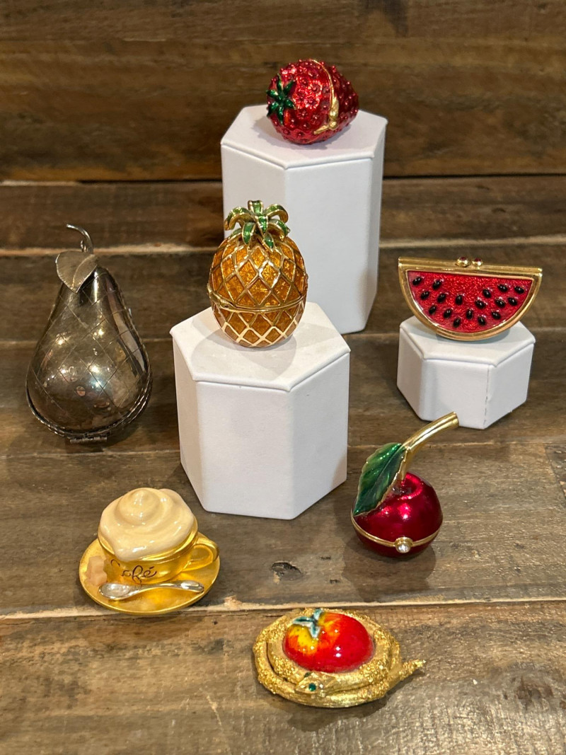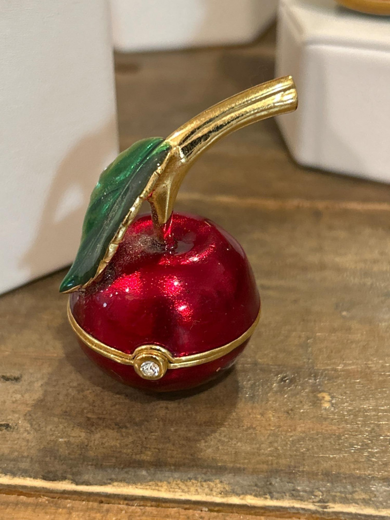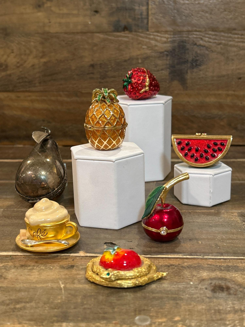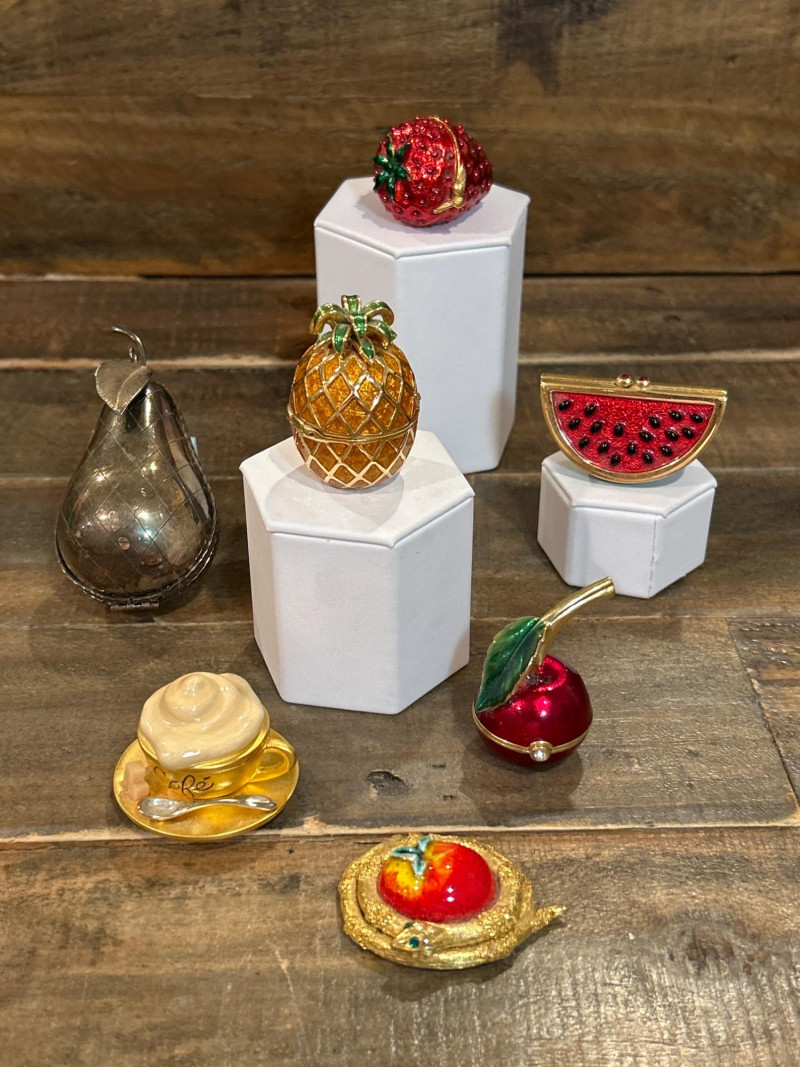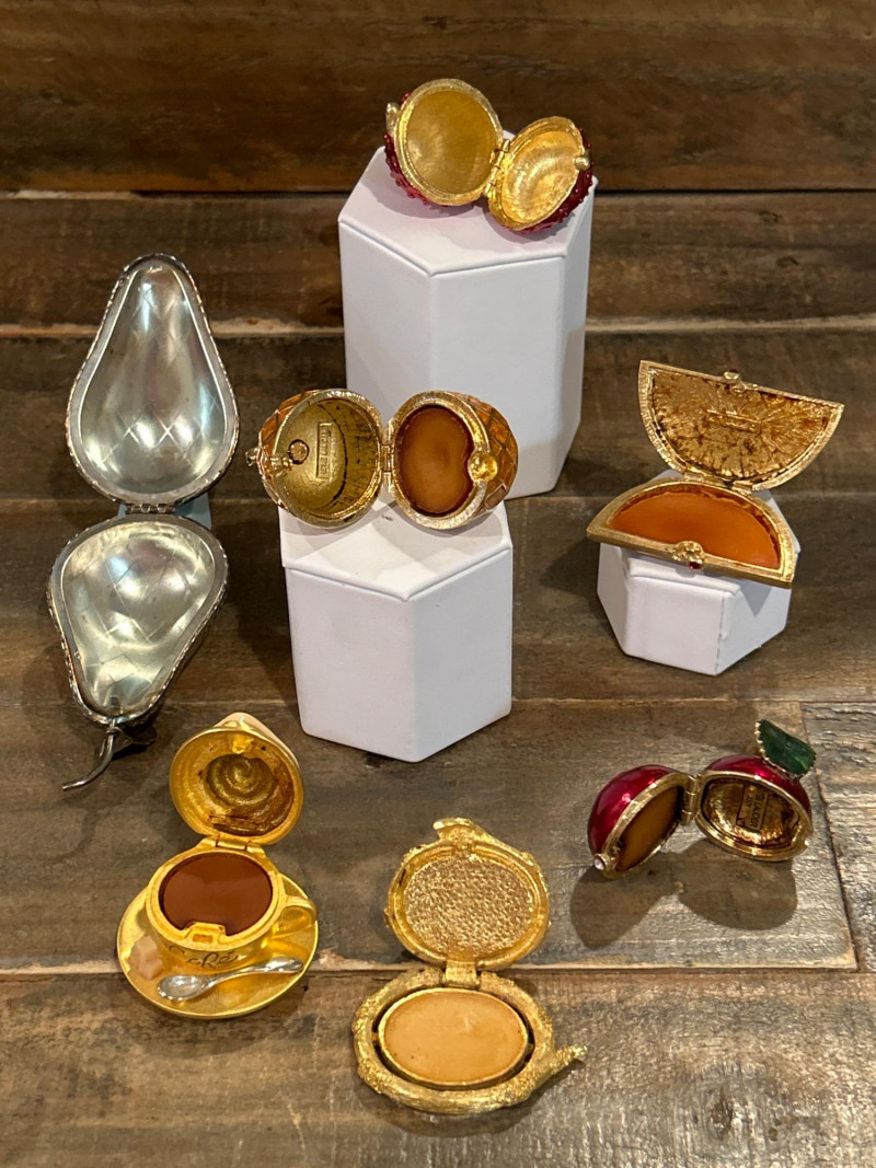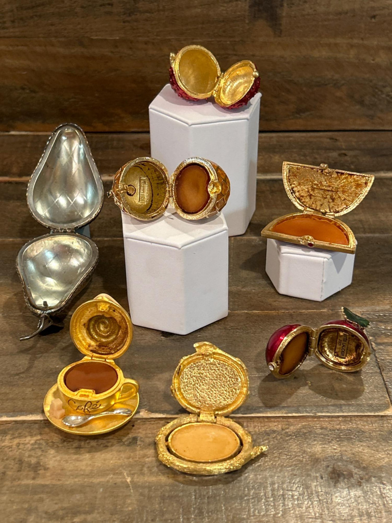 Including rare designs by Estée Lauder and Florenza, presented in fruit and café-themed forms. Most feature rich enamel finishes, gilt metalwork, and crystal accents, with several retaining traces of their original perfume contents. 2001 Estée Lauder “Glistening Red Cherry” Solid Perfume Compact Shimmering red enamel body with gold-tone stem and green enamel leaf Adorned with a single faceted crystal Marked “ESTÉE LAUDER 2001 BEAUTIFUL – Made in Canada Estée Lauder “Pineapple” Solid Perfume Compact Deep amber-gold enamel over lattice design with green enamel leaves and top crystal Marked “ESTÉE LAUDER KNOWING – Made in Canada Estée Lauder “Watermelon” Solid Perfume Compact Half-slice motif in red enamel with black seed details and gold-tone trim Retains traces of original perfume Estée Lauder “Café Cup” Solid Perfume Compact Enamel miniature cup and saucer with whipped topping, sugar cubes, and tiny spoon detail Scripted “Café” in black; opens to reveal perfume compartment Florenza “Strawberry” Enamel Trinket Pill Box Red enamel with green stem and raised gilt detailing Signed Florenza inside; measures approx. 1½ in. long Fuller Brush “Garden of Eden” Apple & Snake Solid Perfume Compact Pendant Gilt serpent coiled around a red and yellow enamel apple cabochon with turquoise flower accent Snake head set with green rhinestone eyes Chain mountable pendant style Silver-Tone Pear Compact Quilted silver-metal pear form with hinged lid and leaf finial Opens to reveal solid perfume residue inside Unmarked; likely mid-century novelty compact Estée Lauder’s solid perfume compacts are coveted for their artistry and limited production, while Florenza’s and Fuller Brush’s vintage designs add mid-century charm. This multi-maker assortment highlights the evolution of collectible vanity art—from gilt Hollywood Glamour to early 2000s Jay Strongwater–era opulence.Collecting Note: