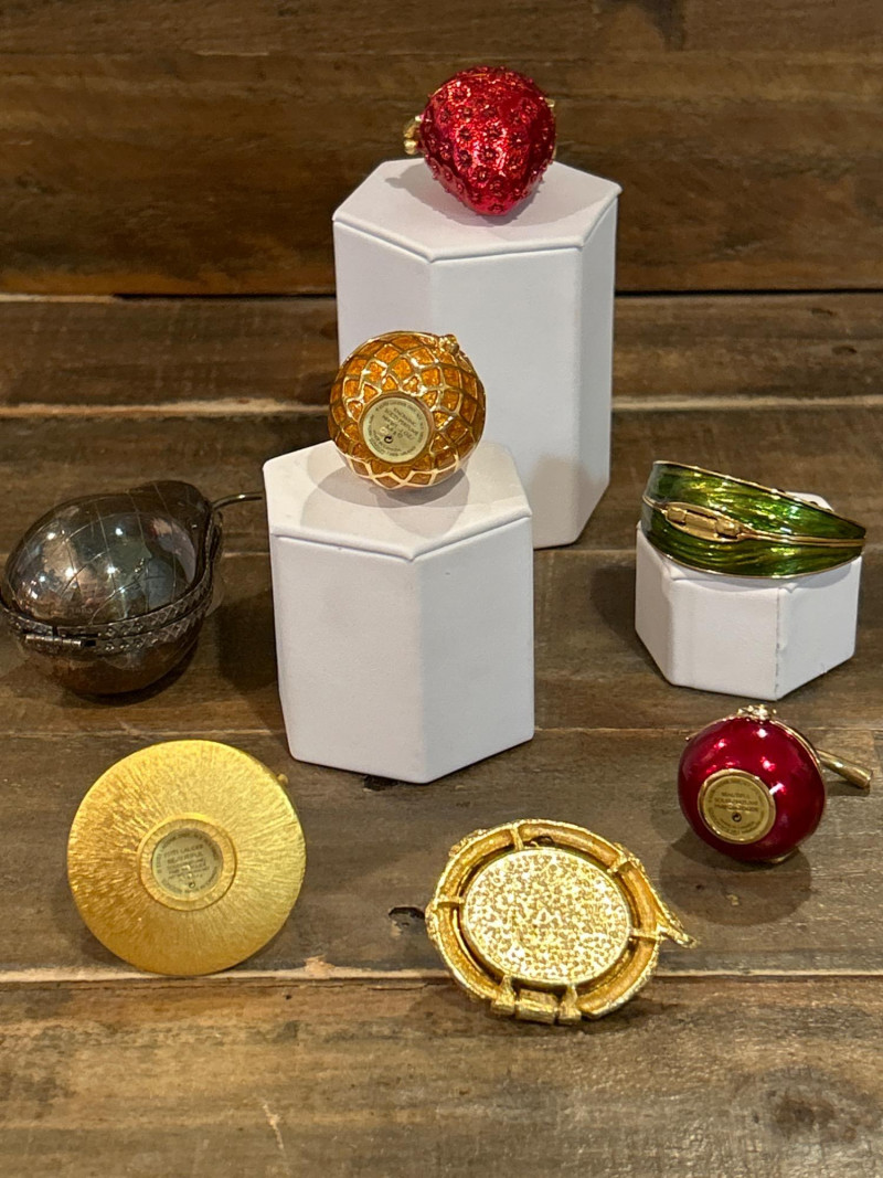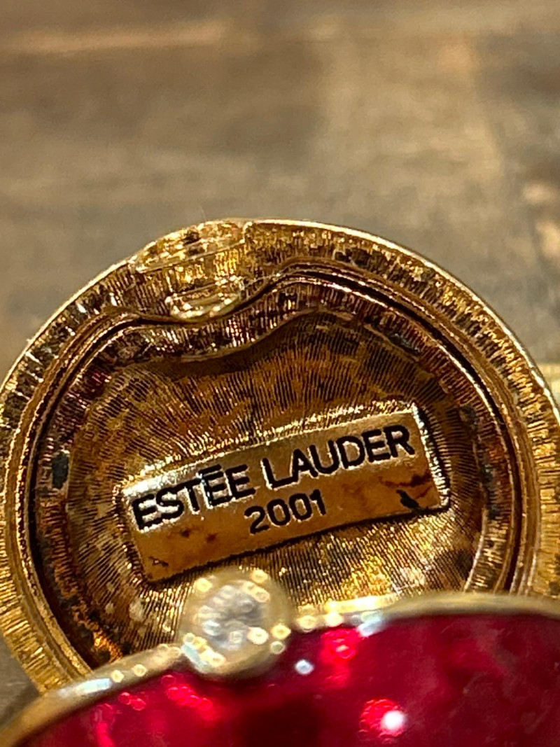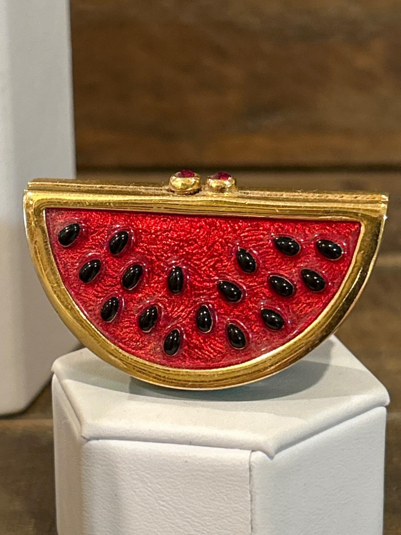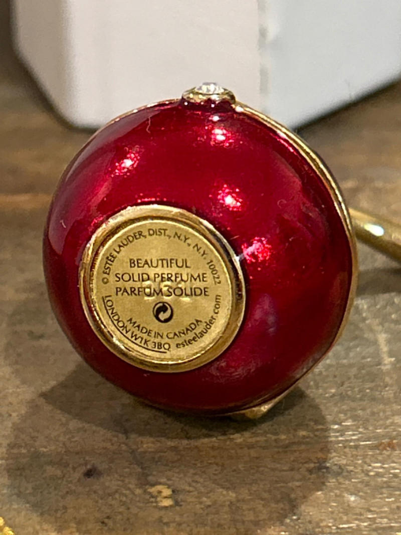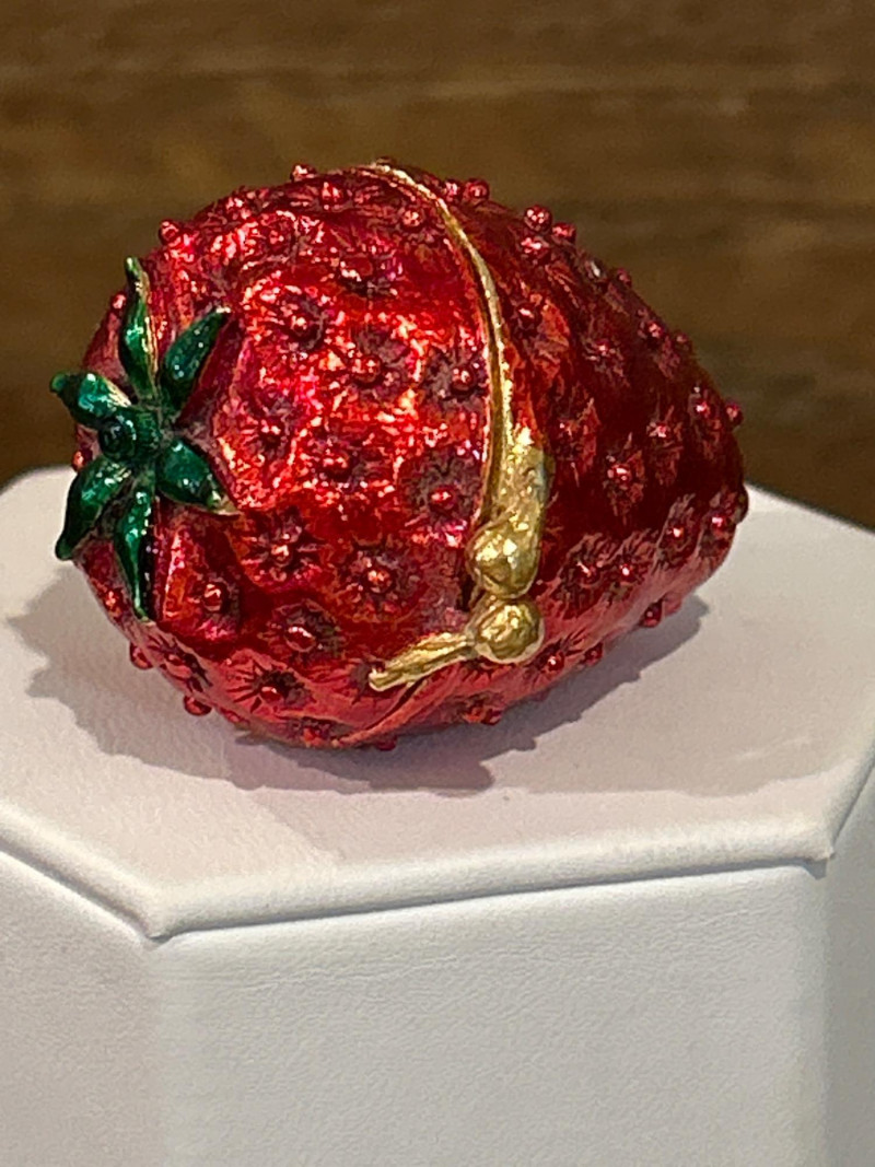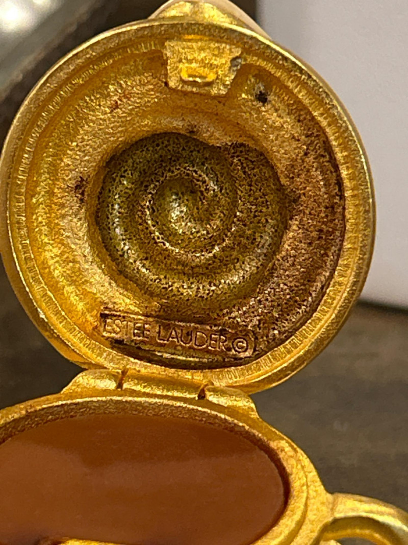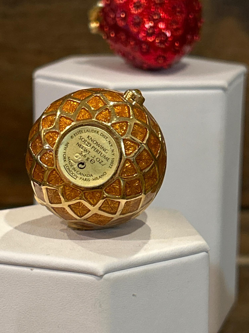 Including rare designs by Estée Lauder and Florenza, presented in fruit and café-themed forms. Most feature rich enamel finishes, gilt metalwork, and crystal accents, with several retaining traces of their original perfume contents. 2001 Estée Lauder “Glistening Red Cherry” Solid Perfume Compact Shimmering red enamel body with gold-tone stem and green enamel leaf Adorned with a single faceted crystal Marked “ESTÉE LAUDER 2001 BEAUTIFUL – Made in Canada Estée Lauder “Pineapple” Solid Perfume Compact Deep amber-gold enamel over lattice design with green enamel leaves and top crystal Marked “ESTÉE LAUDER KNOWING – Made in Canada Estée Lauder “Watermelon” Solid Perfume Compact Half-slice motif in red enamel with black seed details and gold-tone trim Retains traces of original perfume Estée Lauder “Café Cup” Solid Perfume Compact Enamel miniature cup and saucer with whipped topping, sugar cubes, and tiny spoon detail Scripted “Café” in black; opens to reveal perfume compartment Florenza “Strawberry” Enamel Trinket Pill Box Red enamel with green stem and raised gilt detailing Signed Florenza inside; measures approx. 1½ in. long Fuller Brush “Garden of Eden” Apple & Snake Solid Perfume Compact Pendant Gilt serpent coiled around a red and yellow enamel apple cabochon with turquoise flower accent Snake head set with green rhinestone eyes Chain mountable pendant style Silver-Tone Pear Compact Quilted silver-metal pear form with hinged lid and leaf finial Opens to reveal solid perfume residue inside Unmarked; likely mid-century novelty compact Estée Lauder’s solid perfume compacts are coveted for their artistry and limited production, while Florenza’s and Fuller Brush’s vintage designs add mid-century charm. This multi-maker assortment highlights the evolution of collectible vanity art—from gilt Hollywood Glamour to early 2000s Jay Strongwater–era opulence.Collecting Note: