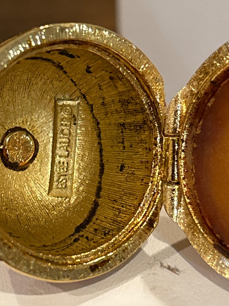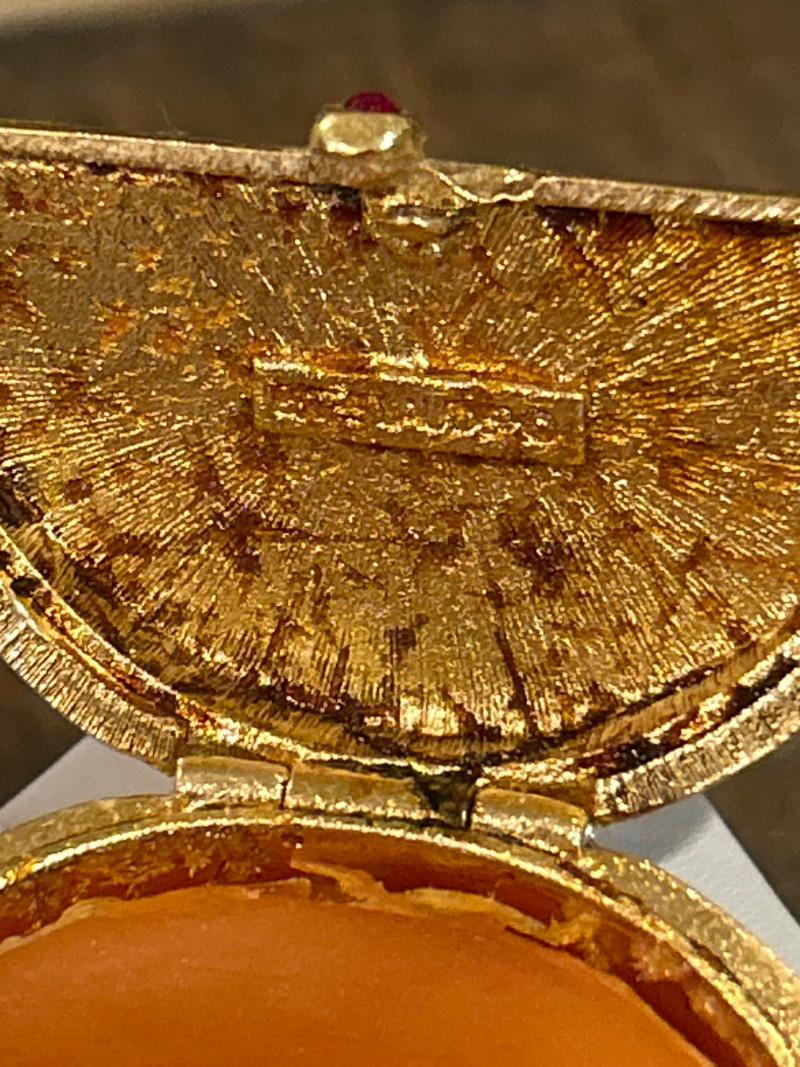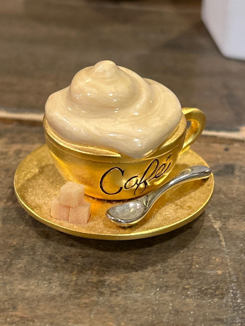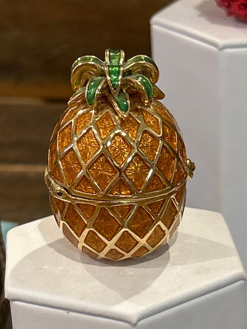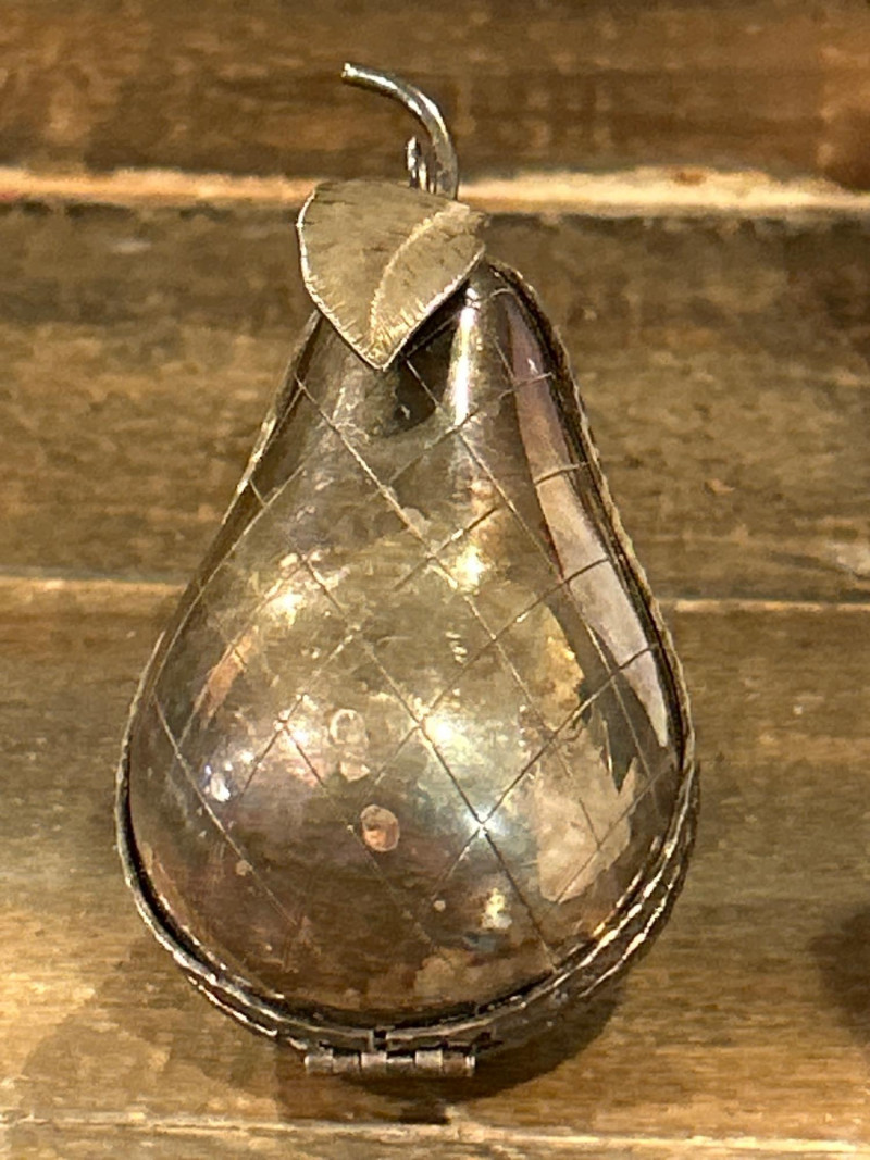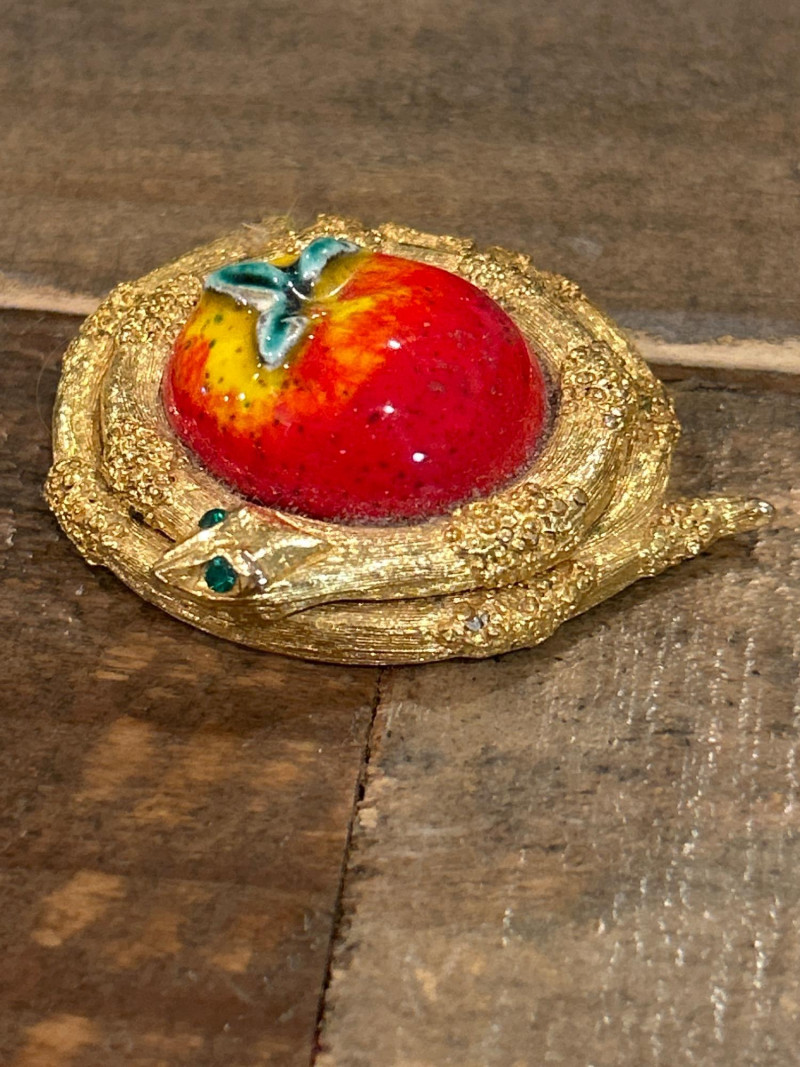 Including rare designs by Estée Lauder and Florenza, presented in fruit and café-themed forms. Most feature rich enamel finishes, gilt metalwork, and crystal accents, with several retaining traces of their original perfume contents. 2001 Estée Lauder “Glistening Red Cherry” Solid Perfume Compact Shimmering red enamel body with gold-tone stem and green enamel leaf Adorned with a single faceted crystal Marked “ESTÉE LAUDER 2001 BEAUTIFUL – Made in Canada Estée Lauder “Pineapple” Solid Perfume Compact Deep amber-gold enamel over lattice design with green enamel leaves and top crystal Marked “ESTÉE LAUDER KNOWING – Made in Canada Estée Lauder “Watermelon” Solid Perfume Compact Half-slice motif in red enamel with black seed details and gold-tone trim Retains traces of original perfume Estée Lauder “Café Cup” Solid Perfume Compact Enamel miniature cup and saucer with whipped topping, sugar cubes, and tiny spoon detail Scripted “Café” in black; opens to reveal perfume compartment Florenza “Strawberry” Enamel Trinket Pill Box Red enamel with green stem and raised gilt detailing Signed Florenza inside; measures approx. 1½ in. long Fuller Brush “Garden of Eden” Apple & Snake Solid Perfume Compact Pendant Gilt serpent coiled around a red and yellow enamel apple cabochon with turquoise flower accent Snake head set with green rhinestone eyes Chain mountable pendant style Silver-Tone Pear Compact Quilted silver-metal pear form with hinged lid and leaf finial Opens to reveal solid perfume residue inside Unmarked; likely mid-century novelty compact Estée Lauder’s solid perfume compacts are coveted for their artistry and limited production, while Florenza’s and Fuller Brush’s vintage designs add mid-century charm. This multi-maker assortment highlights the evolution of collectible vanity art—from gilt Hollywood Glamour to early 2000s Jay Strongwater–era opulence.Collecting Note: