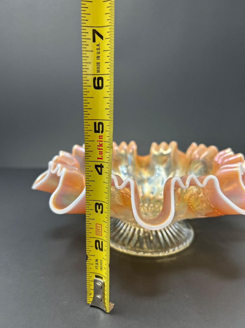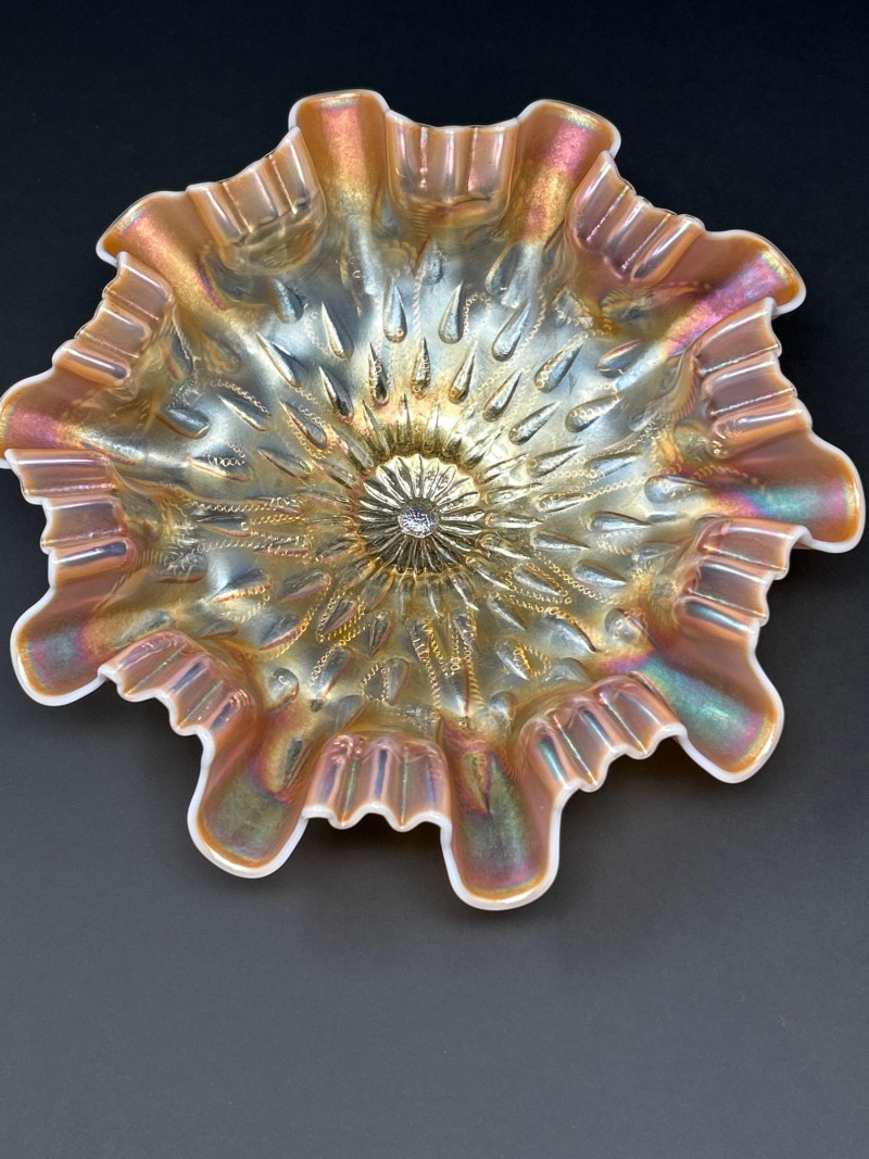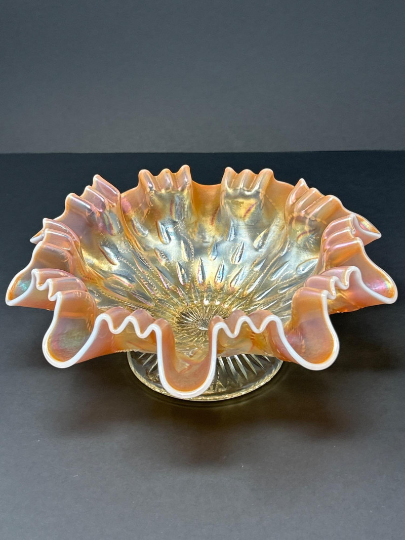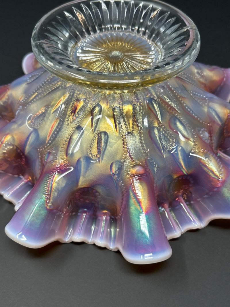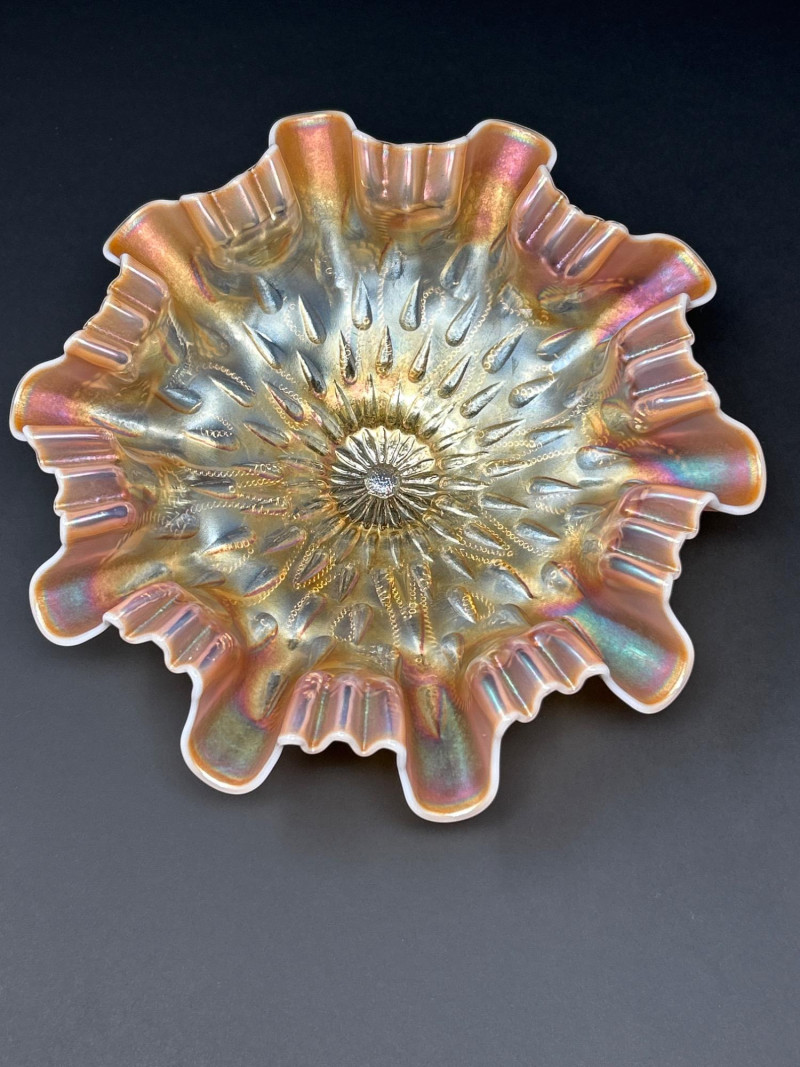 A scarce and visually captivating example of early 20th-century carnival glass, this pedestal compote bowl is attributed to Dugan Glass Co., known for its iridescent artistry and inventive forms. The bowl features a ruffled edge with ten distinct flutes, a radial “Raindrops” motif embossed from the center, and a peach opalescent finish that glows with golden, pink, and violet hues under light. Key Features: Maker: Attributed to Dugan Glass Co. (circa 1910s) Pattern: Raindrops variant with starburst and teardrop embossing Color: Peach opalescent with multicolor iridescence Form: Footed compote bowl with ruffled rim and fluted edge Base: Clear pedestal with vertical ribbing Dimensions: Approx. 10" diameter × 5" height Collector’s Note: