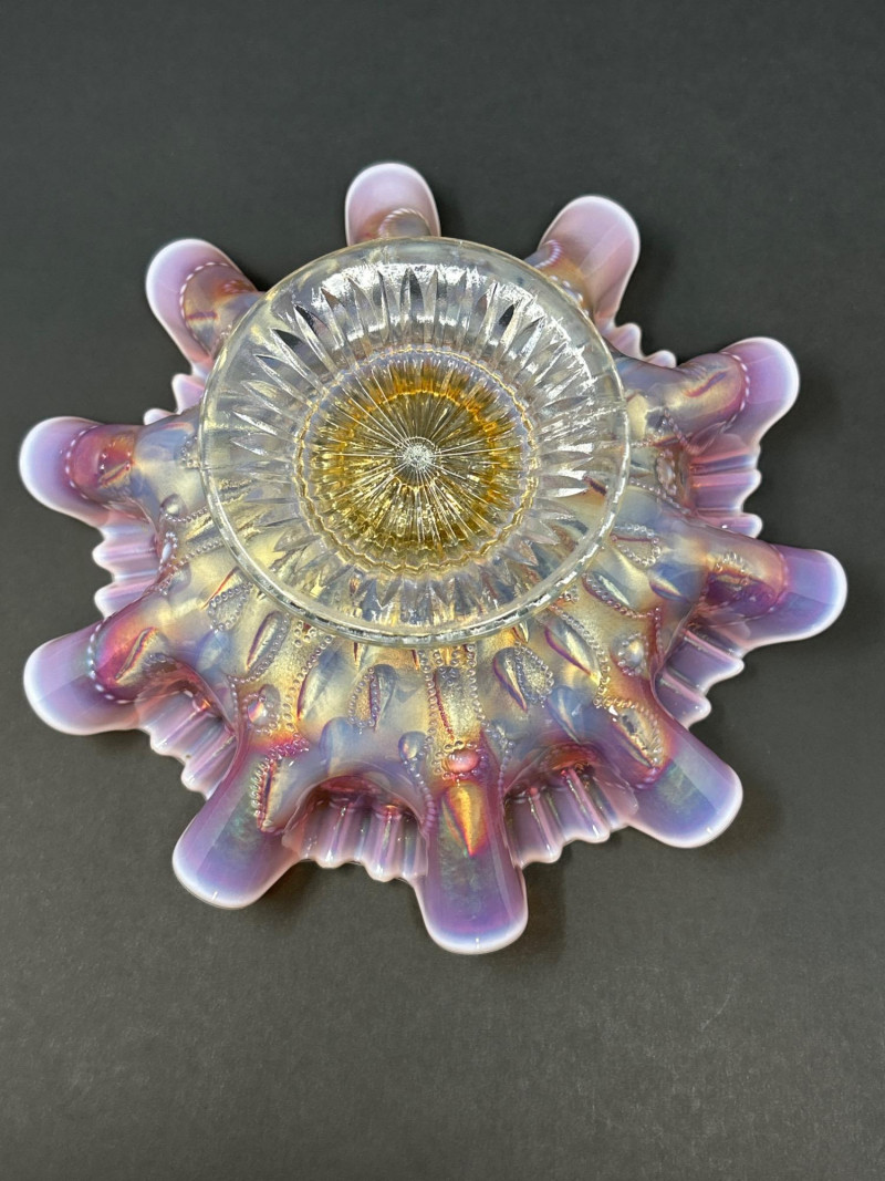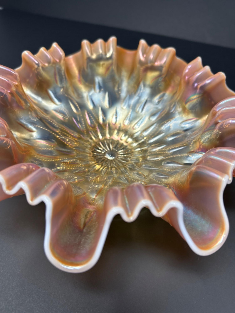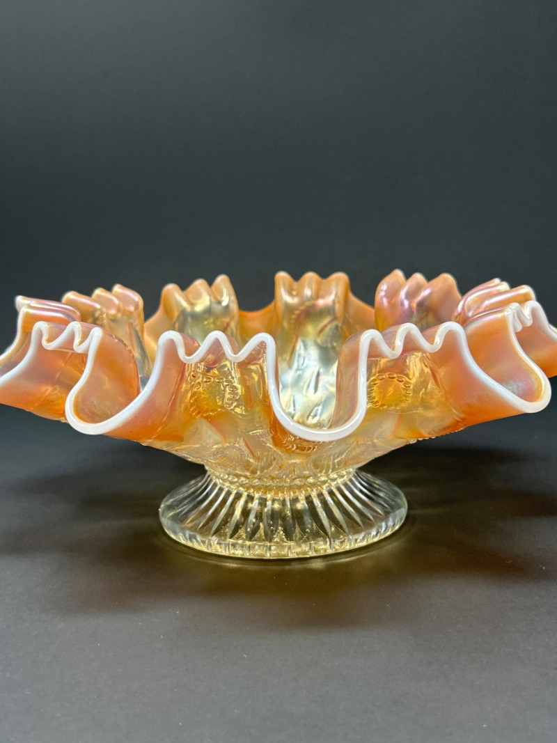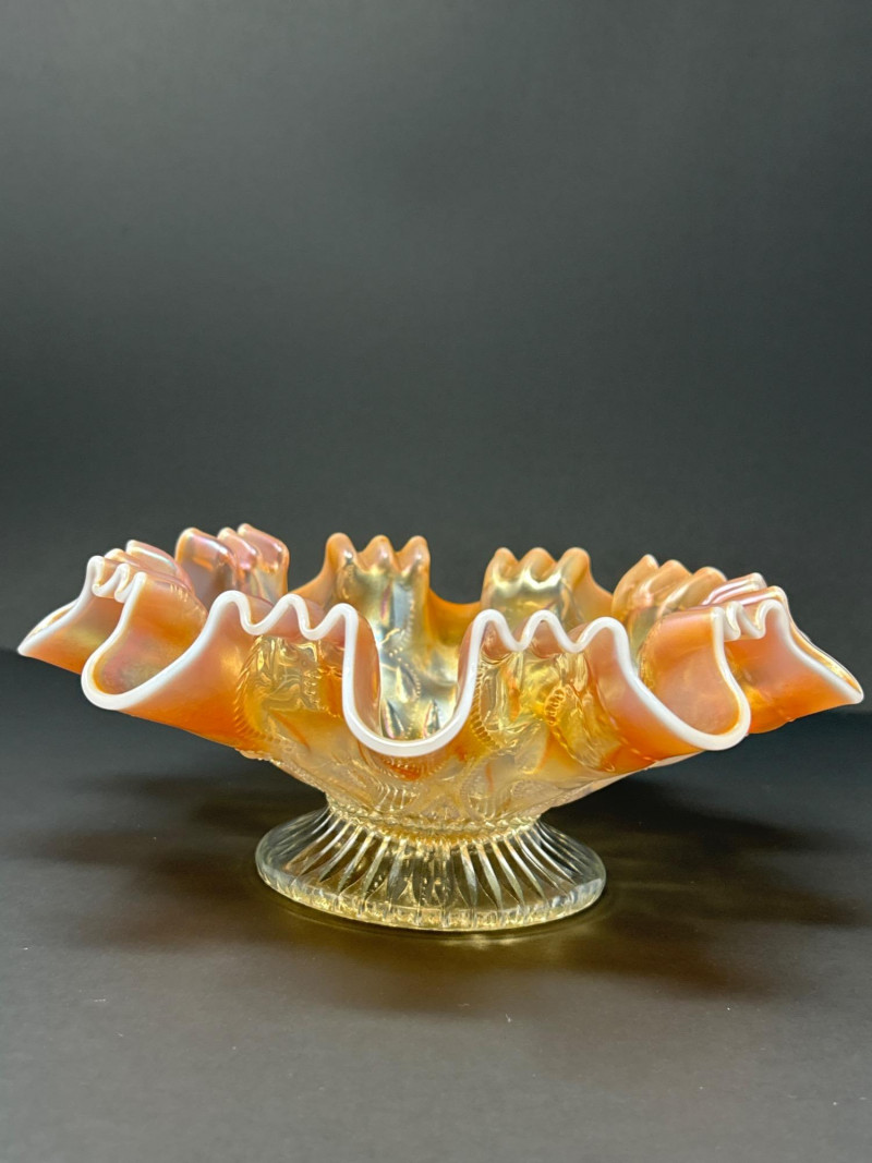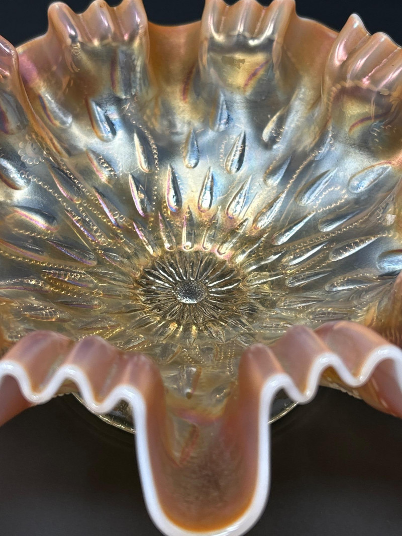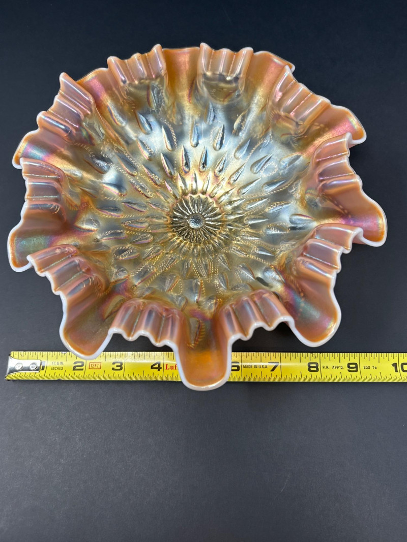 A scarce and visually captivating example of early 20th-century carnival glass, this pedestal compote bowl is attributed to Dugan Glass Co., known for its iridescent artistry and inventive forms. The bowl features a ruffled edge with ten distinct flutes, a radial “Raindrops” motif embossed from the center, and a peach opalescent finish that glows with golden, pink, and violet hues under light. Key Features: Maker: Attributed to Dugan Glass Co. (circa 1910s) Pattern: Raindrops variant with starburst and teardrop embossing Color: Peach opalescent with multicolor iridescence Form: Footed compote bowl with ruffled rim and fluted edge Base: Clear pedestal with vertical ribbing Dimensions: Approx. 10" diameter × 5" height Collector’s Note: