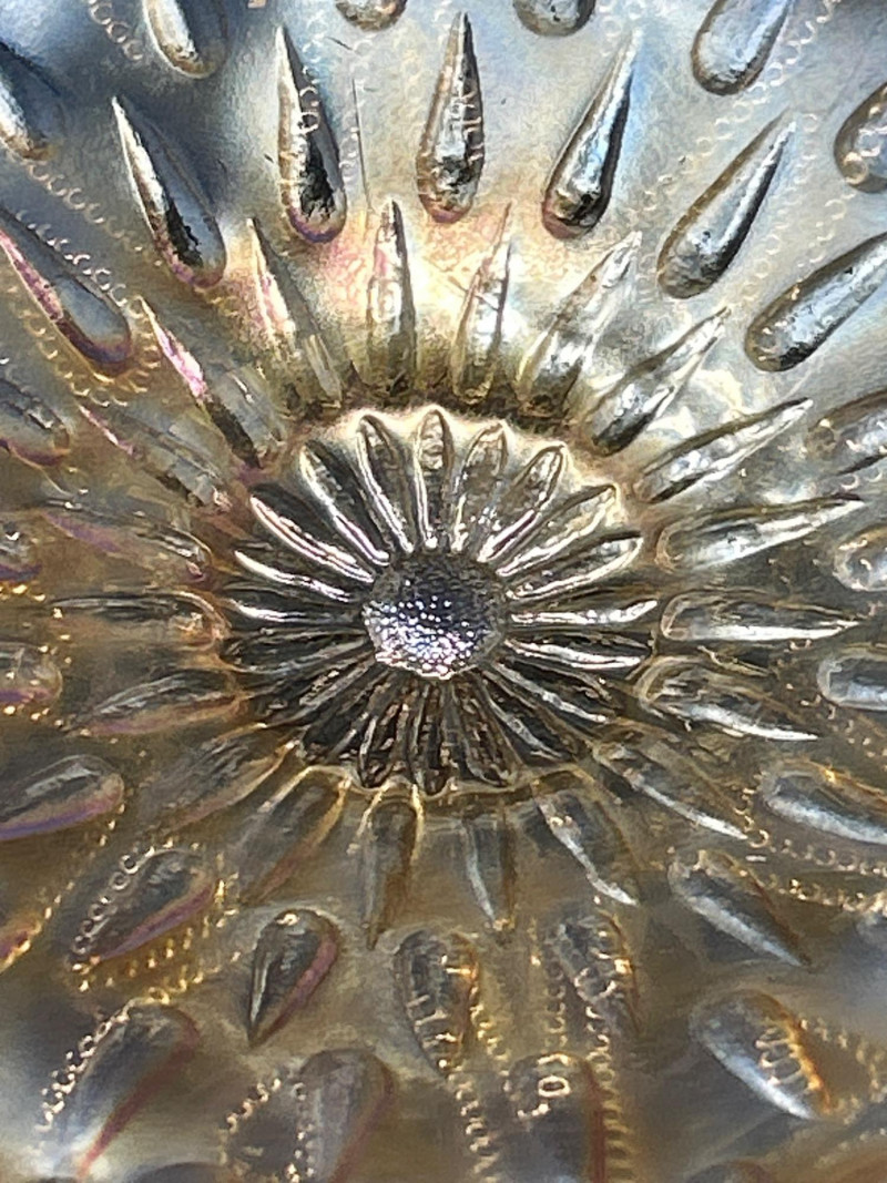 This form is considered less common than the flat bowl version of the Raindrops pattern, making it a desirable variant for collectors of Dugan and Northwood carnival glass. The pedestal base and elevated profile enhance its display value, whether as a centerpiece or part of a curated glass collection.