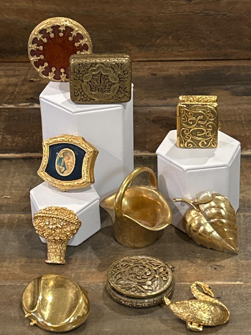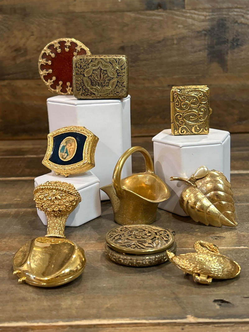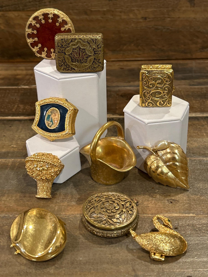An exceptional collection of ten gilt and enameled perfume compacts, figural solids, and vanity boxes spanning five decades of beauty design — from the Art Deco craftsmanship of the 1930s through Estee Lauder’s collectible glamour era of the 1970s–1980s.