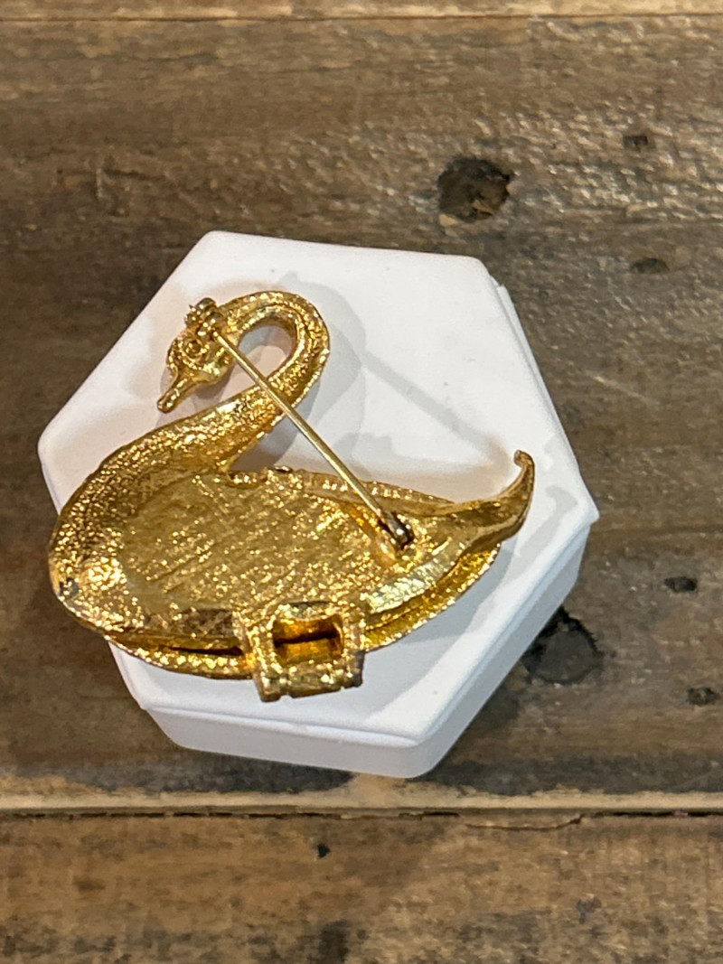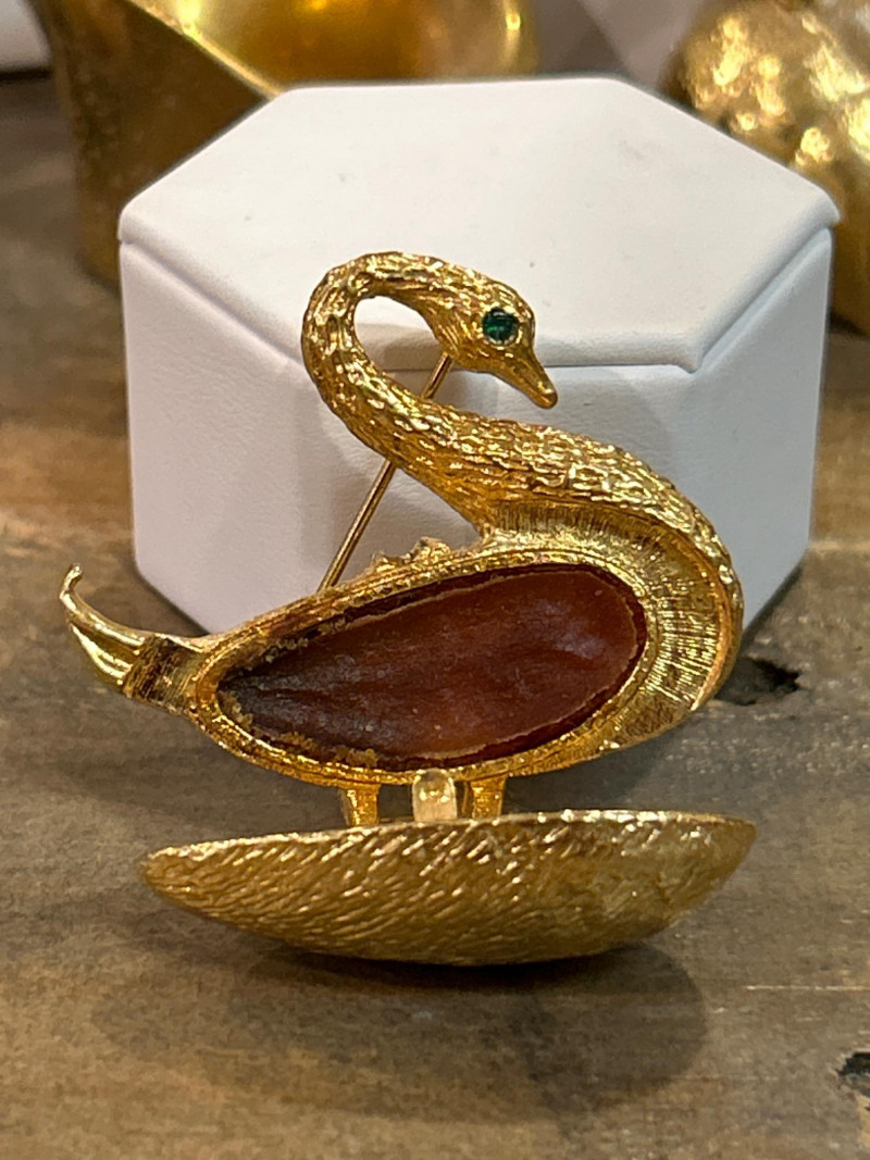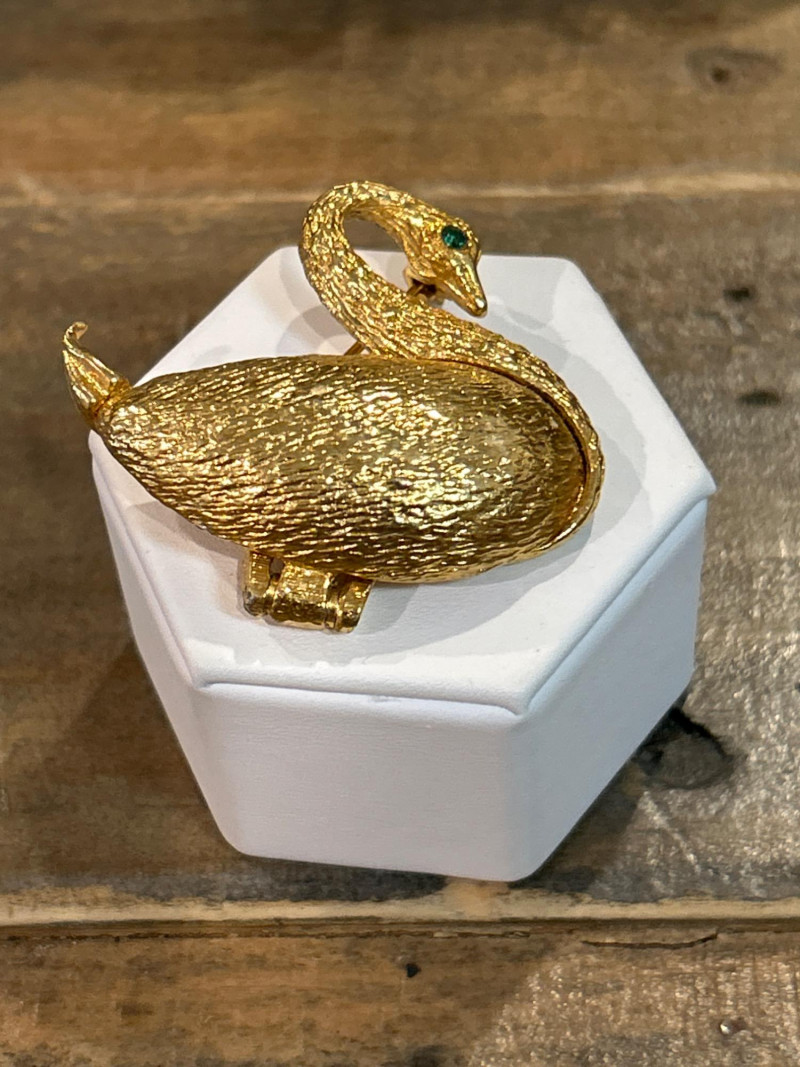 Design: Gilt swan with amber glass body and green rhinestone eye.