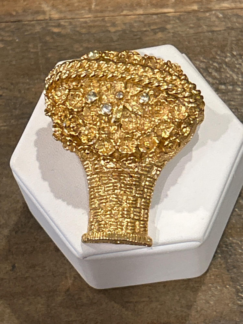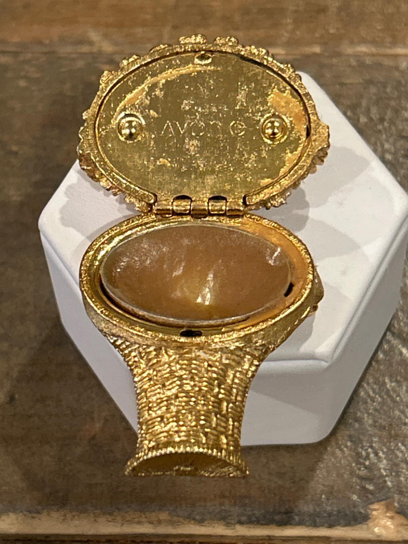 Collecting Note: Late-1980s solid compact from the Estee Lauder “Knowing” fragrance line — refined and sculptural. Avon “Basket of Flowers” Solid Perfume Compact