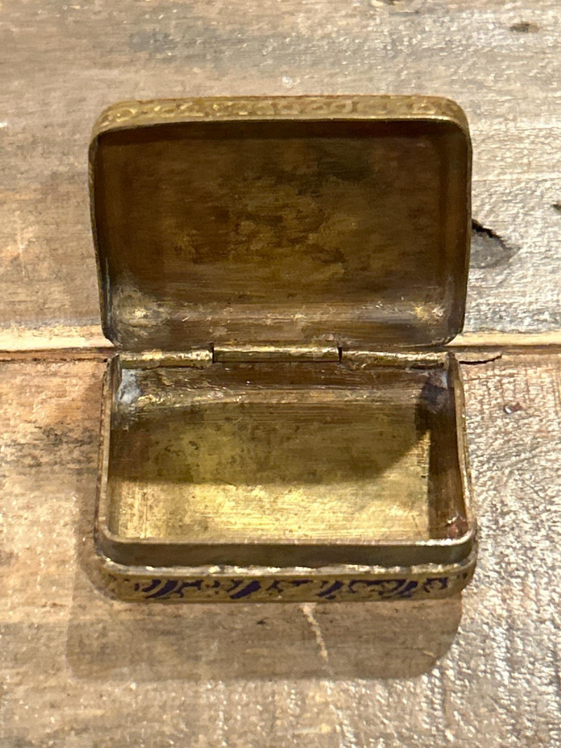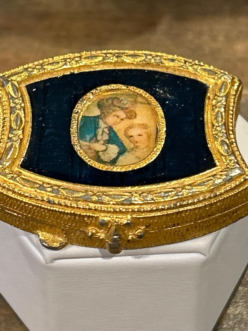 Design: Curved rectangular gilt compact with royal blue enamel and a Georgian-style couple portrait under glass.