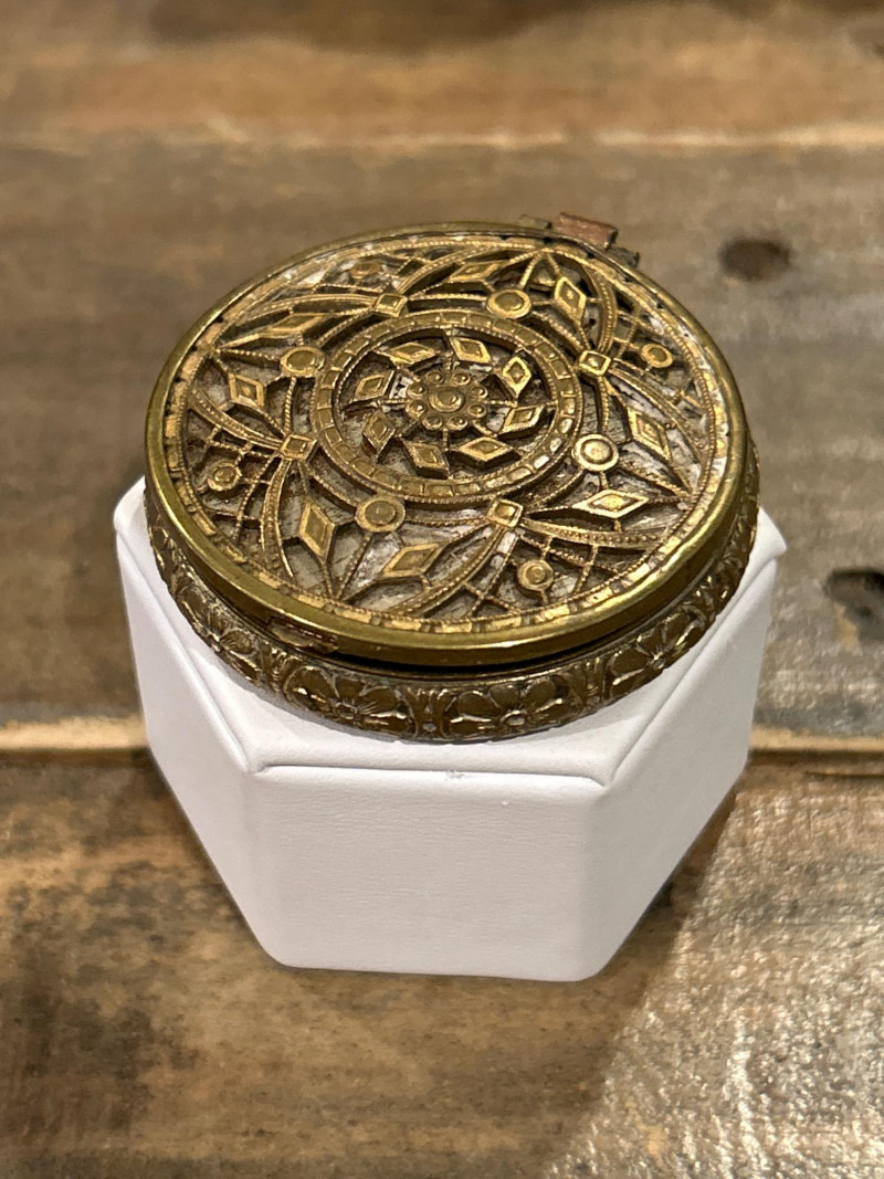 Design: Brass filigree lid with geometric floral medallion; mirrored base.